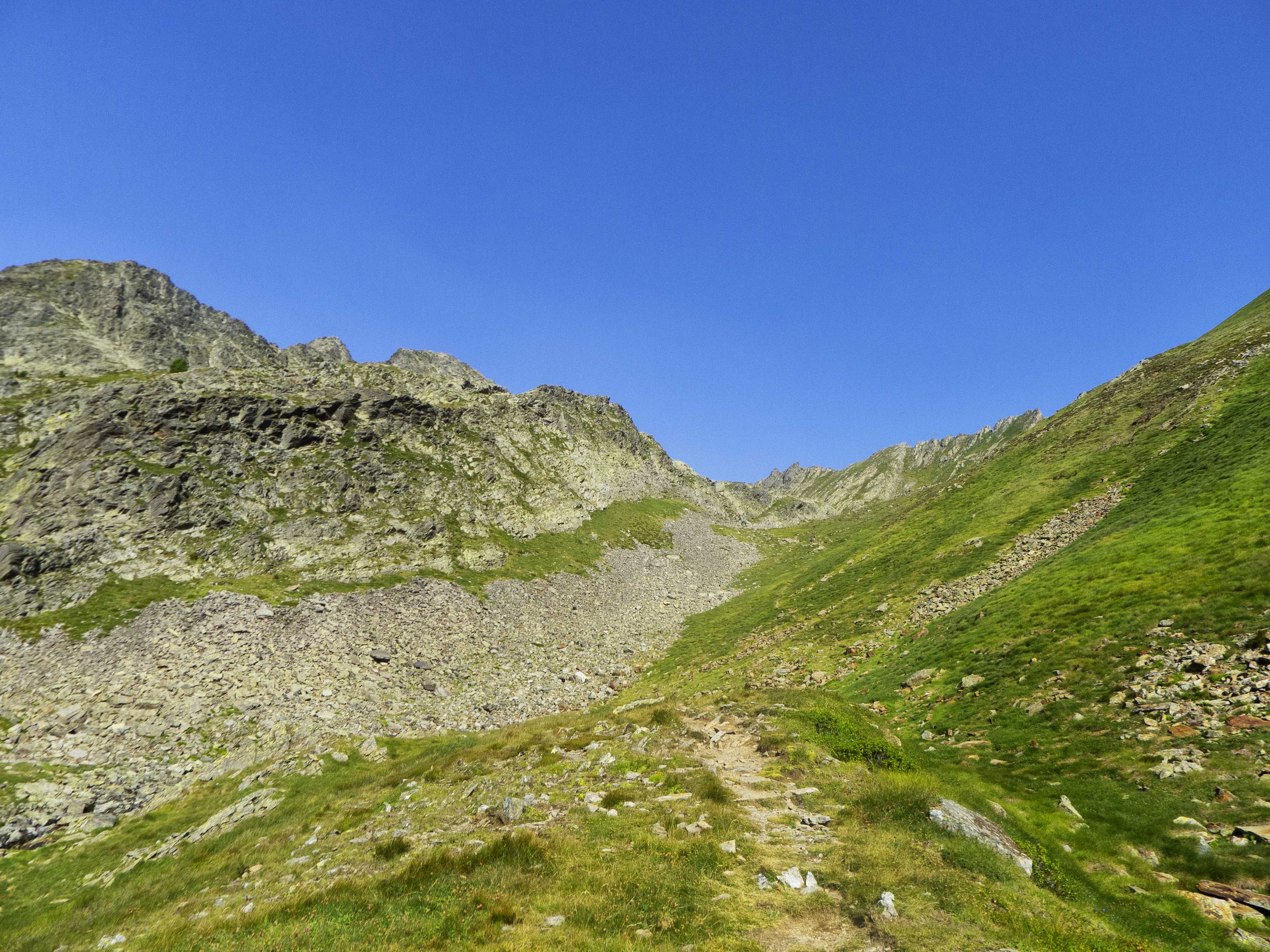 El sendero, tras cruzar el barranco, traza una gran diagonal hacia la derecha para esquivar el muro que defiende el fondo del circo. Tras ascender unos cien metros y llegar bajo las paredes del pico de la Montañeta, el sendero vuelve a girar, yendo ahora en dirección a la cubeta del ibón y a los Picos de Estauas, separados del colorido Malh Pintrat por la brecha del Puerto Viello.