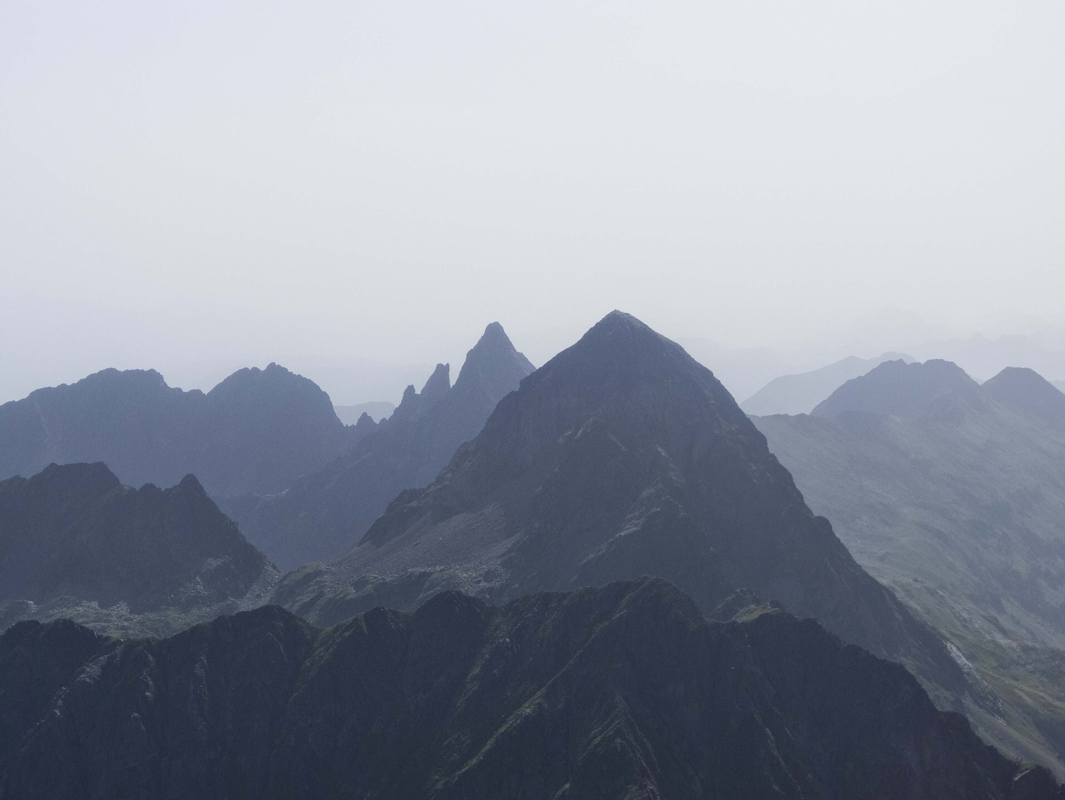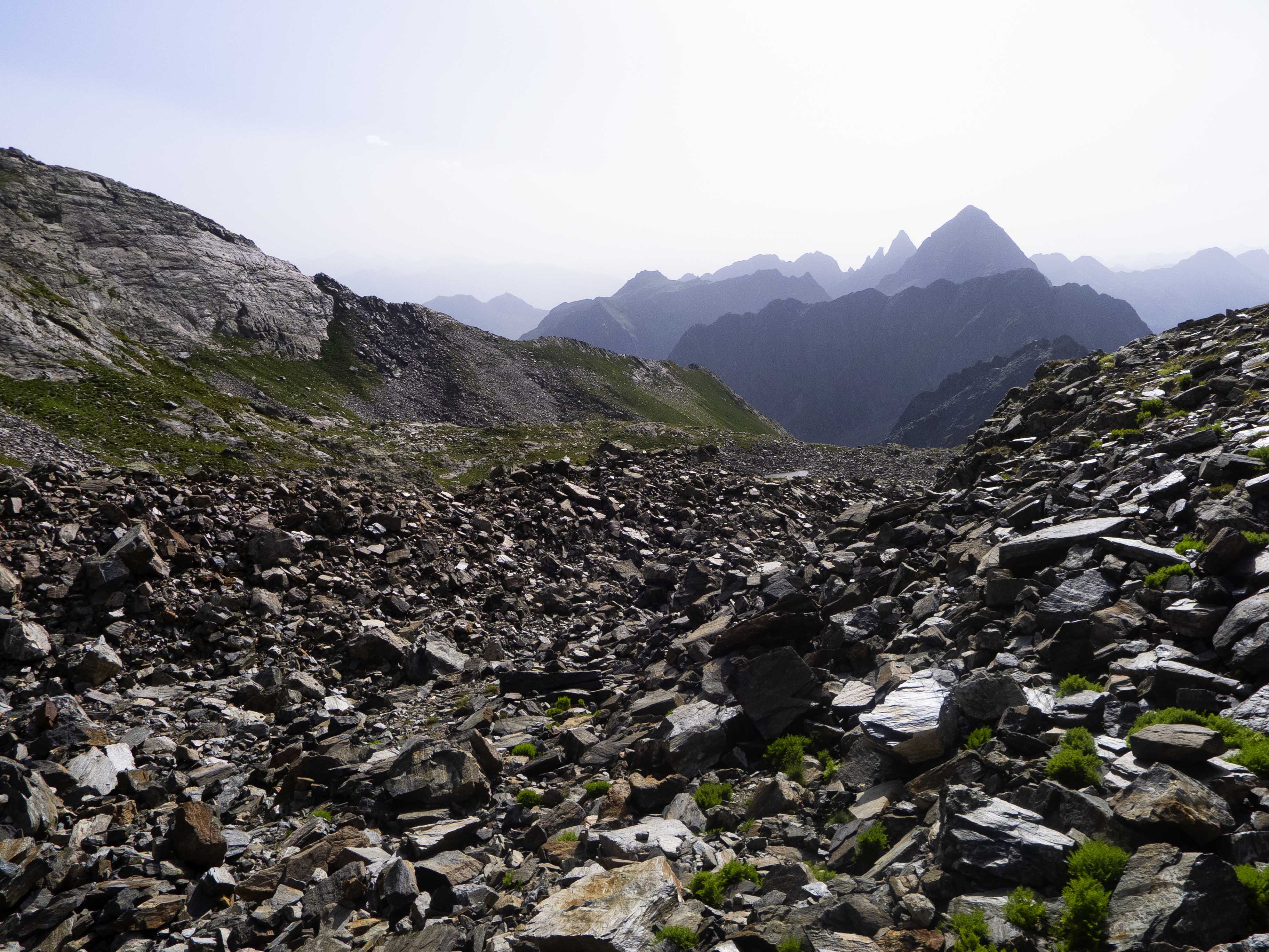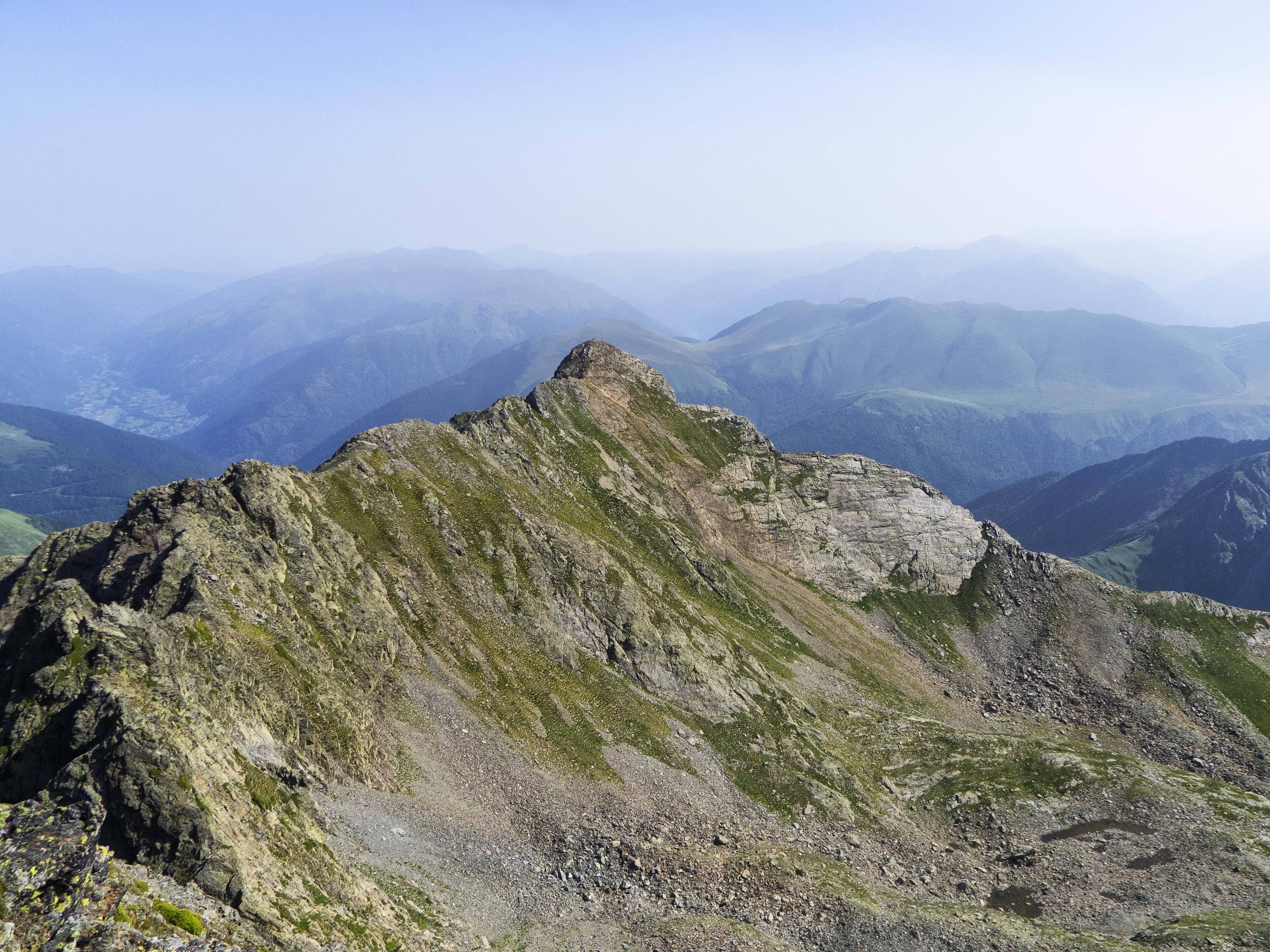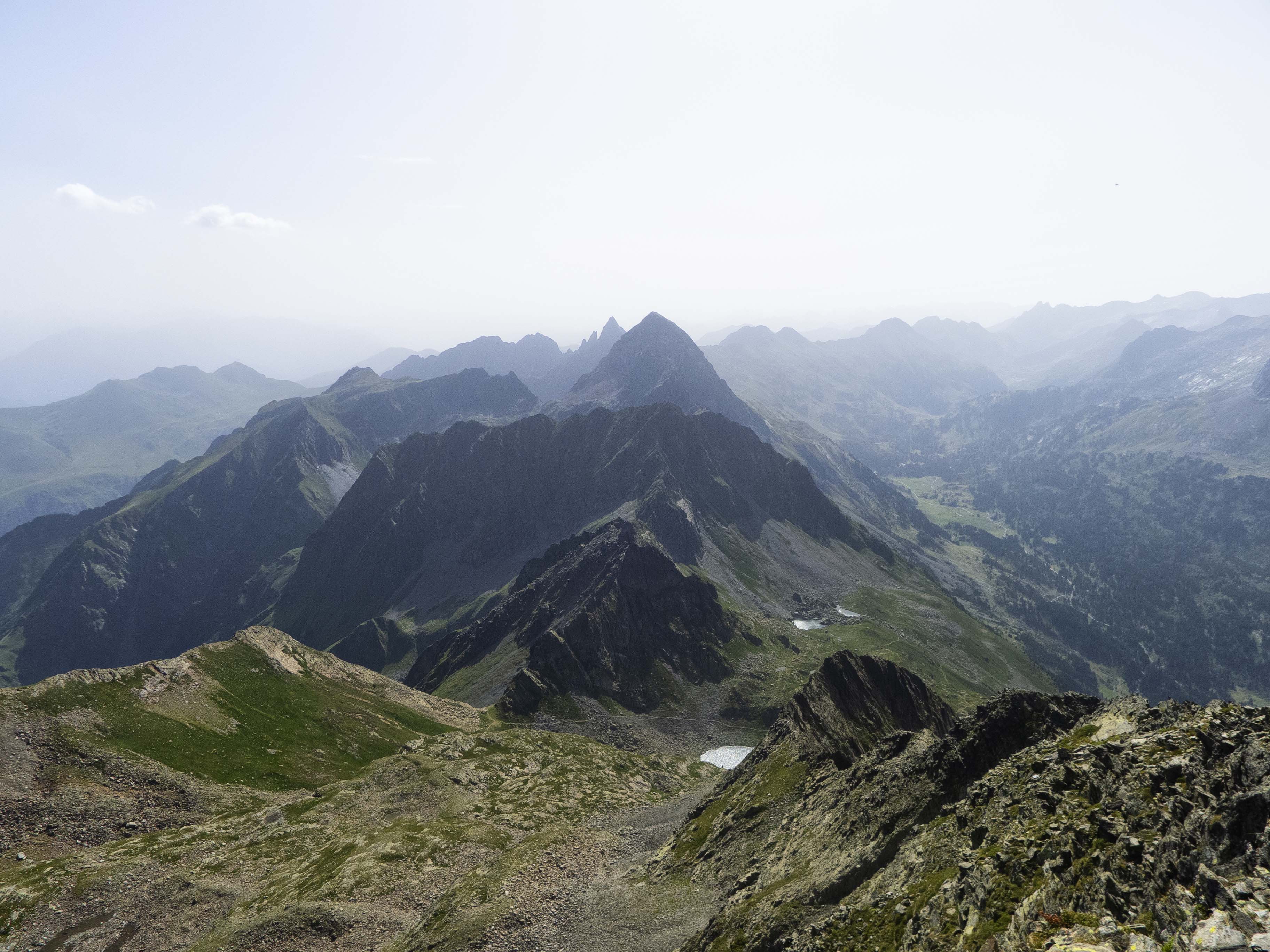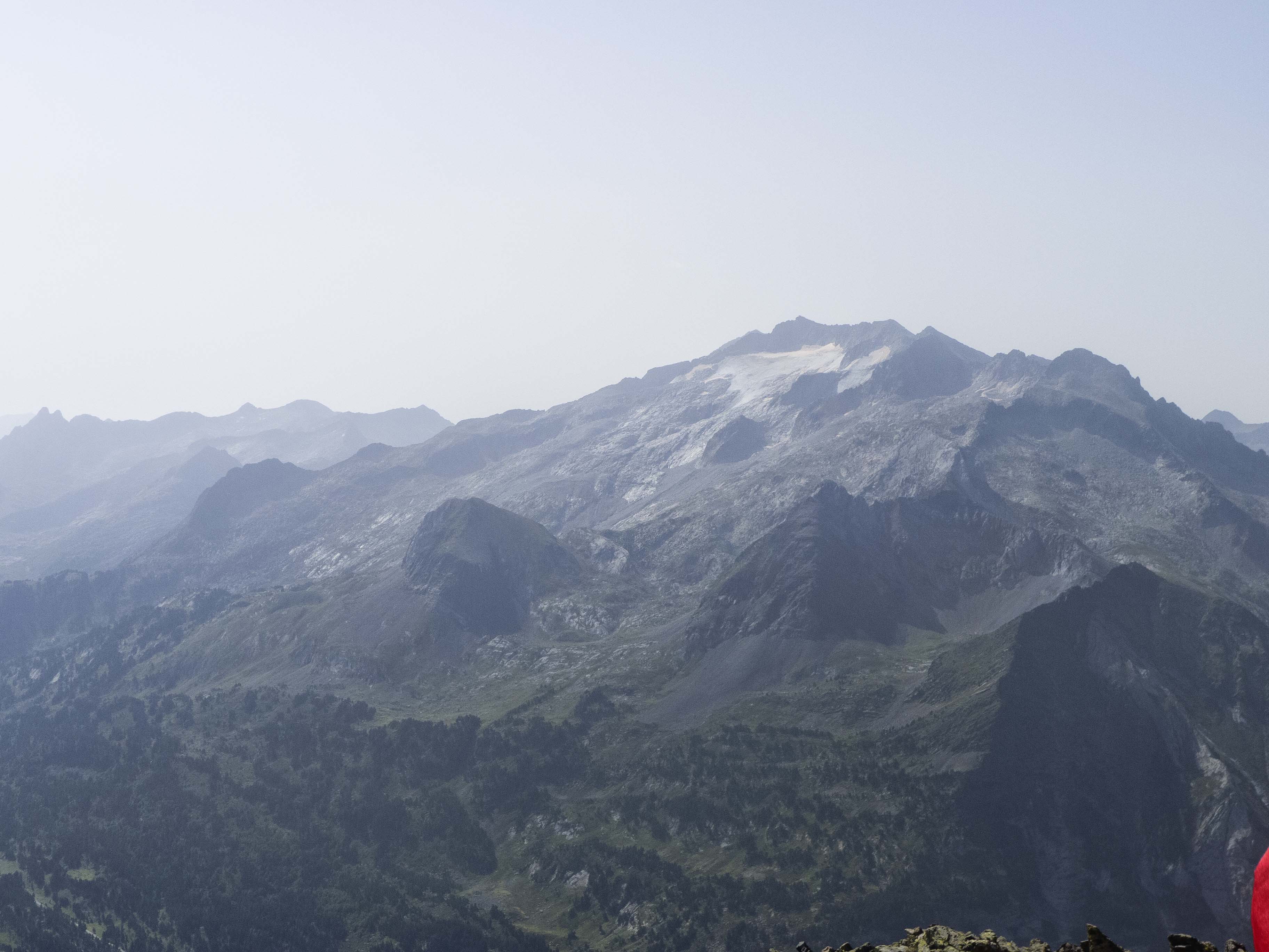 Tras las paredes del Pic de la Glera y de la Montañeta, la divisoria sigue hacia el este, con el horizonte completamente emborronado debido a la intensa calima provocada por una potente nube de polvo sahariano.