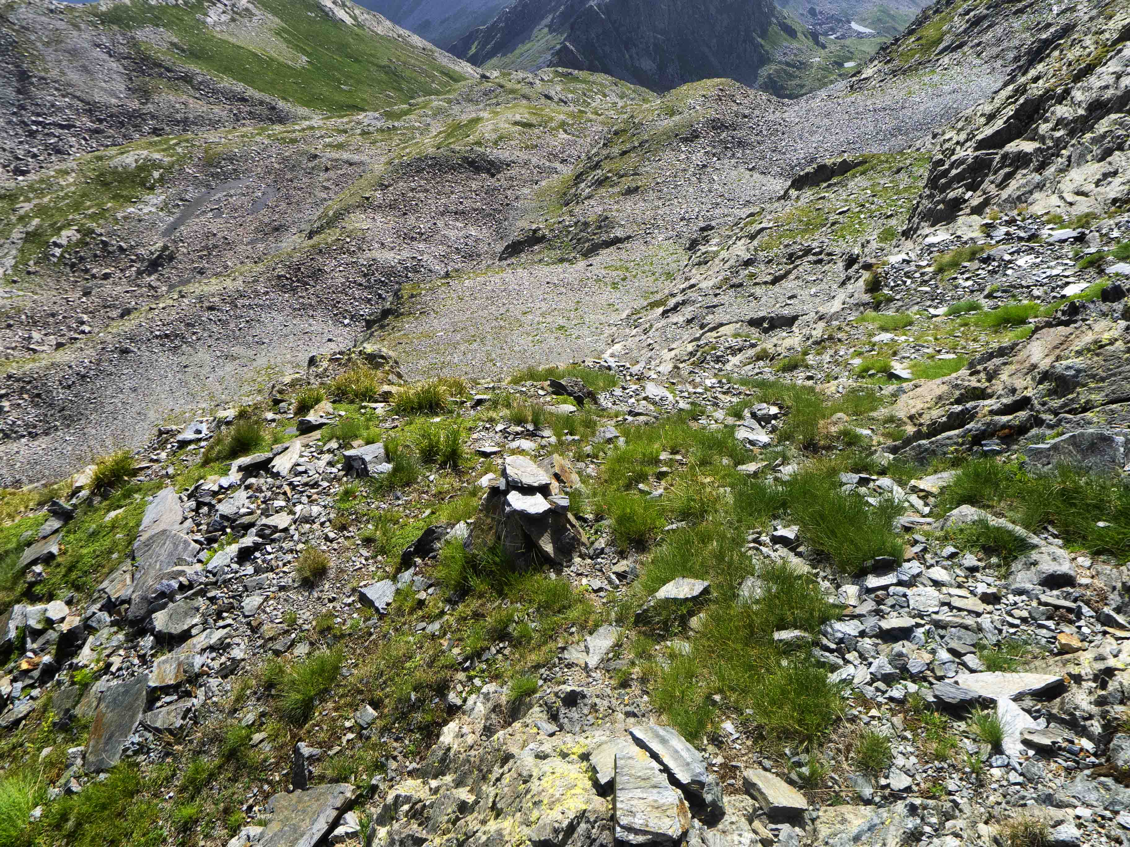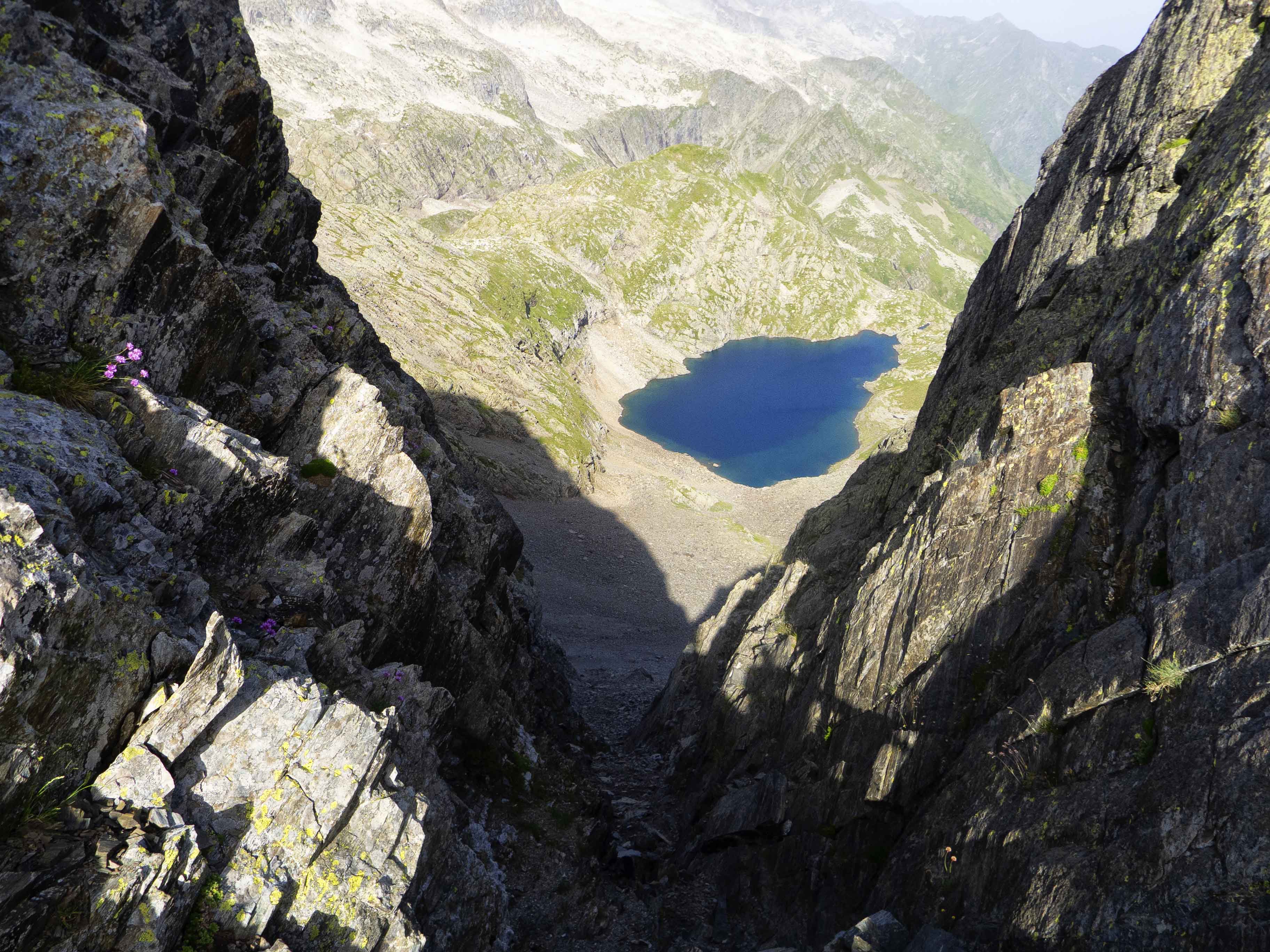 Desde la brecha, una sombría canal baja hasta el Lac Celinda.