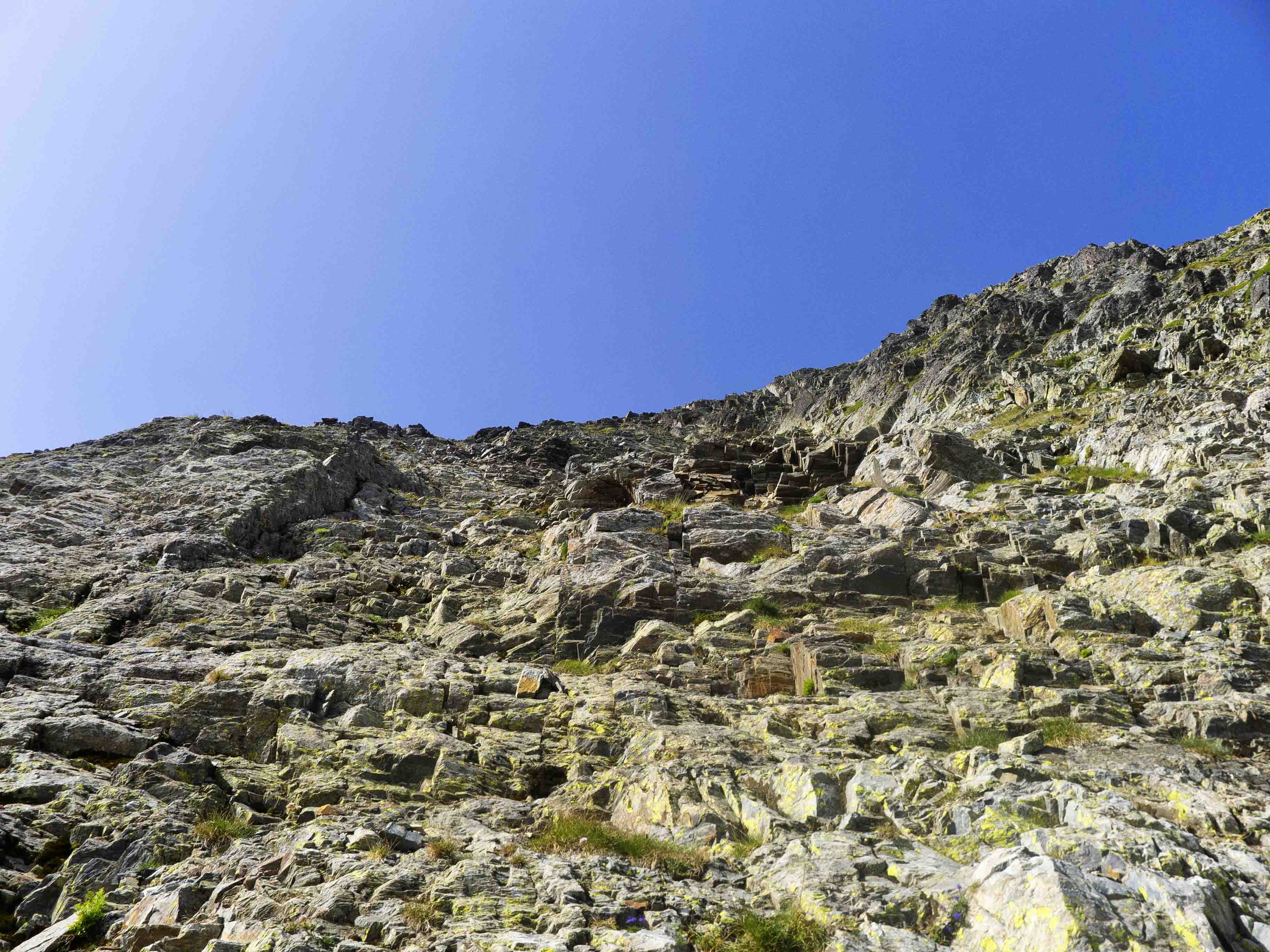 Desde la parte inferior, la pared que debemos trepar pinta de esta manera. No es completamente vertical y no tiene pasos de mucha dificultad, como mucho unos cuantos de segundo grado. Sin embargo, el problema es de la gran cantidad de piedra suelta que hay por toda la pared y que da mucha inseguridad a la hora de trepar.