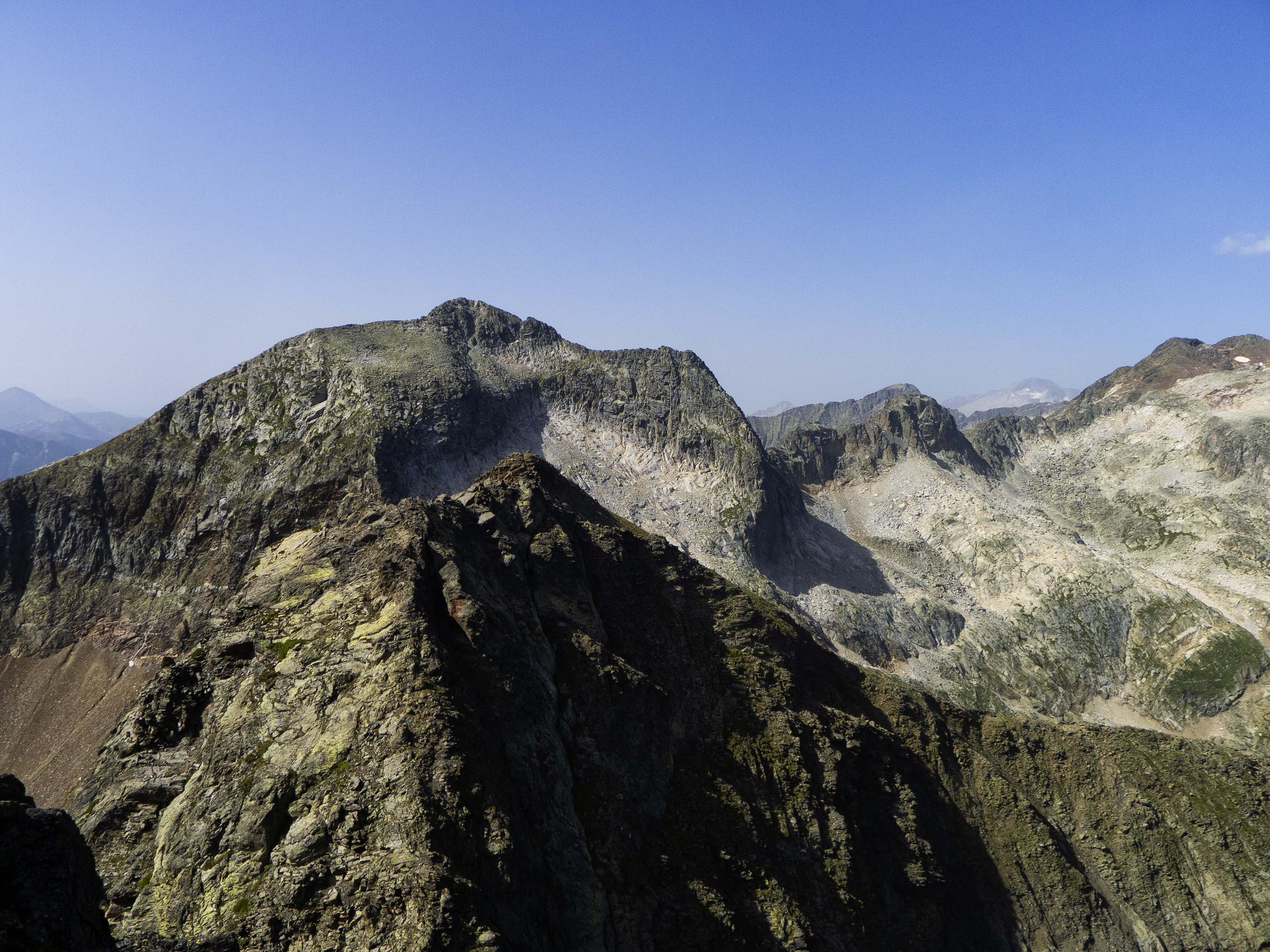 La portentosa aguja del Pic Central d'Estauas, entre el Malh Pintrat y el Malh Plane, poco antes de la cumbre. Desde aquí se ve bien la tremenda brecha que nos separa de esta difícil cumbre, sin duda una de las más complicadas y menos ascendidas del valle de Benasque.