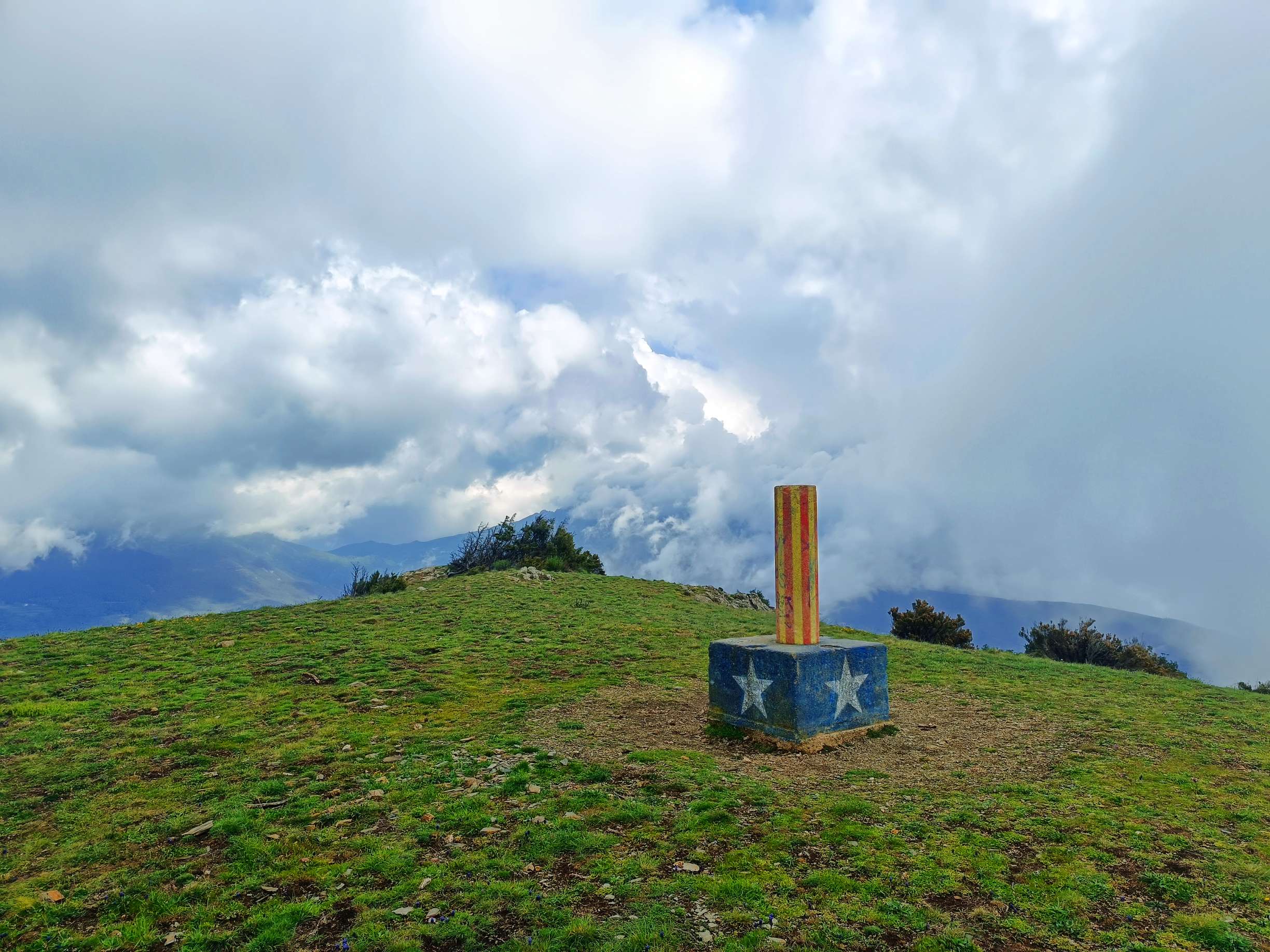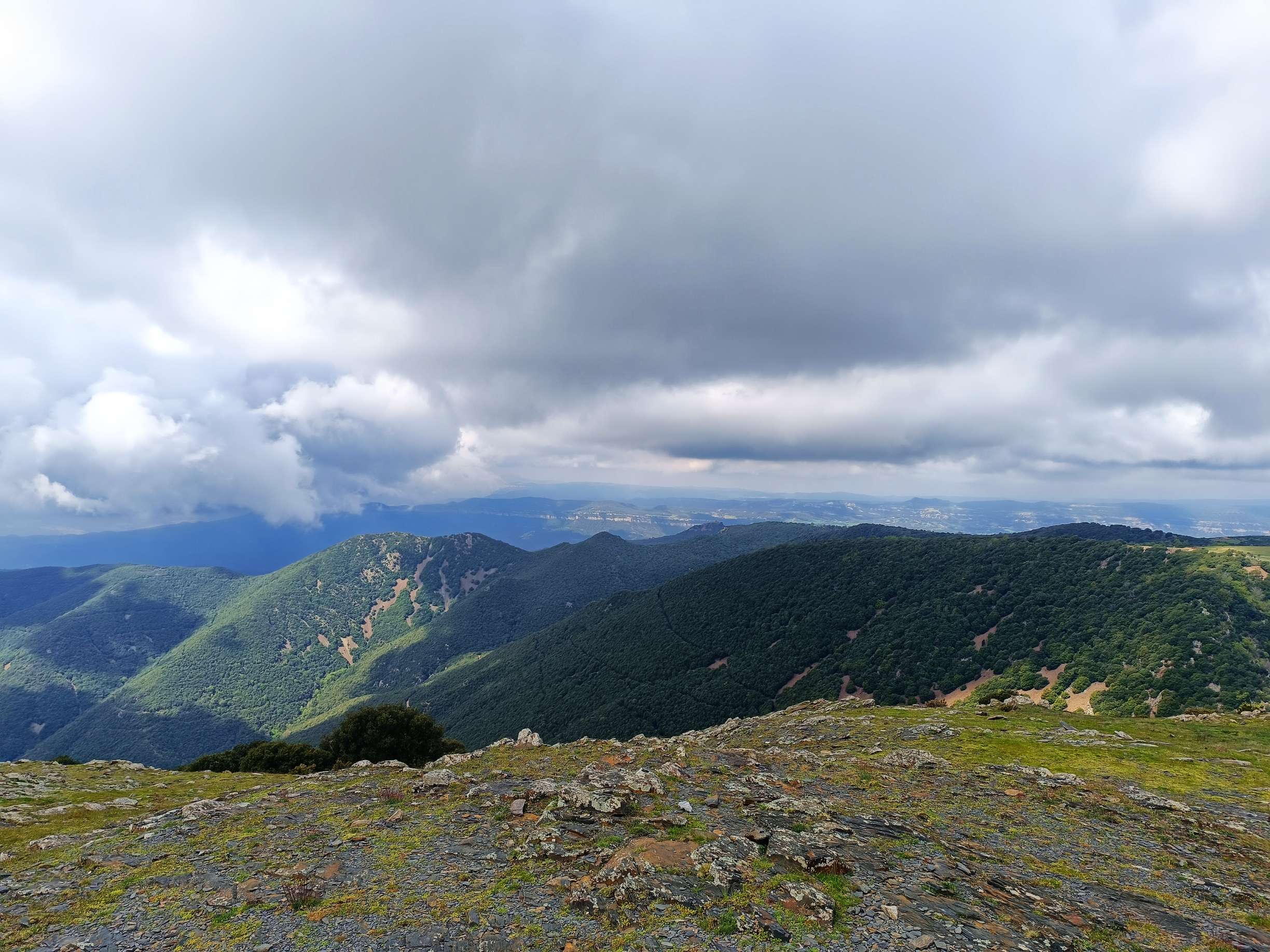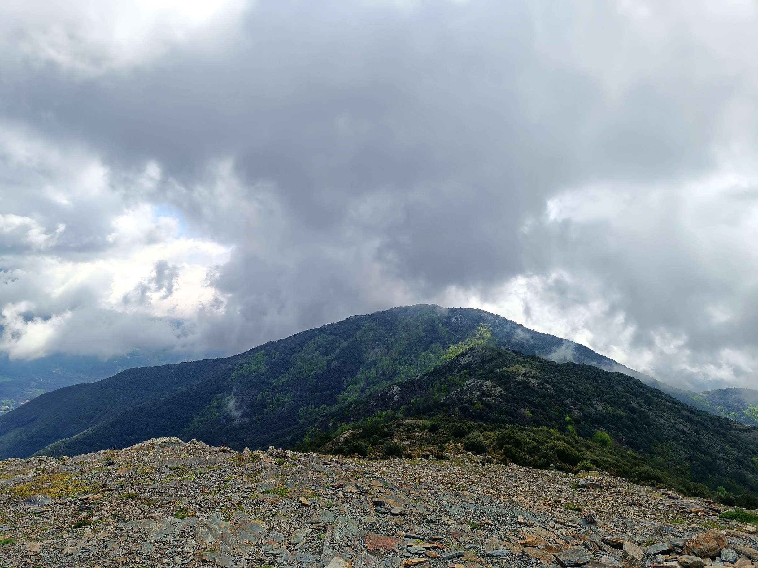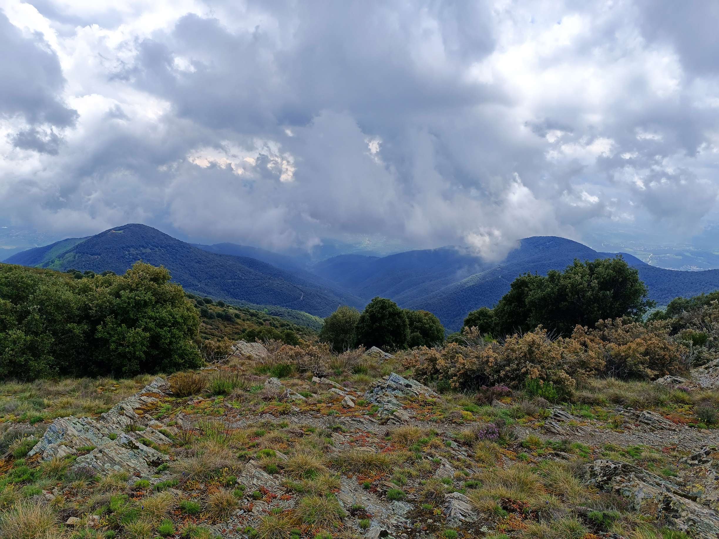 La tormenta nos sorprende en lo alto del Pi Novell pero, afortunadamente, no resulta tan intensa como temíamos y nos roza sin alcanzarnos de lleno. Desde aquí se aprecia lo que queda hasta llegar a la cumbre, primero un descenso al Coll del Pi Novell y, después, una última subida de casi 100 metros de desnivel.