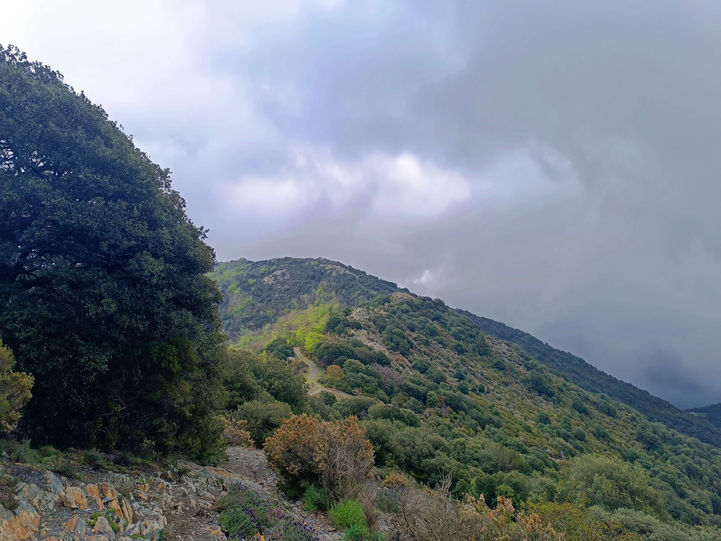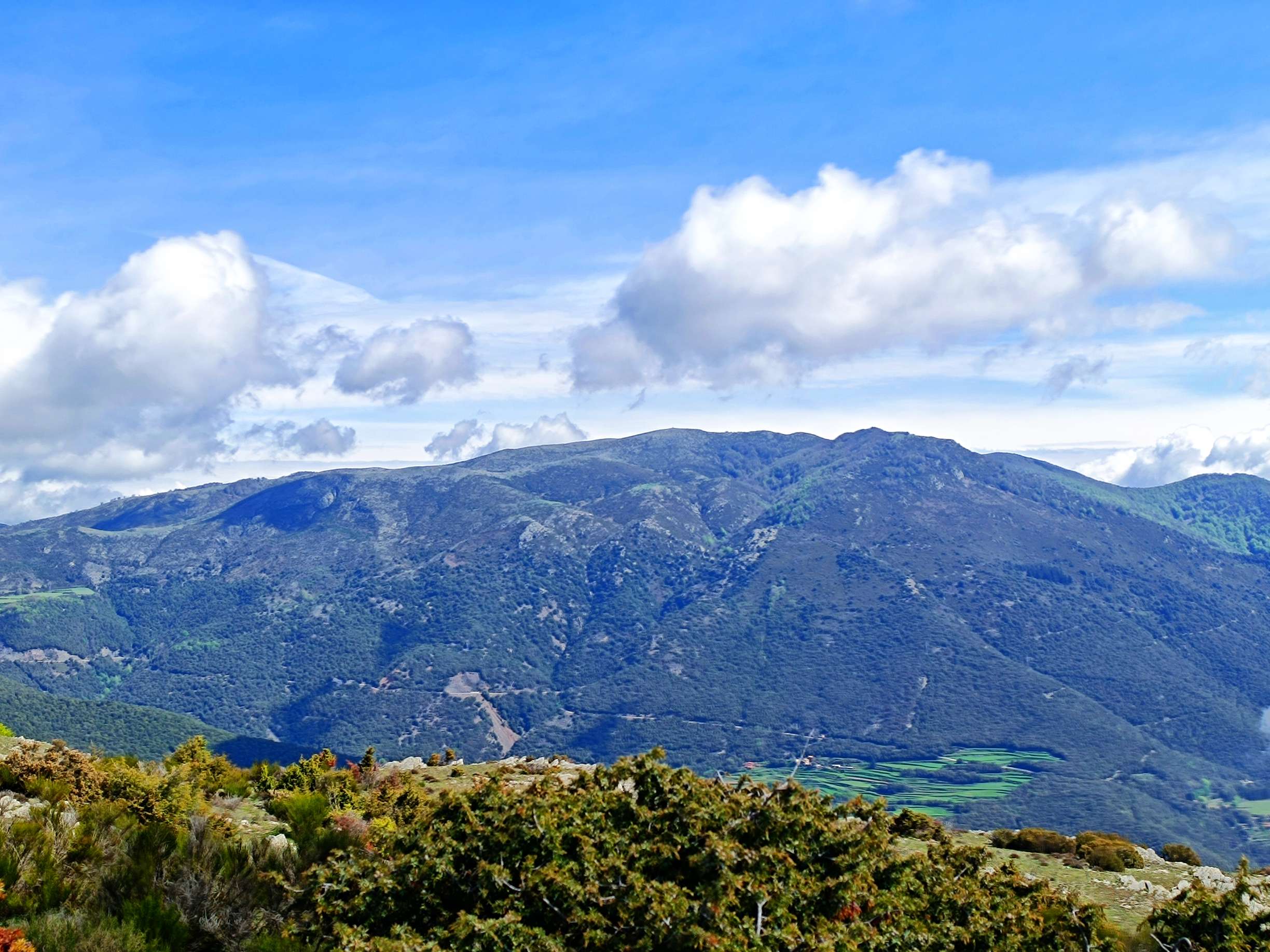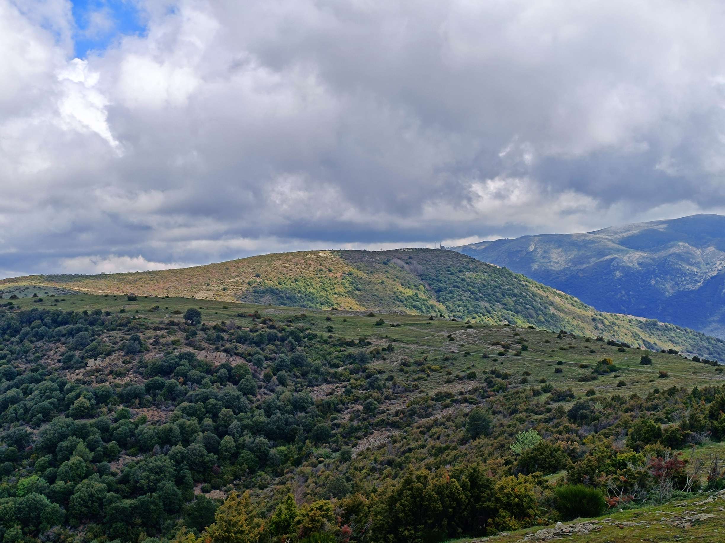 La tormenta nos sorprende en lo alto del Pi Novell pero, afortunadamente, no resulta tan intensa como temíamos y nos roza sin alcanzarnos de lleno. Desde aquí se aprecia lo que queda hasta llegar a la cumbre, primero un descenso al Coll del Pi Novell y, después, una última subida de casi 100 metros de desnivel.