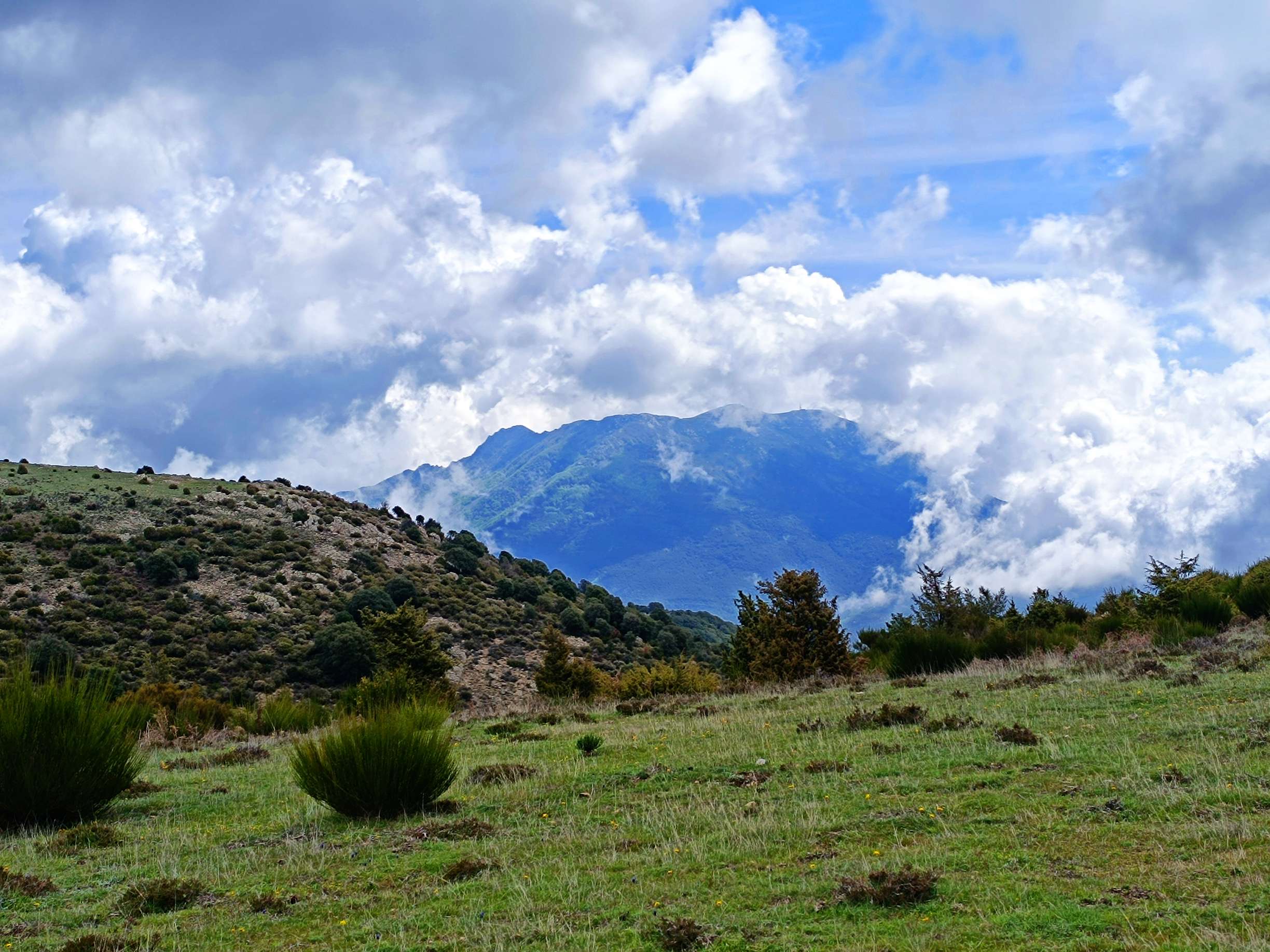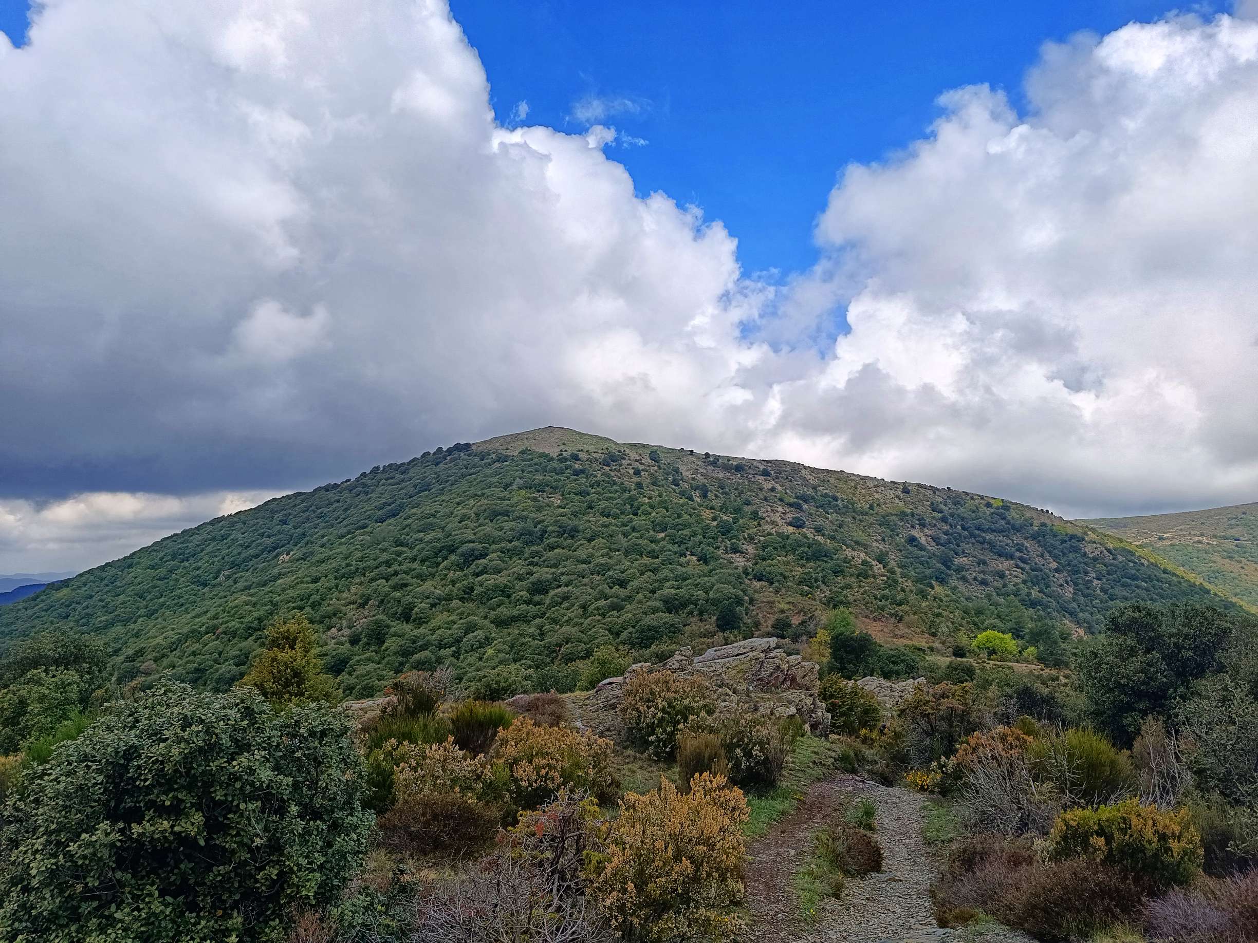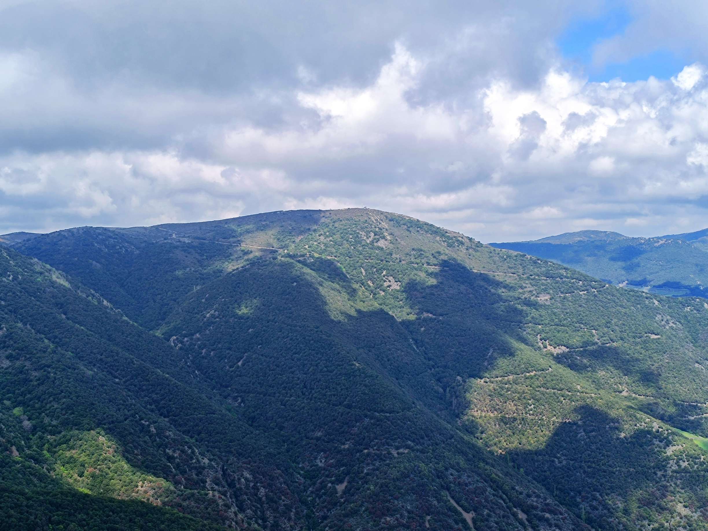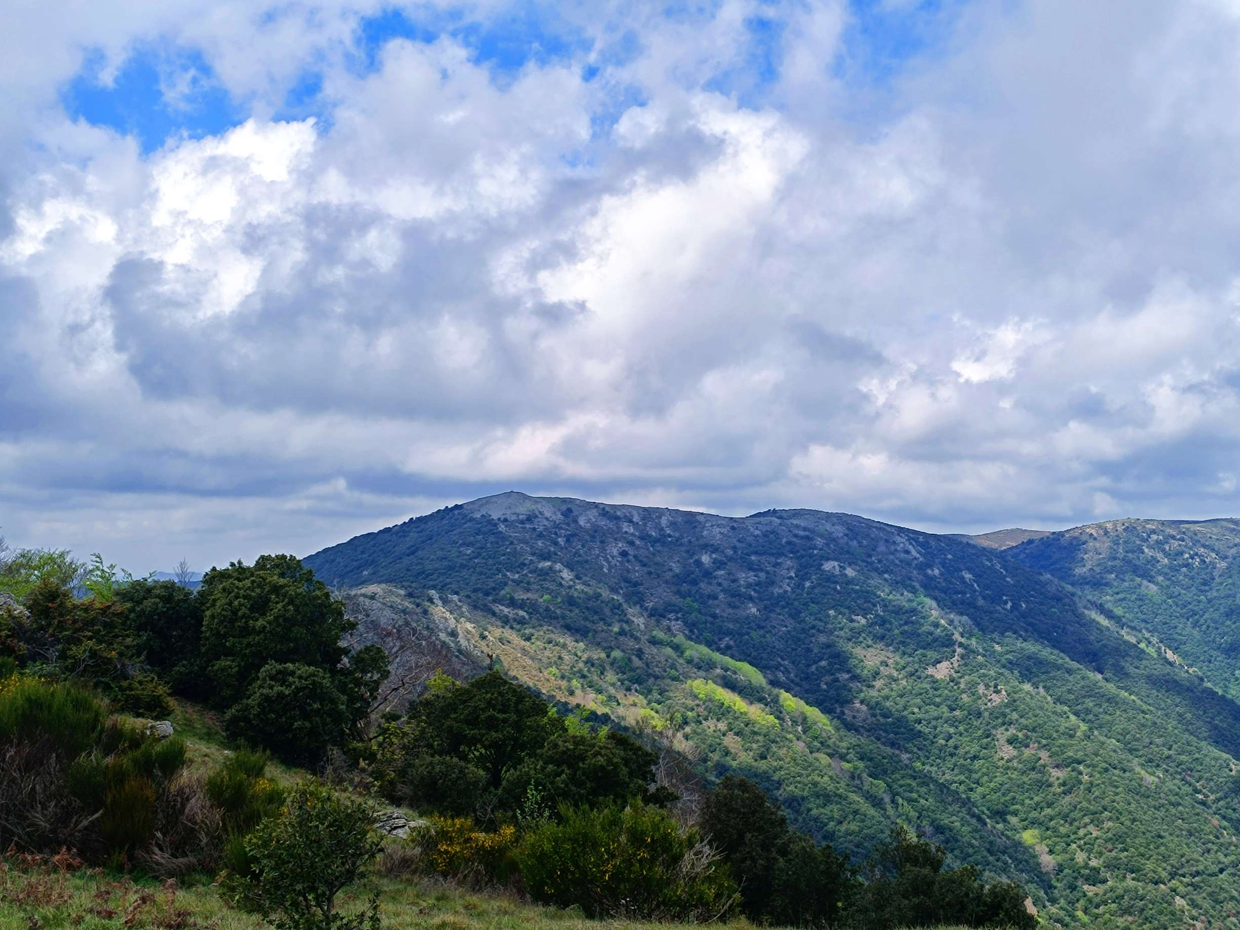 La tormenta nos sorprende en lo alto del Pi Novell pero, afortunadamente, no resulta tan intensa como temíamos y nos roza sin alcanzarnos de lleno. Desde aquí se aprecia lo que queda hasta llegar a la cumbre, primero un descenso al Coll del Pi Novell y, después, una última subida de casi 100 metros de desnivel.