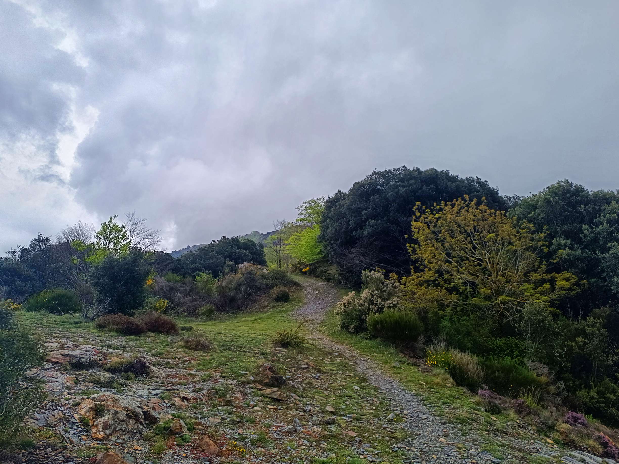 Al superar los 1100 metros, el bosque desaparece y entramos en una larga diagonal rodeada del matorral que cubre la parte alta del Montseny.
