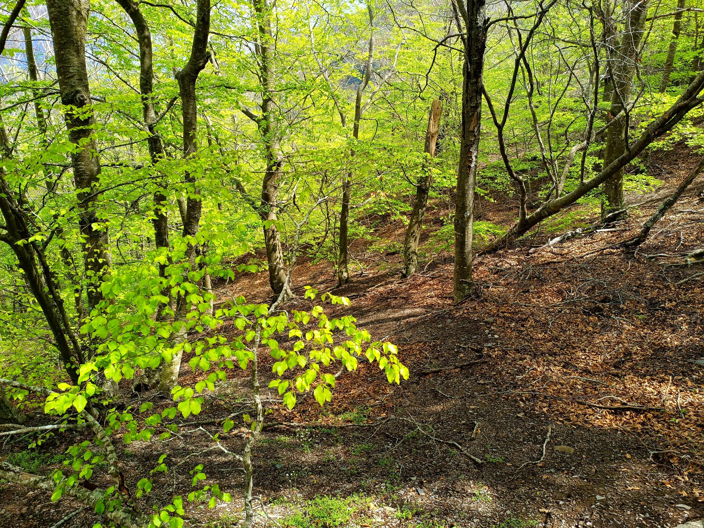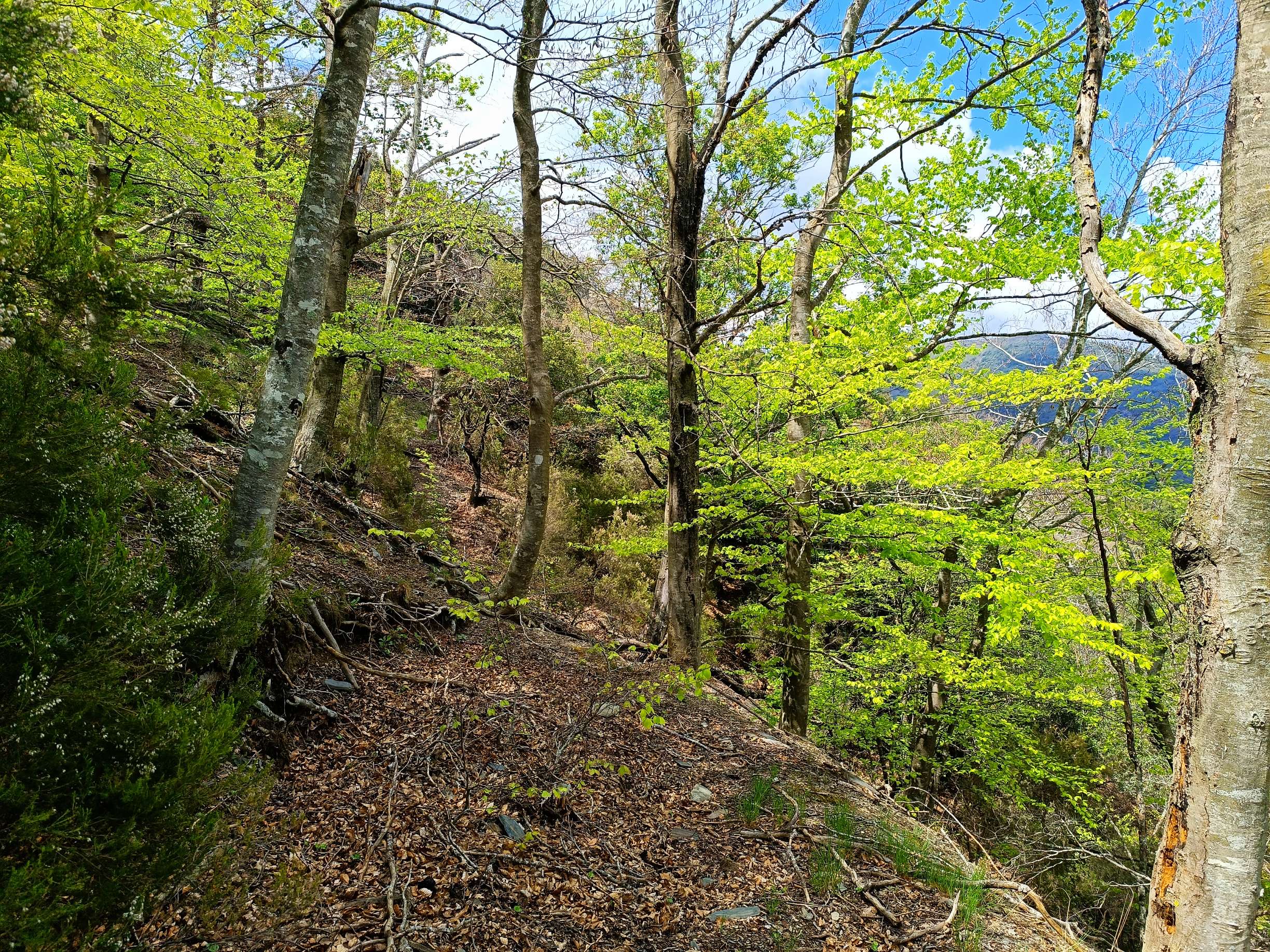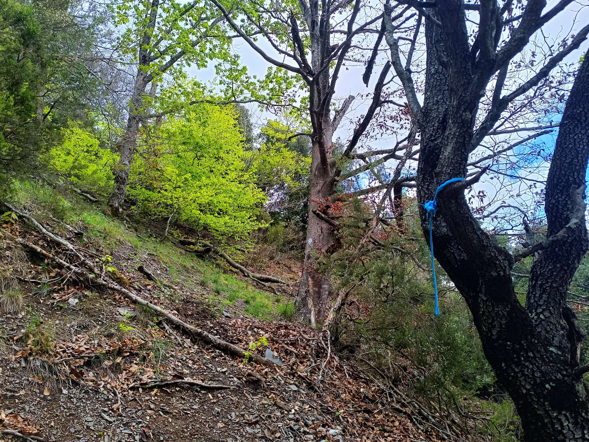 Al abandonar el hayedo, el bosque se empieza a ensuciar y resulta más difícil escoger el mejor paso. En este punto, seguir las marcas (incluso llegamos a toparnos con una cuerda azul) es aún más importante.