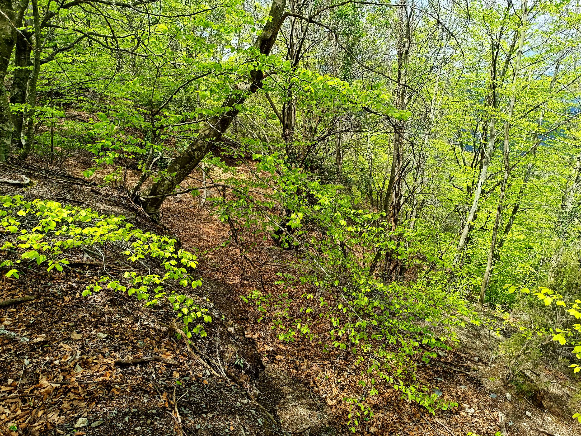 Tras descansar plácidamente en la cima del Turó del Samont, ya bajo el agradable sol de mayo, nos disponemos a regresar de nuevo al punto de inicio de nuestra ruta. Para ello, primero desandamos nuestros pasos hasta alcanzar nuevamente el Collet dels Pous d'en Bessa. Allí, vamos en busca del mencionado tomando un tenue sendero que se interna en el bosque de la derecha.