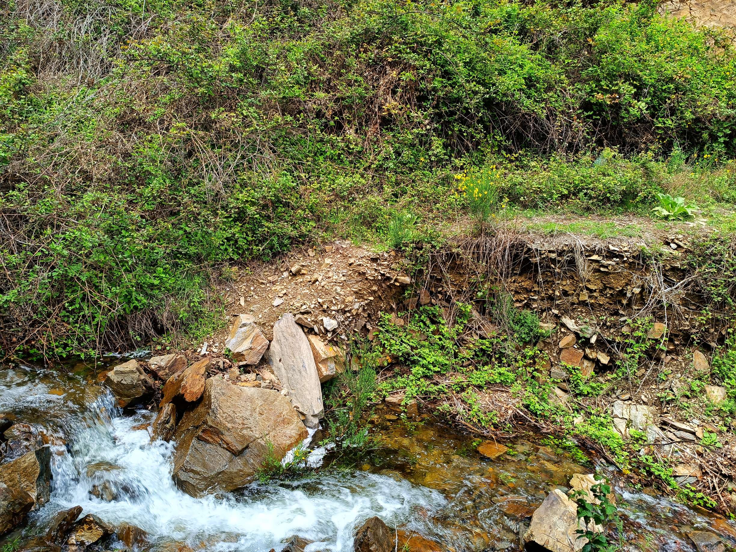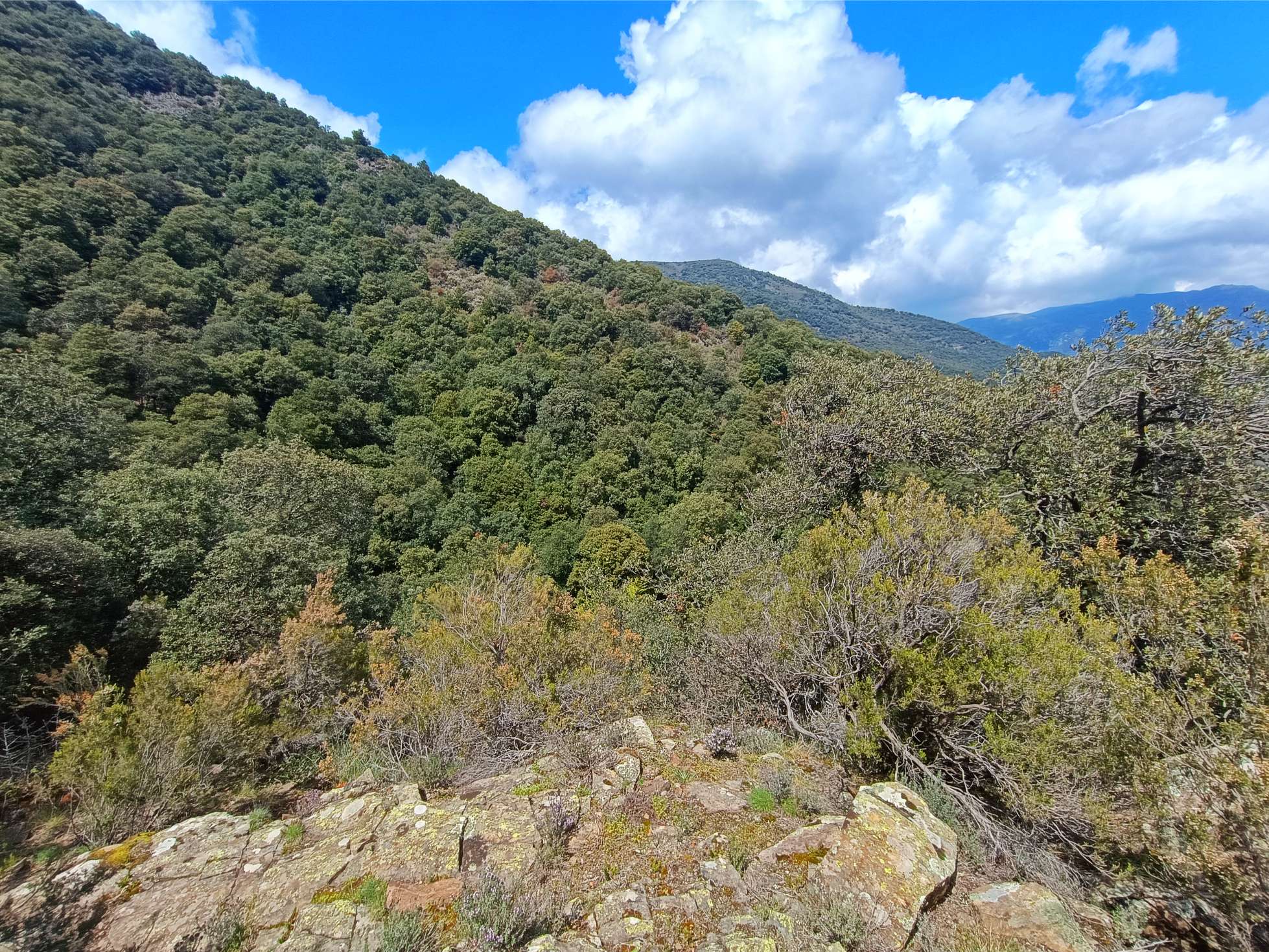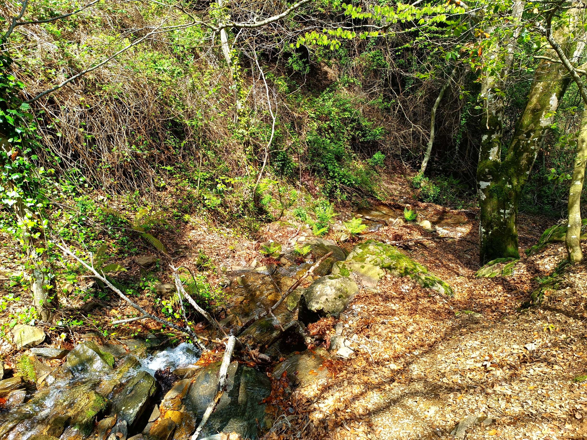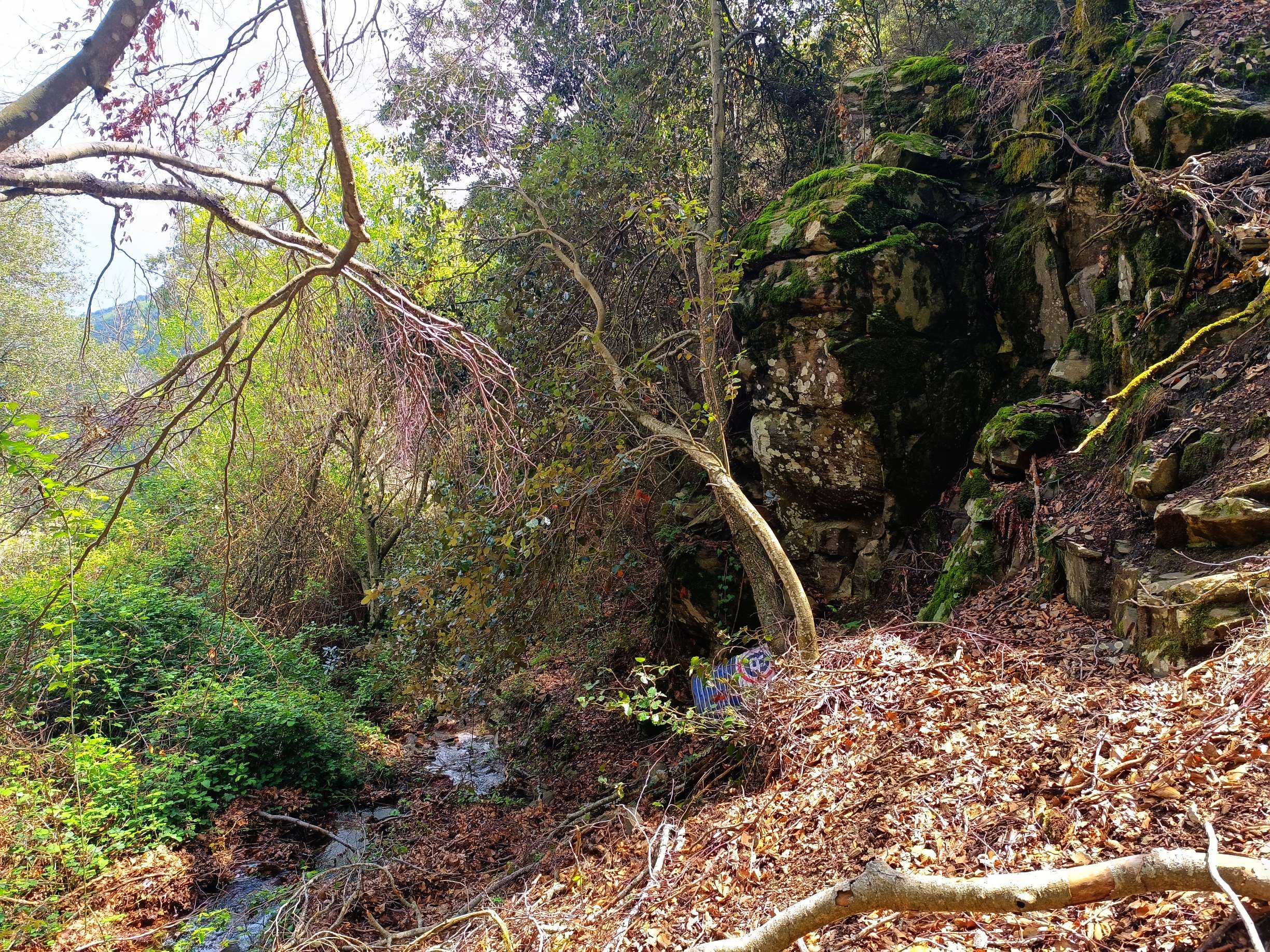 Tras superar algunos tramos más complicados debido a la frondosidad del bosque y la gran inclinación de la ladera, llegamos a una especie de balcón situado por encima de un barranco. El sendero que debemos tomar cruza el riachuelo que fluye por este barranco por lo que tenemos que bajar hasta el fondo del mismo.