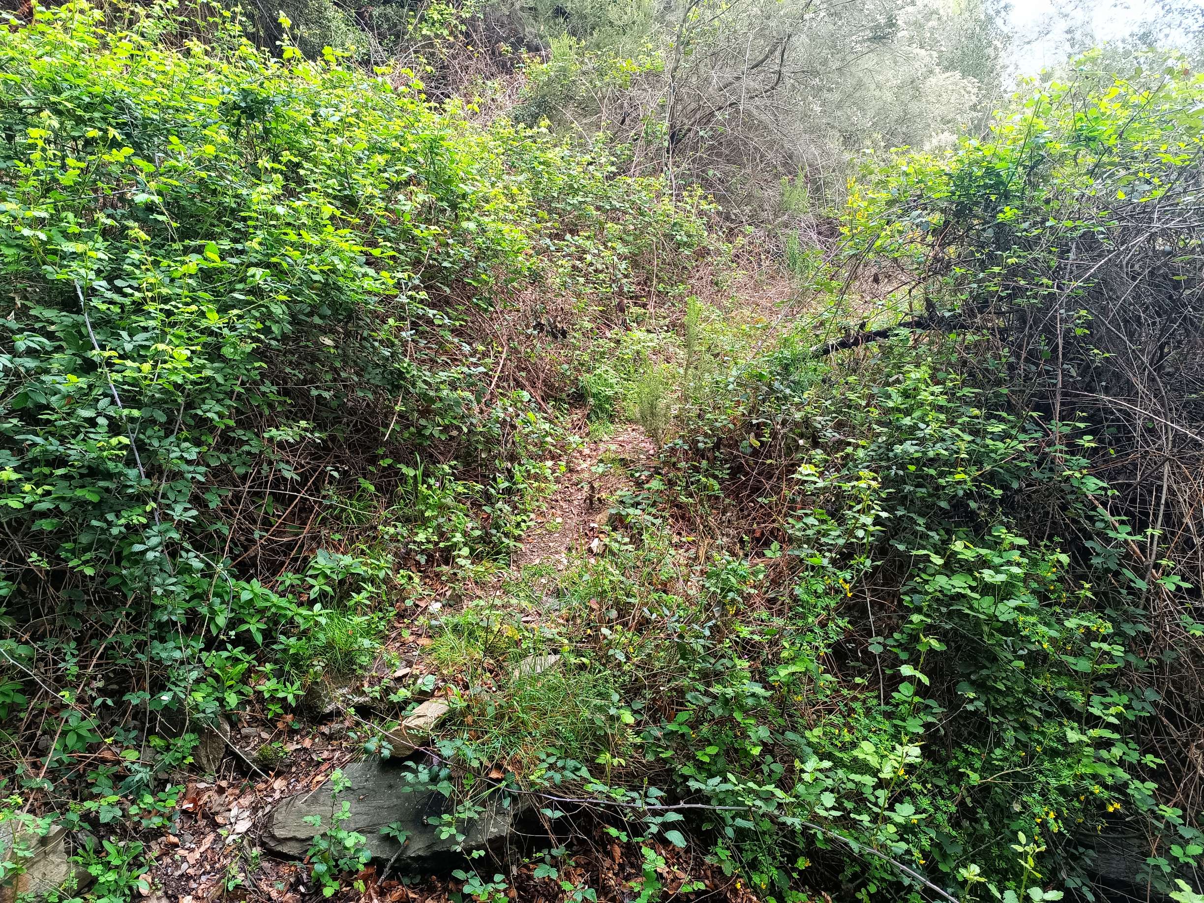 El inicio del sendero puede resultar difícil de encontrar por la abundante vegetación que ha invadido los alrededores del barranco.