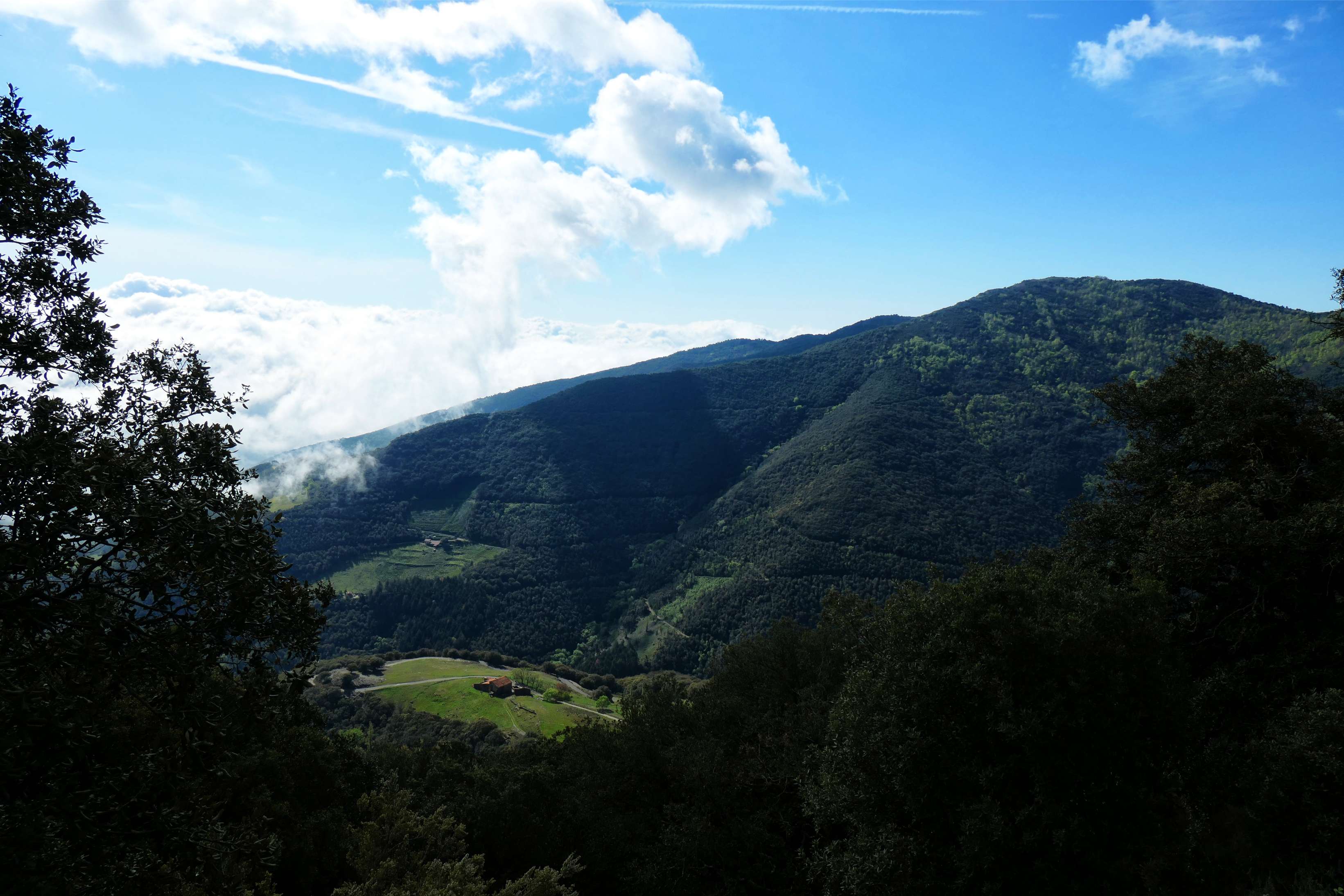 Llanura que vemos apareciendo tras la Roca Centella, extendiéndose hasta Collserola y el Garraf, cuyas sombras se distinguen en el horizonte. En primer plano, destaca la serpenteante línea de hayas que cubre, curiosamente, el fondo del barranco del Sot de la Baga d'en Cuc como si fuera algún tipo de animal fantástico.