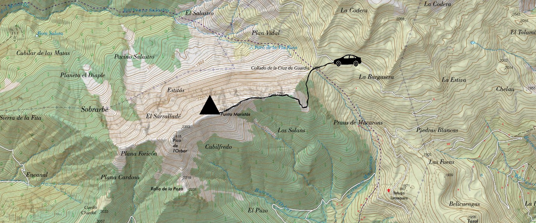 Separada del macizo de la Punta Suelza por el collado de la Cruz de Guardia, el ascenso desde este punto es un paseo, puesto que, aunque el recorrido a veces transcurre por pedreras algo incómodas, la ruta apenas supera los 300 metros de desnivel. Es por ello que es ideal para una ruta matutina o vespertina, para ver el Sol saliendo por el Posets o poniéndose por el Monte Perdido, como es el caso de la ruta de hoy. I es que, por su posición algo más alejada del centro de la cordillera, la Punta Maristás es un mirador excepcional de los dos valles que separa.