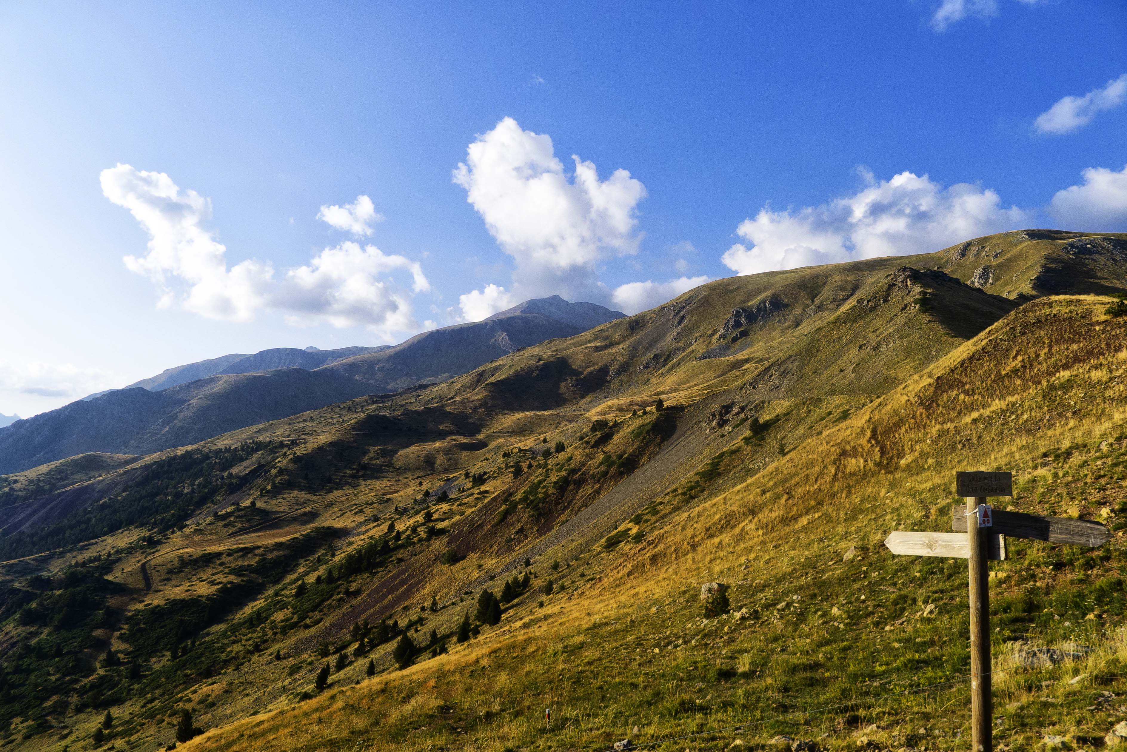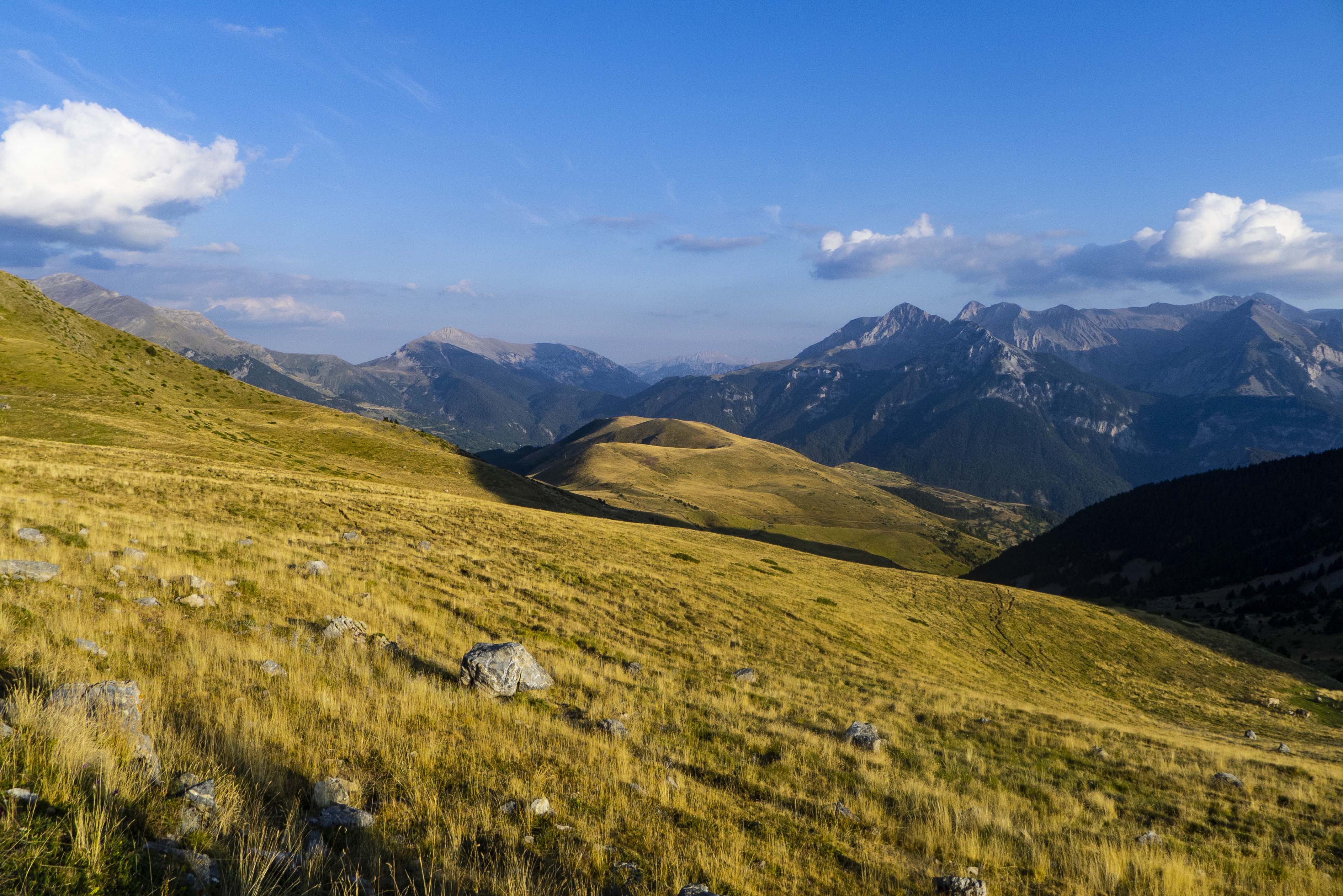 El paisaje observado desde la pista cercana al collado de la Cruz de Guardia es espectacular pues, aparte de los prados teñidos de dorado, al otro lado del Cinqueta se observan ya los macizos de Chía y Cotiella y, entre los mismos, el Turbón.