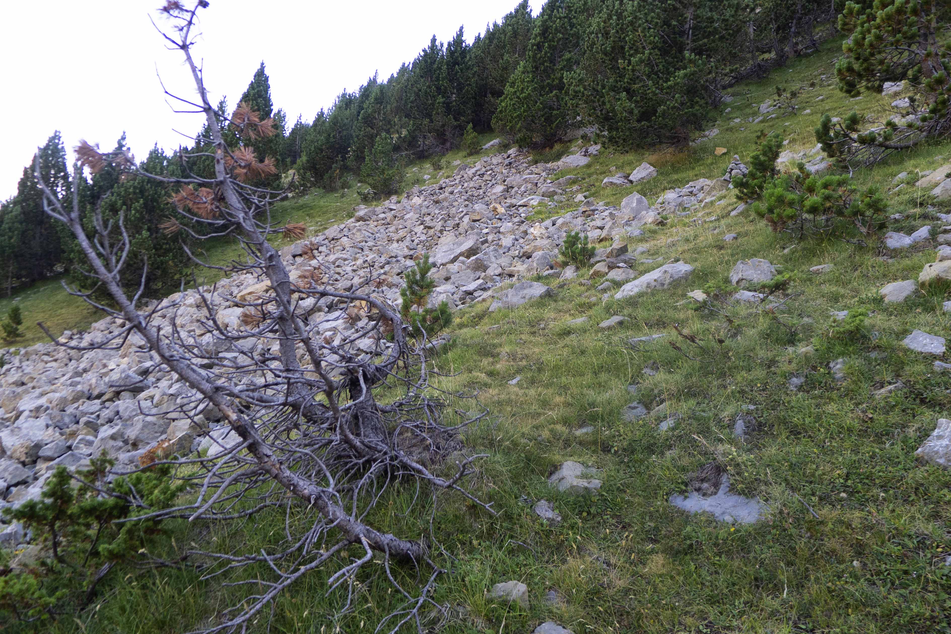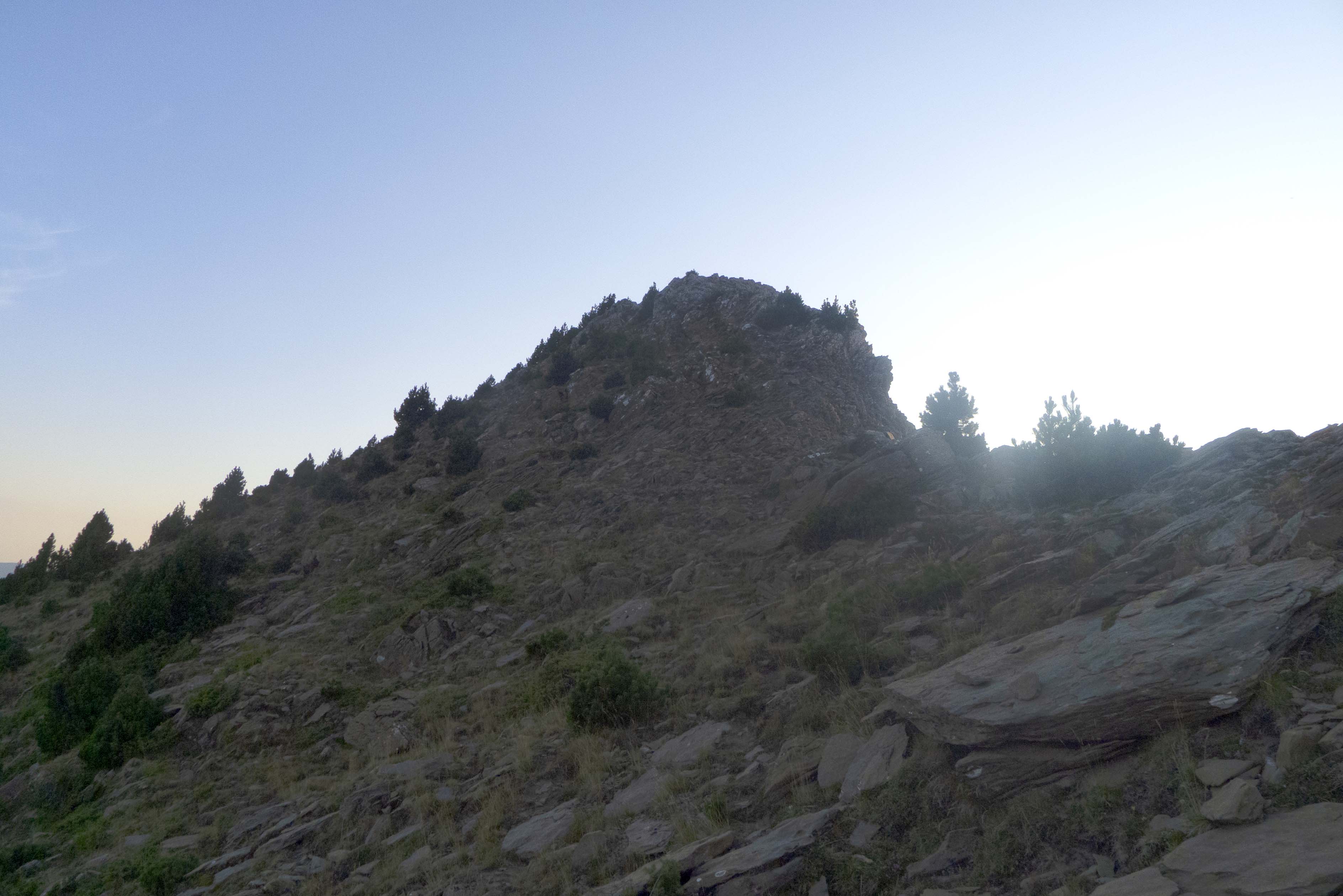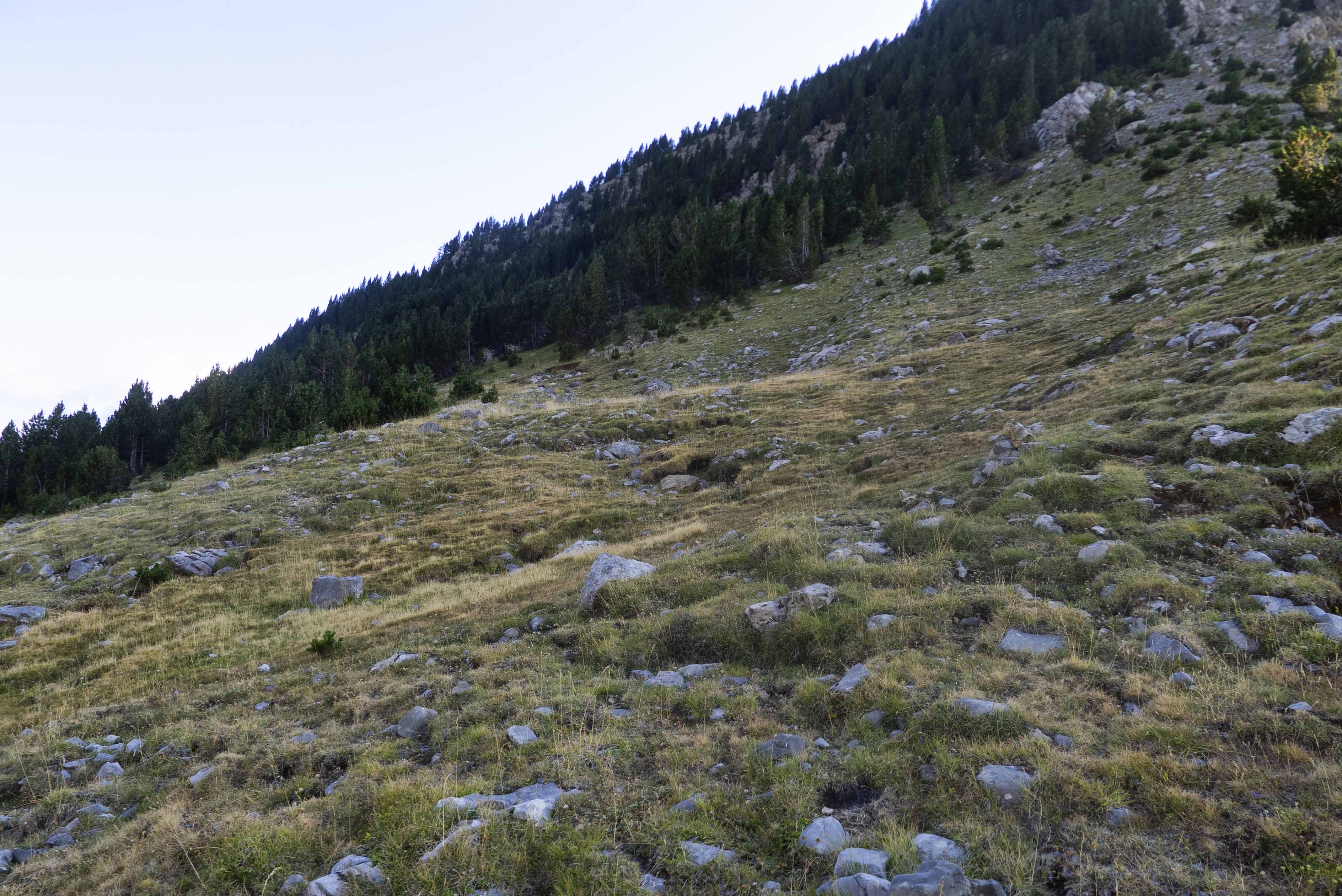 Cuando llegamos al cambio de vertiente, el sendero desaparece o nosotros lo perdemos, pero ya no es necesario puesto que, ya que el terreno es cómodo, vamos directamente hacia el norte, donde se encuentra la cresta.