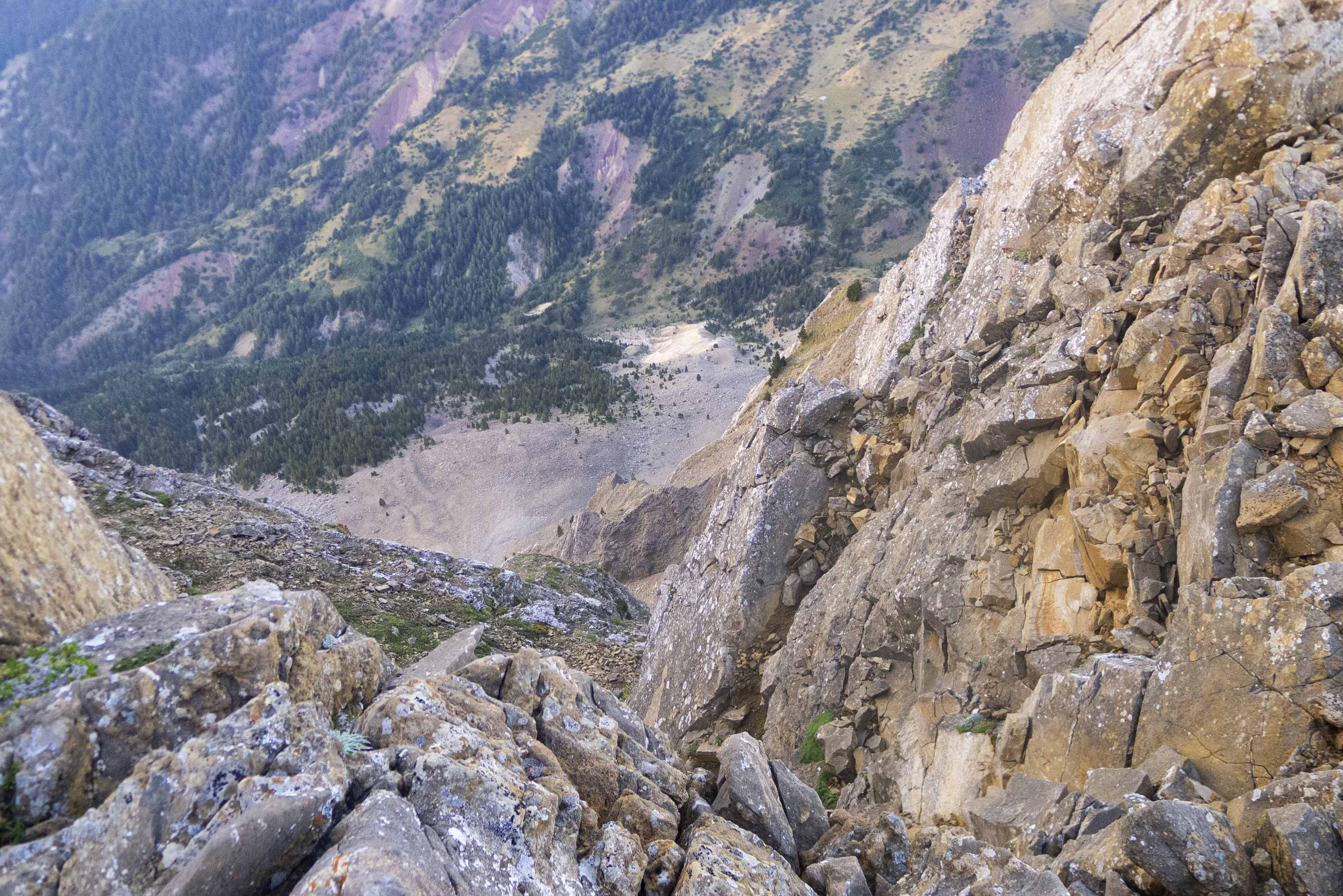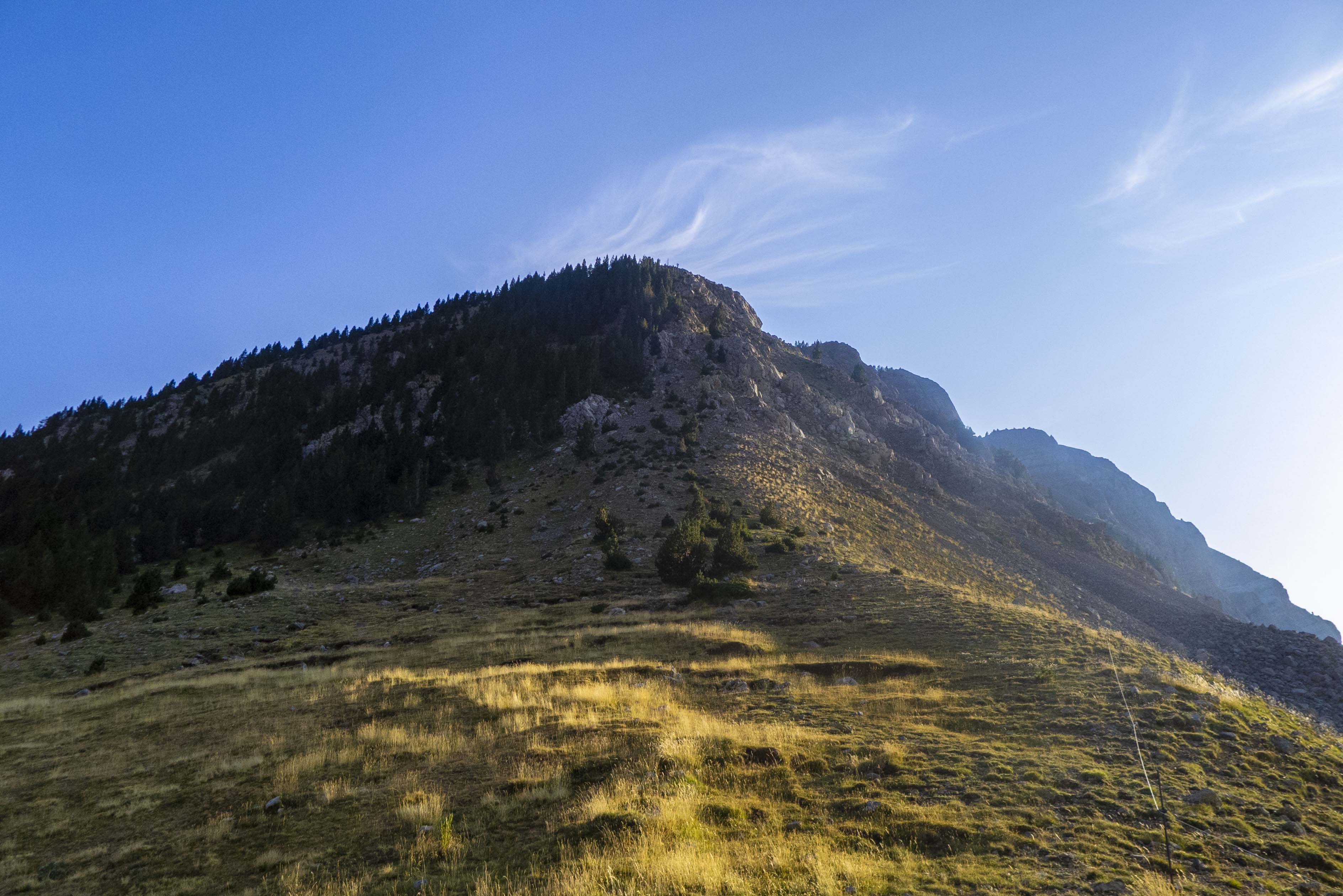 Llegamos a la arista justo en la única cota relevante aparte de las dos cumbres, la cota 2.297 m Iberpix. Desde allí observamos la cumbre ya bastante cercana, culminando las dos diferenciadas caras de la montaña: la sur, boscosa, y la norte, una tremenda pared.