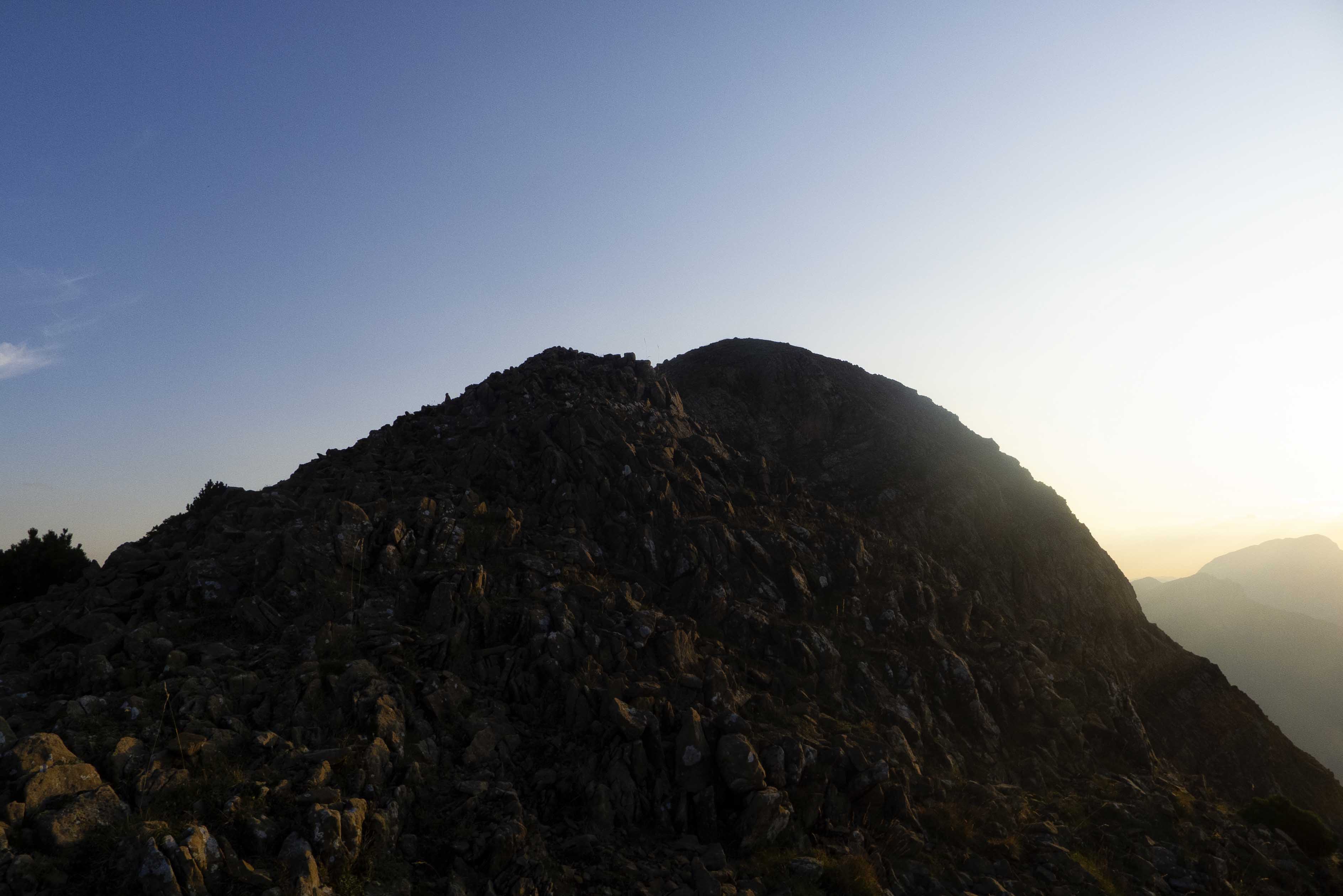 Pero no podemos embobarnos, puesto que el Sol ya está de clara bajada y nuestro objetivo es observar la puesta de Sol desde la misma cumbre de la Punta Maristás, que vemos despuntando tras la antecima.