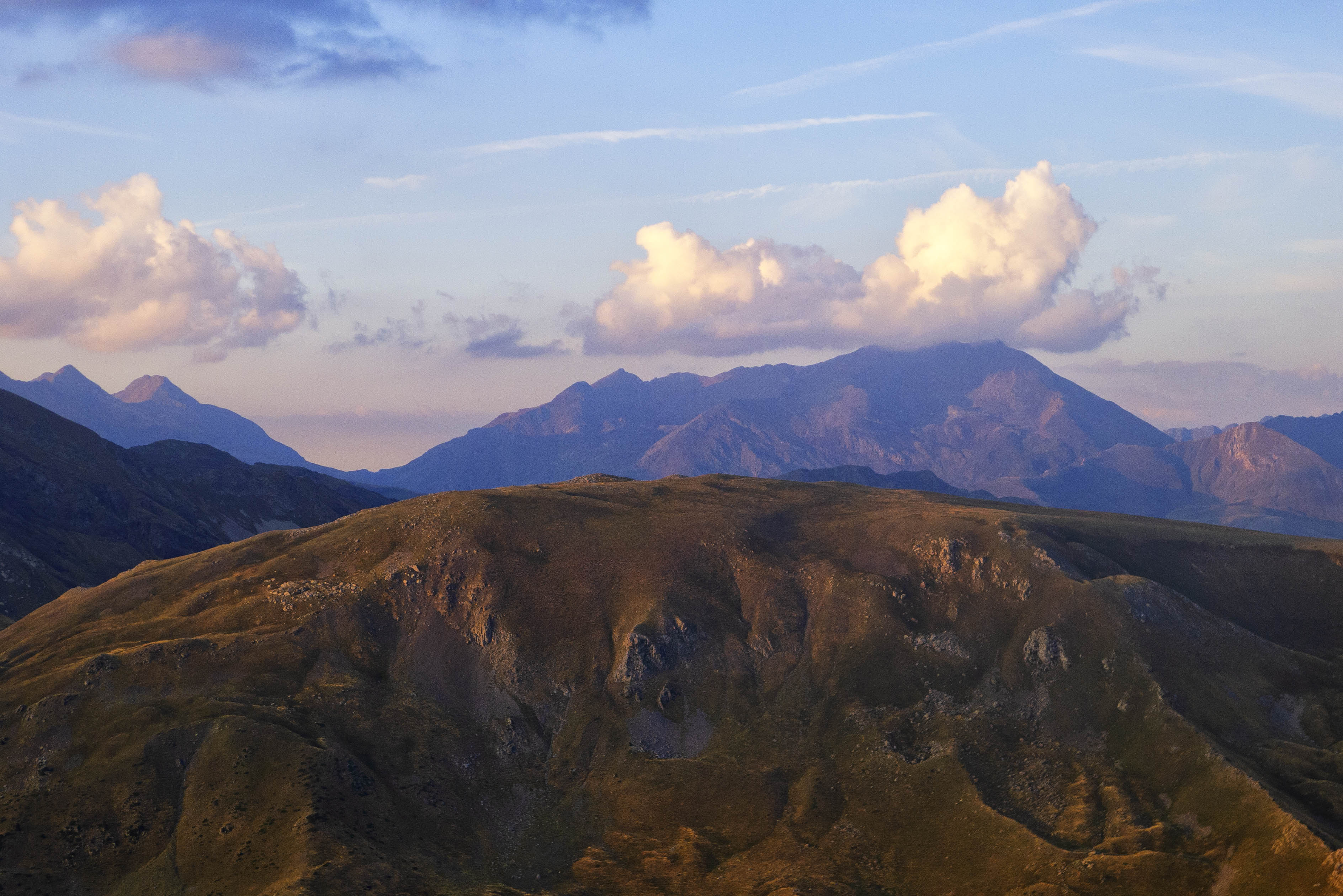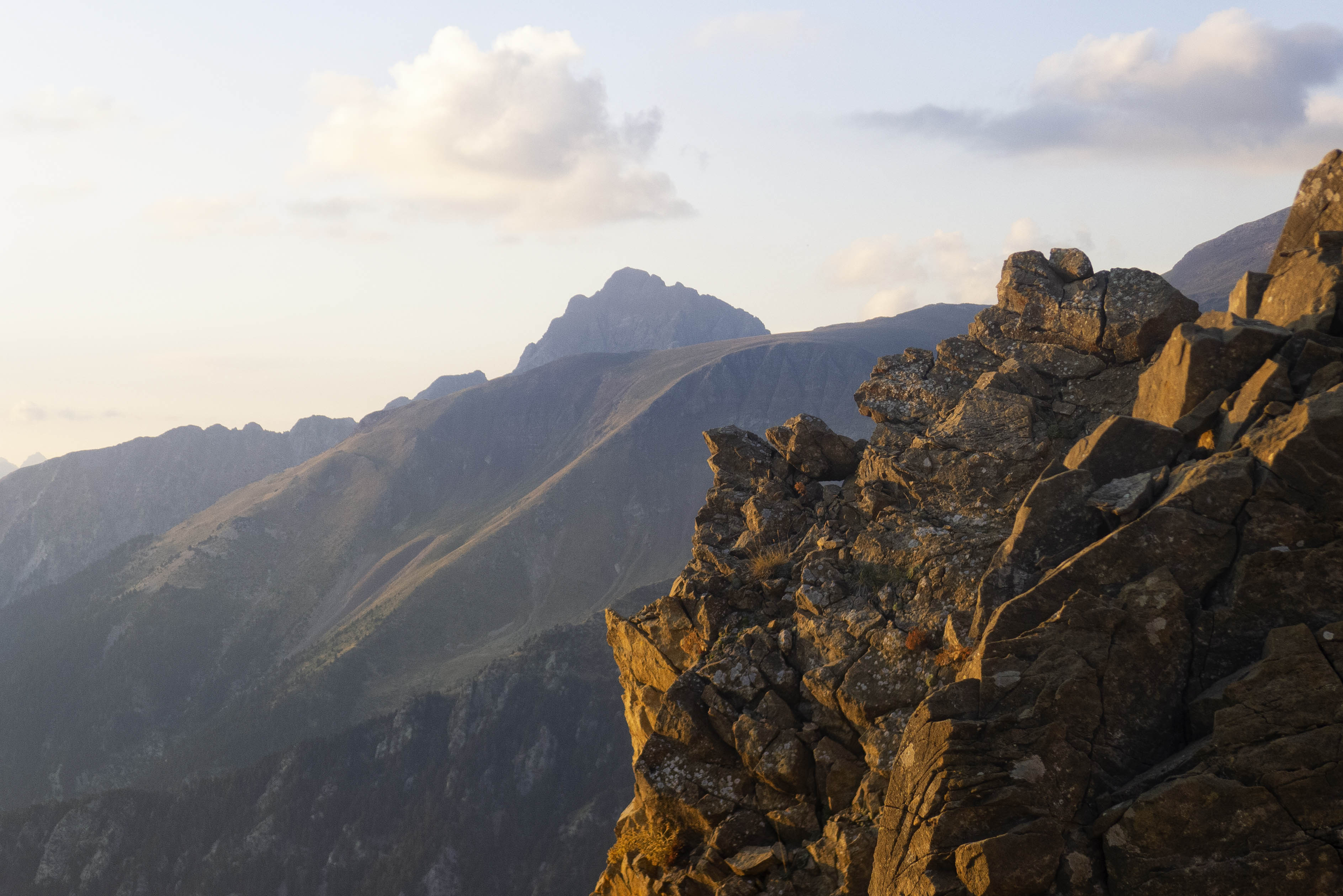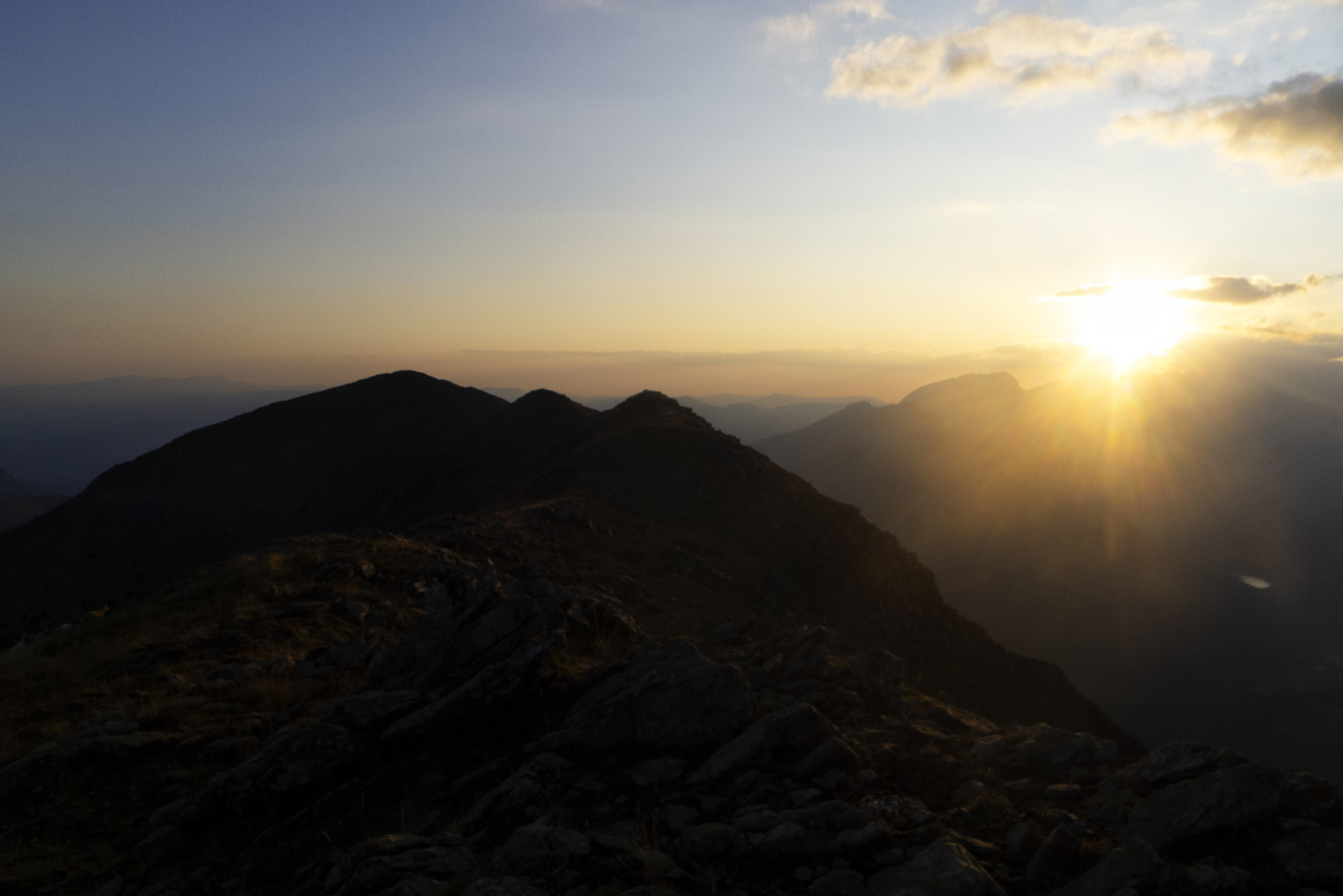 Desgraciadamente, una inoportuna nube cubre la zona de las Tres Sorores y no podemos ver la puesta de Sol deseada. En cualquier caso, el atardecer es espectacular y el color dorado invade todas las montañas que podemos ver desde este excepcional mirador