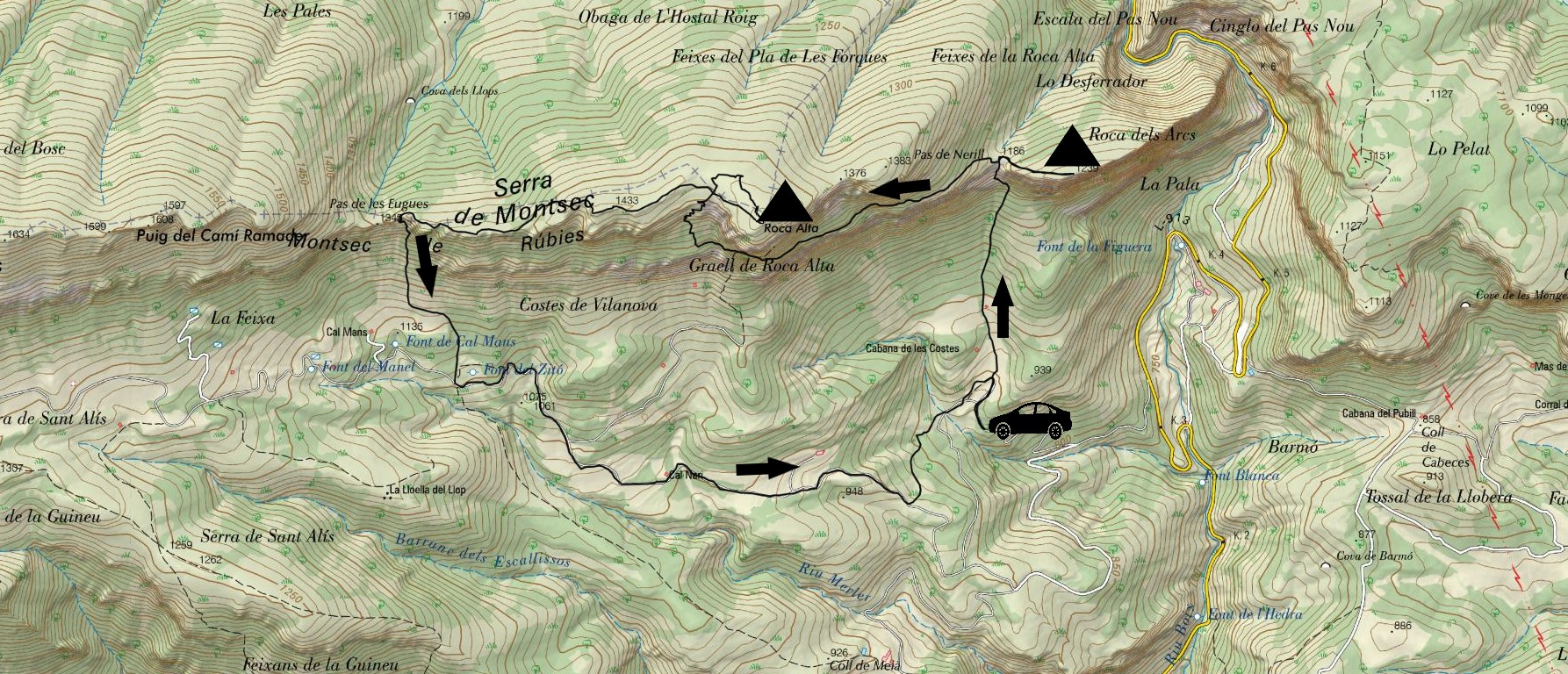 En esta excursión se propone recorrer el sector oriental del Montsec de Rúbies, accediendo al mismo por el Pas de Nerill, el grau más oriental, para ascender a la Roca dels Arcs y asomarse a su abismo. Tras bordear la Roca Alta por el sur, aprovechamos el camino construido por los republicanos para subir por el Grau d’Esmolacalces hasta la cumbre, para luego recorrer la arista hasta el Pas de les Eugues, descendiendo por allí, tras haber recorrido la punta más oriental de todo el Montsec.
