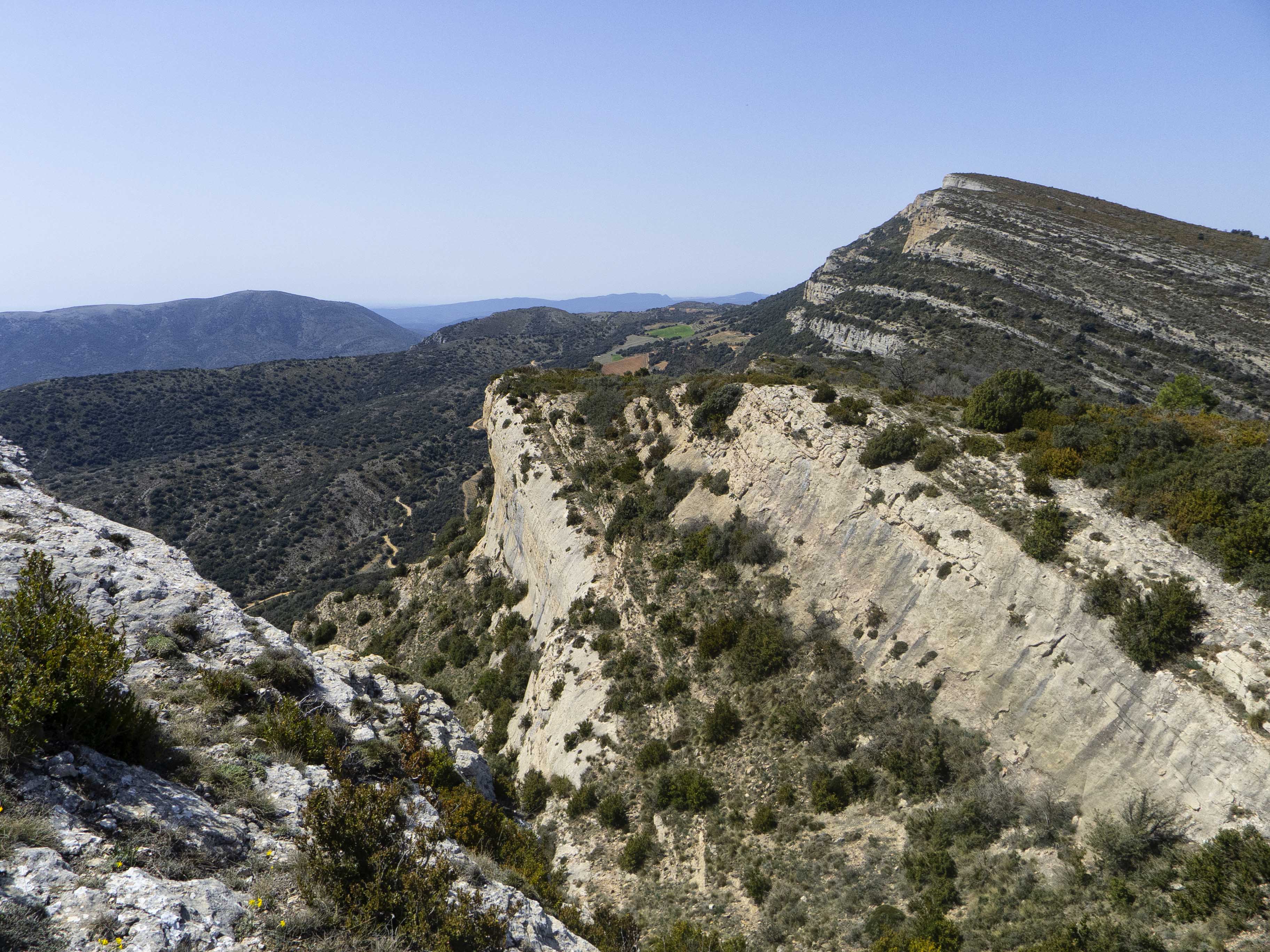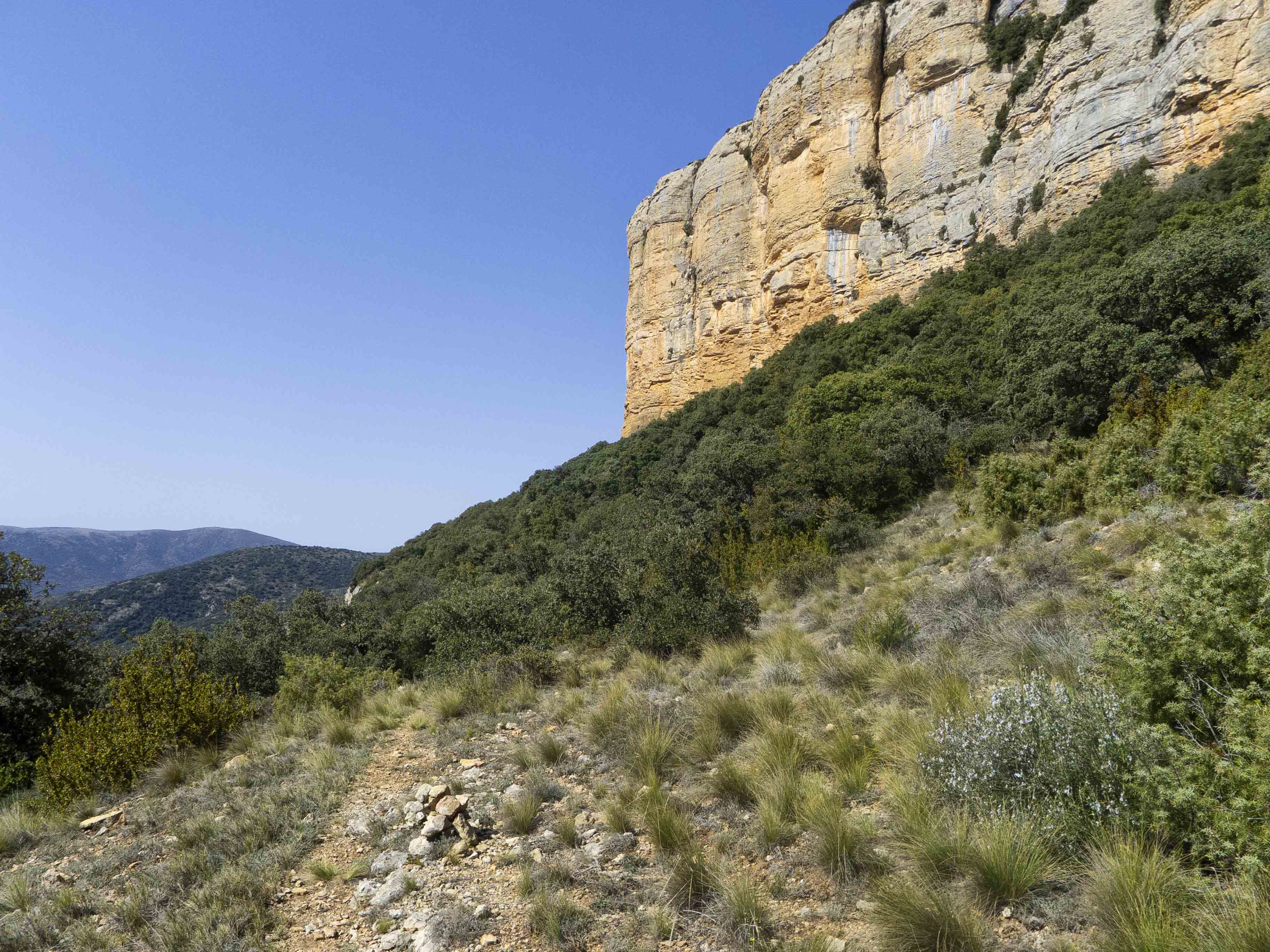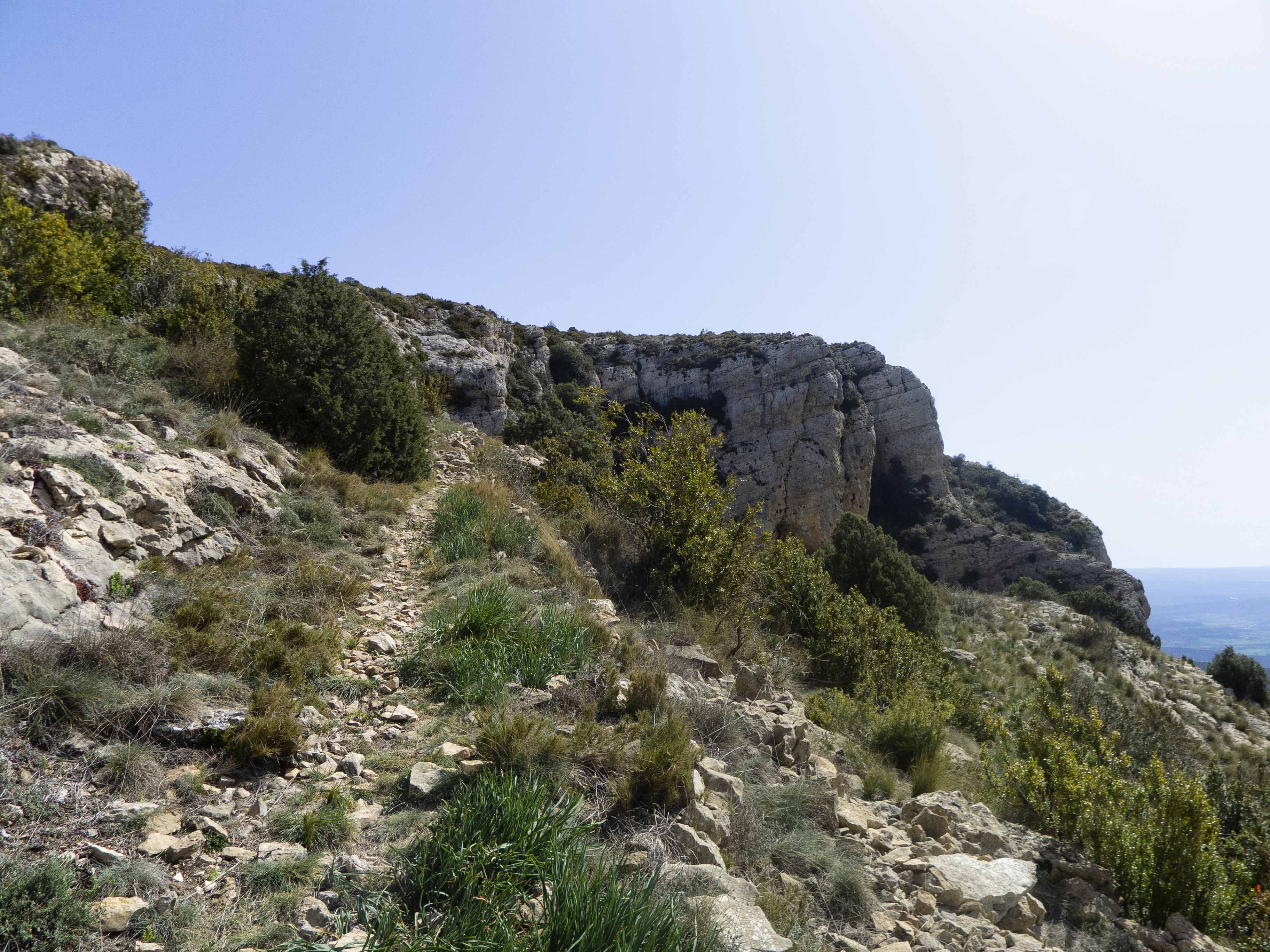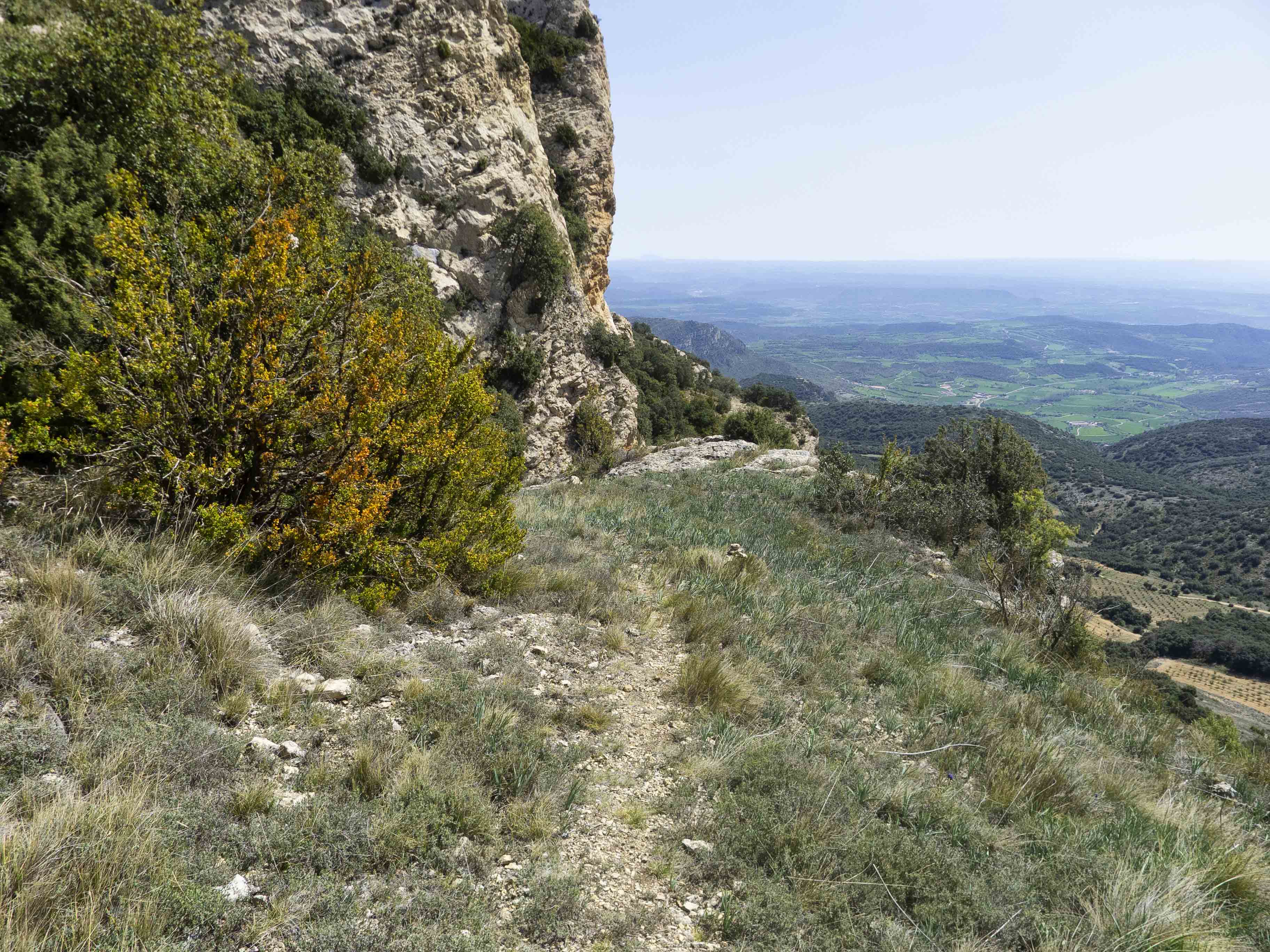 El sendero desciende lentamente por el mismo filo de la sierra, cosa que nos permite disfrutar de las grandes vistas que tenemos a ambos lados. Vamos bordeando los típicos farallones que desprende el Montsec hacia el sur y que le dan al sendero una cierta sensación aérea, pero el camino es muy fácil y claro en todo momento.