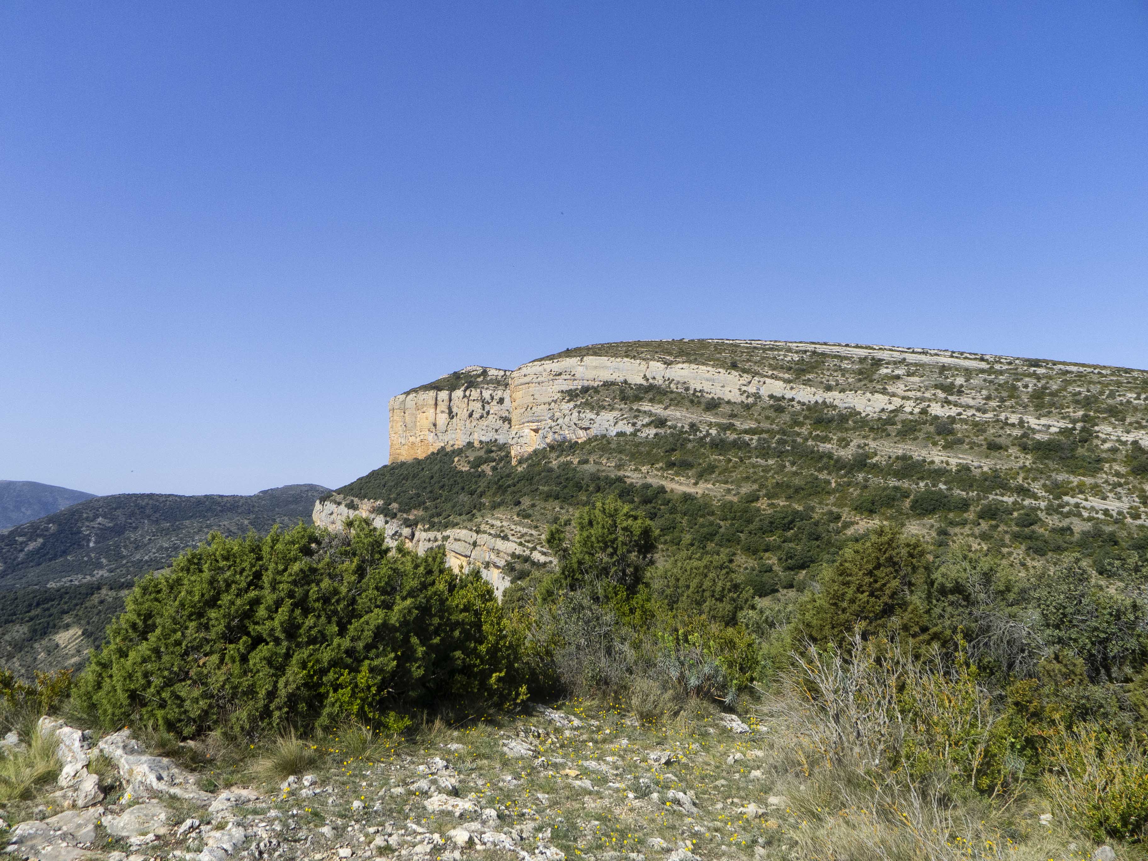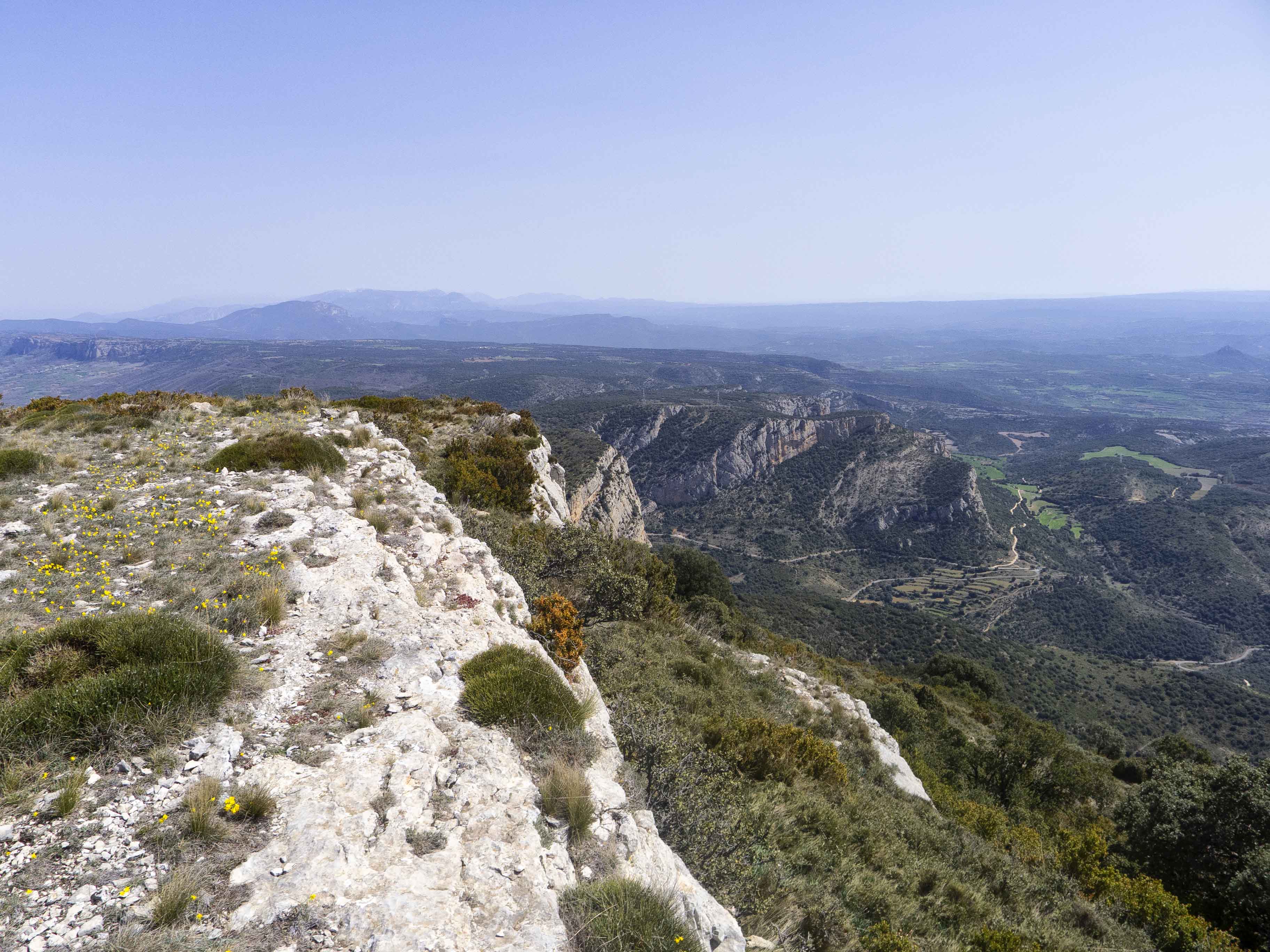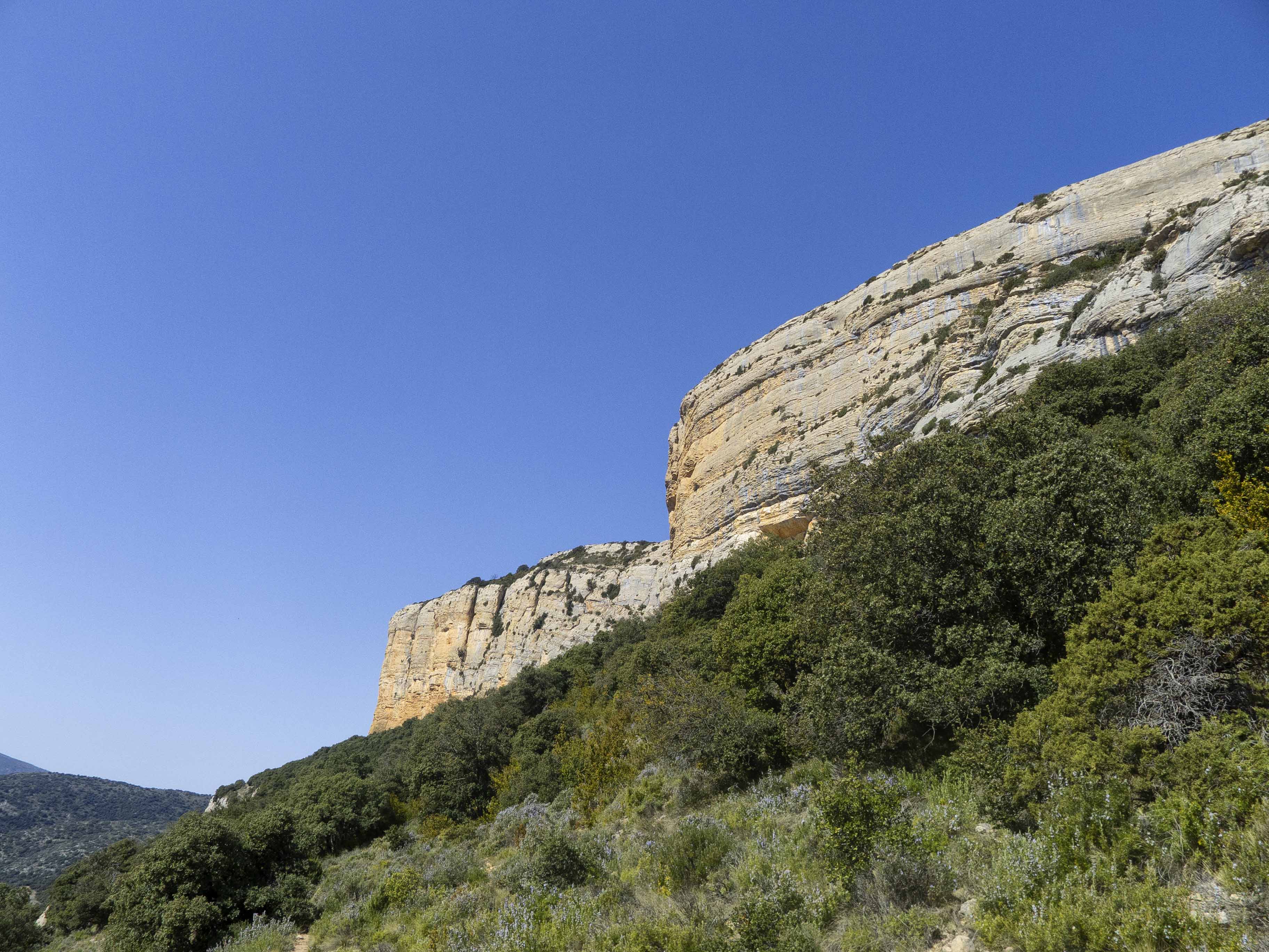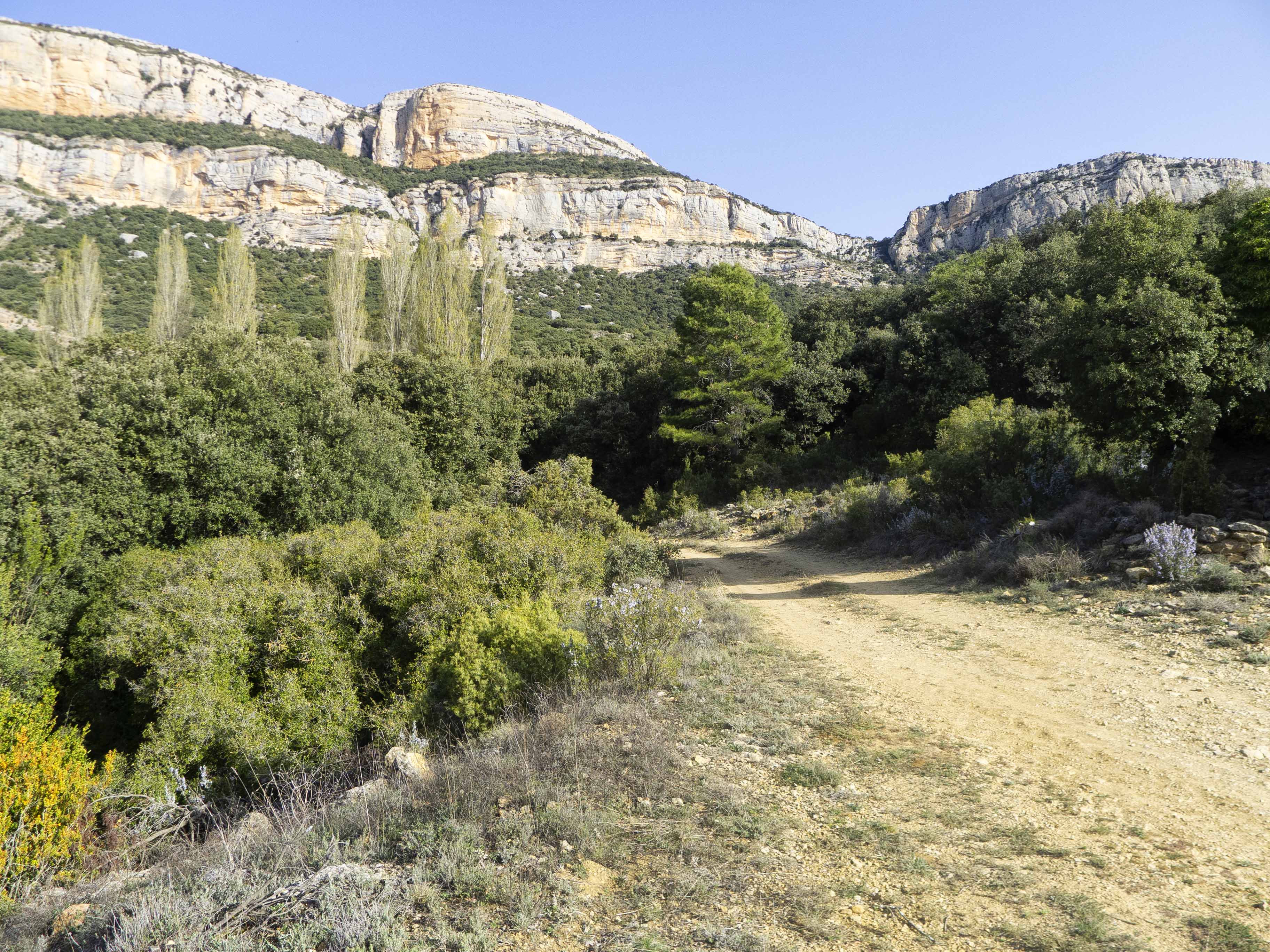 El sendero desciende lentamente por el mismo filo de la sierra, cosa que nos permite disfrutar de las grandes vistas que tenemos a ambos lados. Vamos bordeando los típicos farallones que desprende el Montsec hacia el sur y que le dan al sendero una cierta sensación aérea, pero el camino es muy fácil y claro en todo momento.
