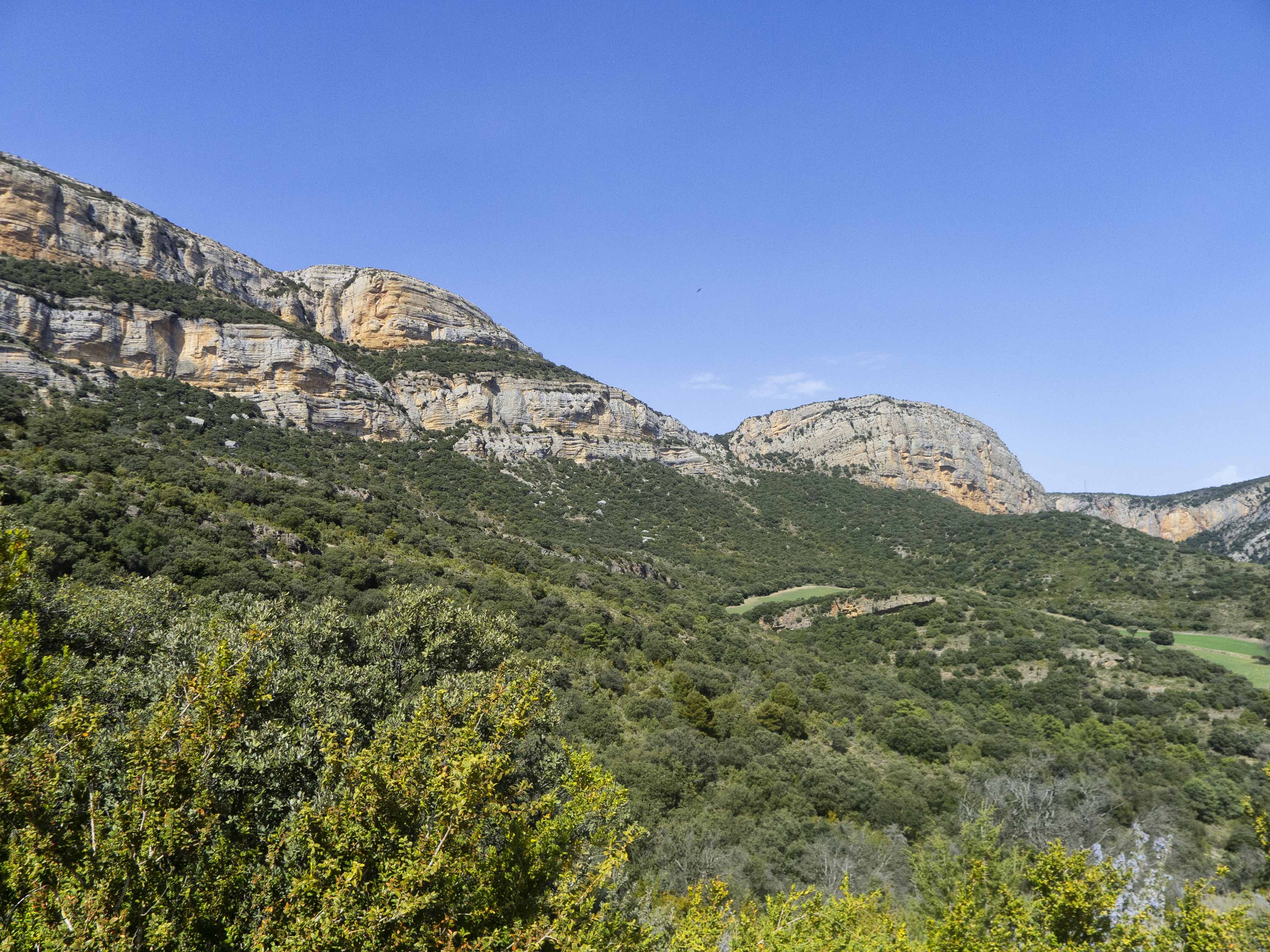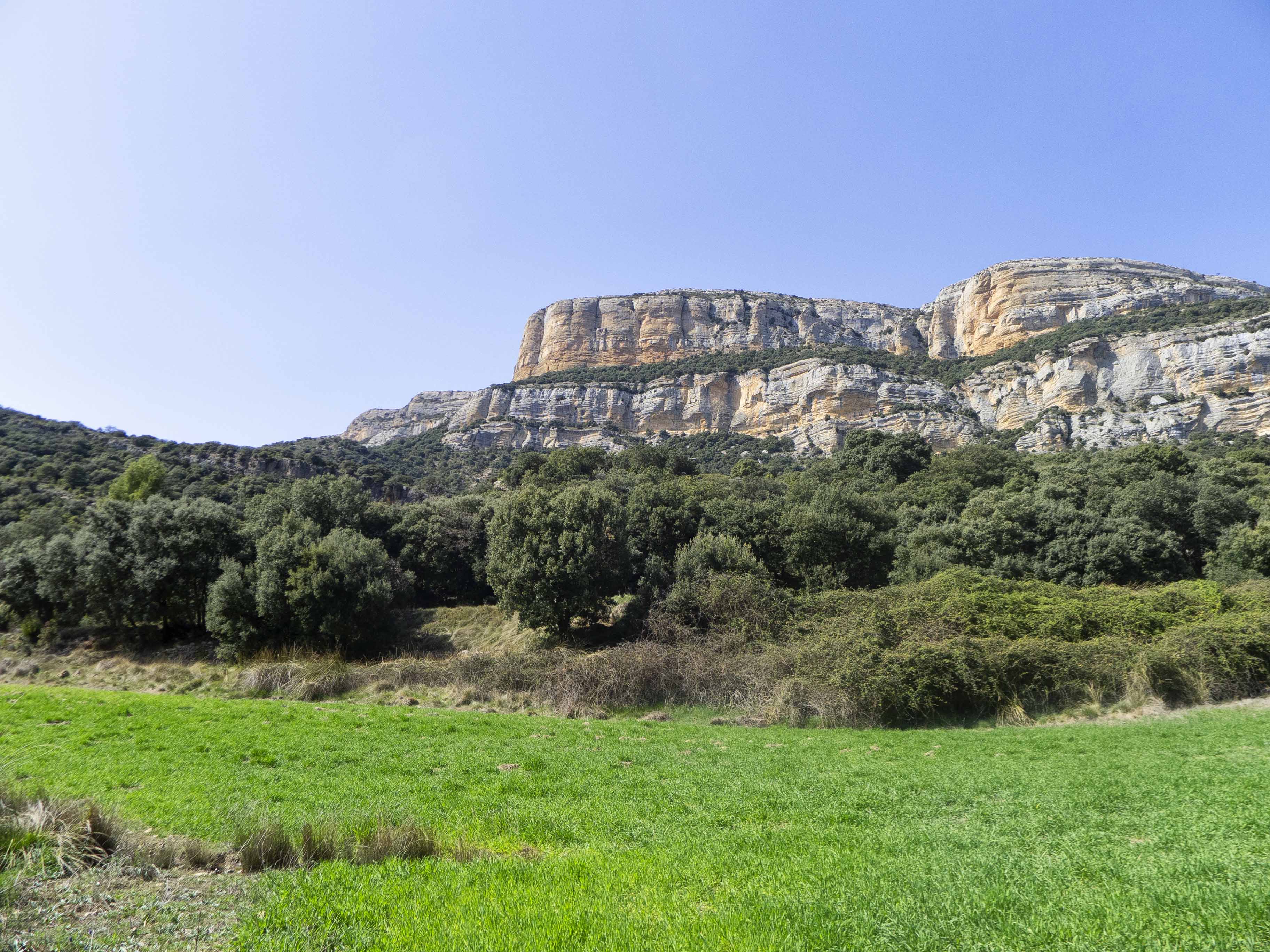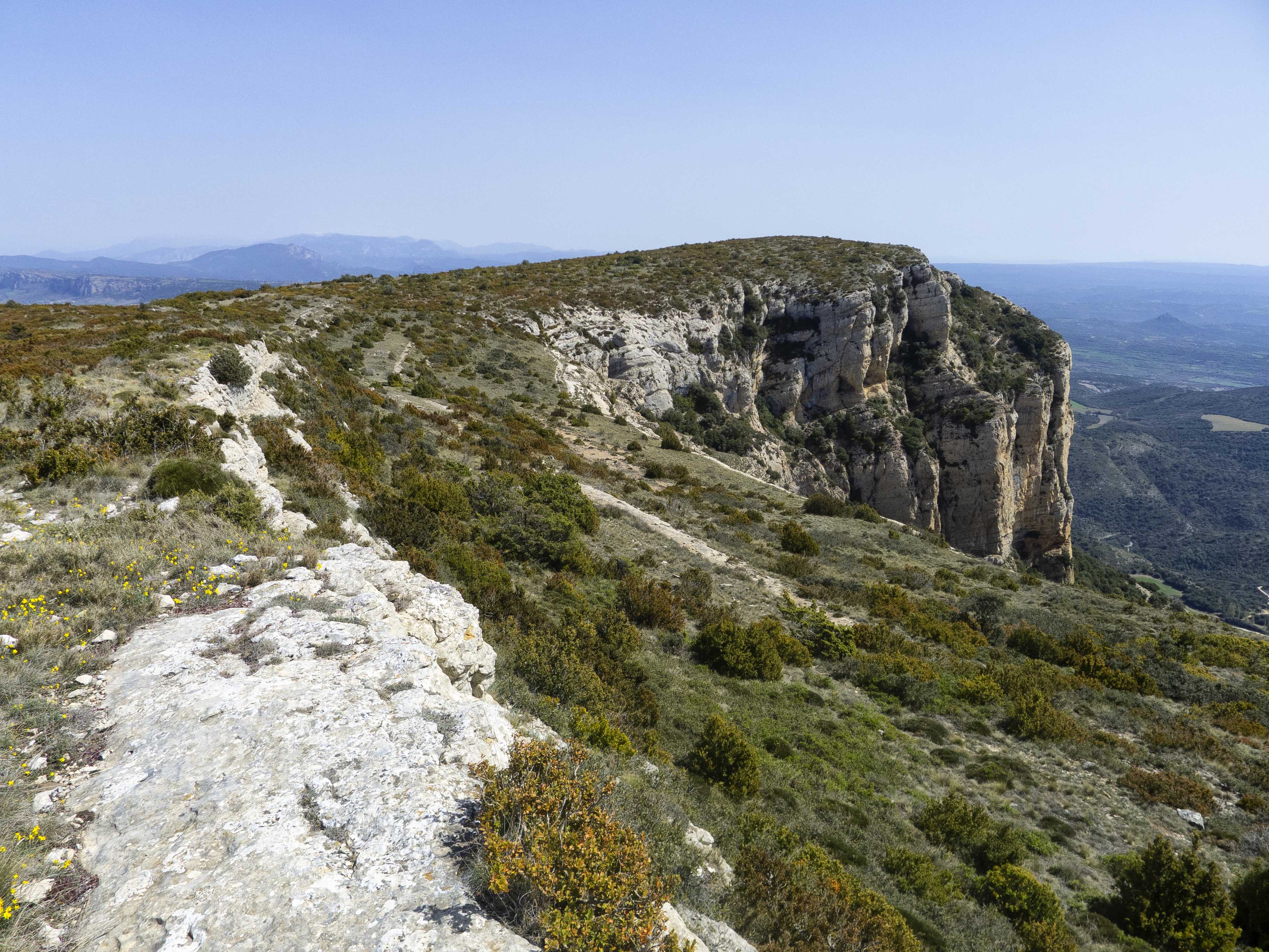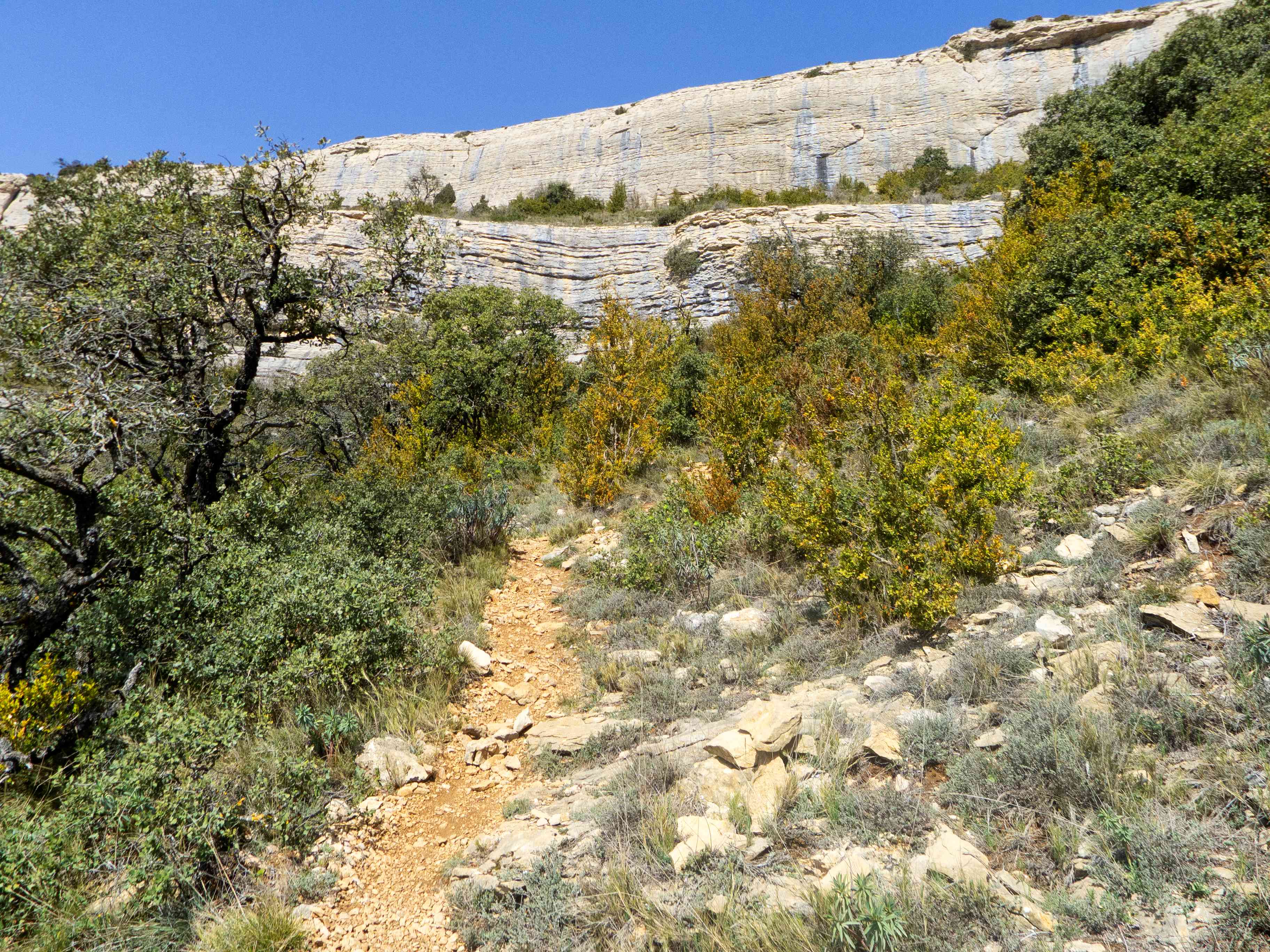 El sendero desciende lentamente por el mismo filo de la sierra, cosa que nos permite disfrutar de las grandes vistas que tenemos a ambos lados. Vamos bordeando los típicos farallones que desprende el Montsec hacia el sur y que le dan al sendero una cierta sensación aérea, pero el camino es muy fácil y claro en todo momento.