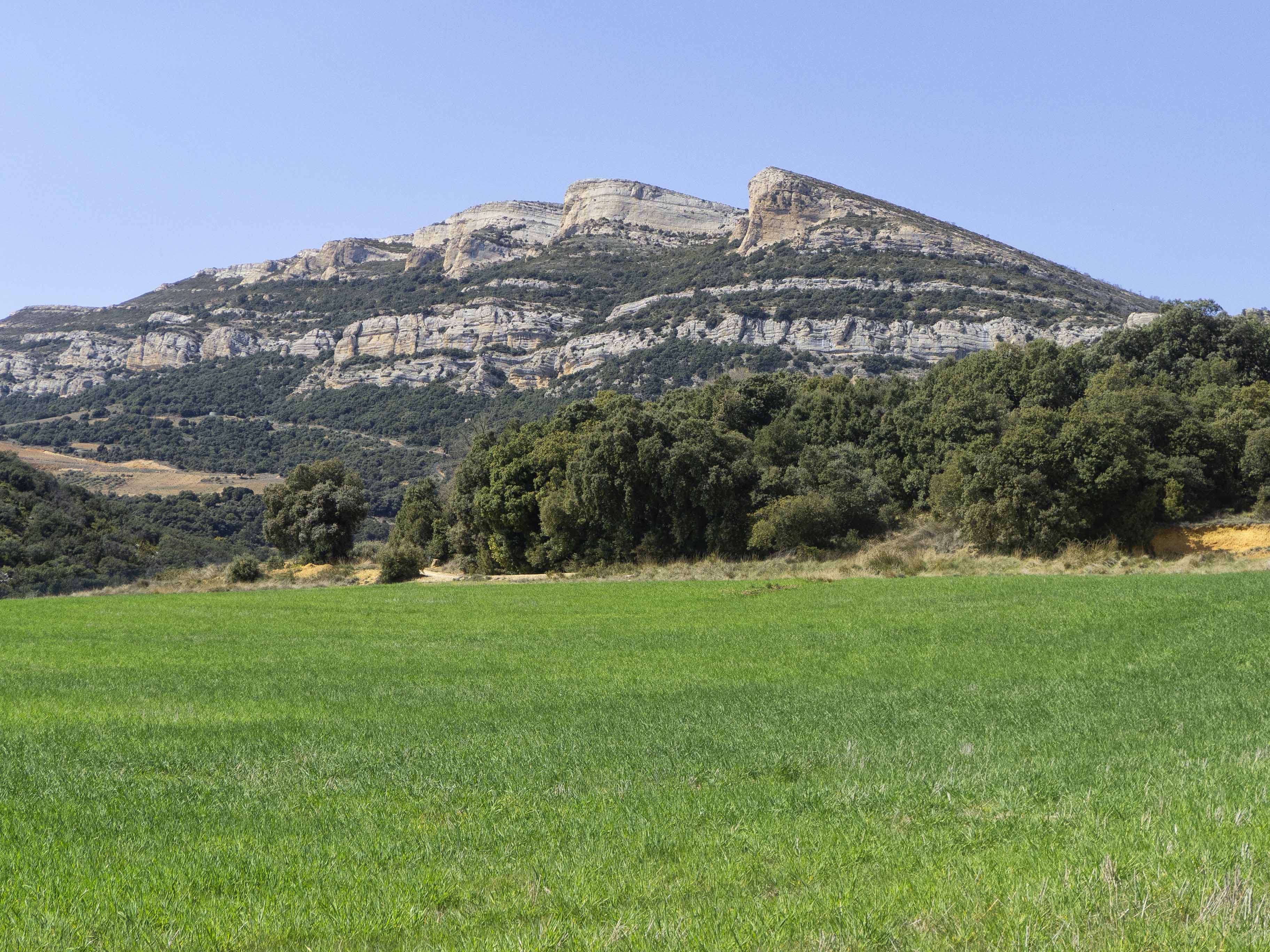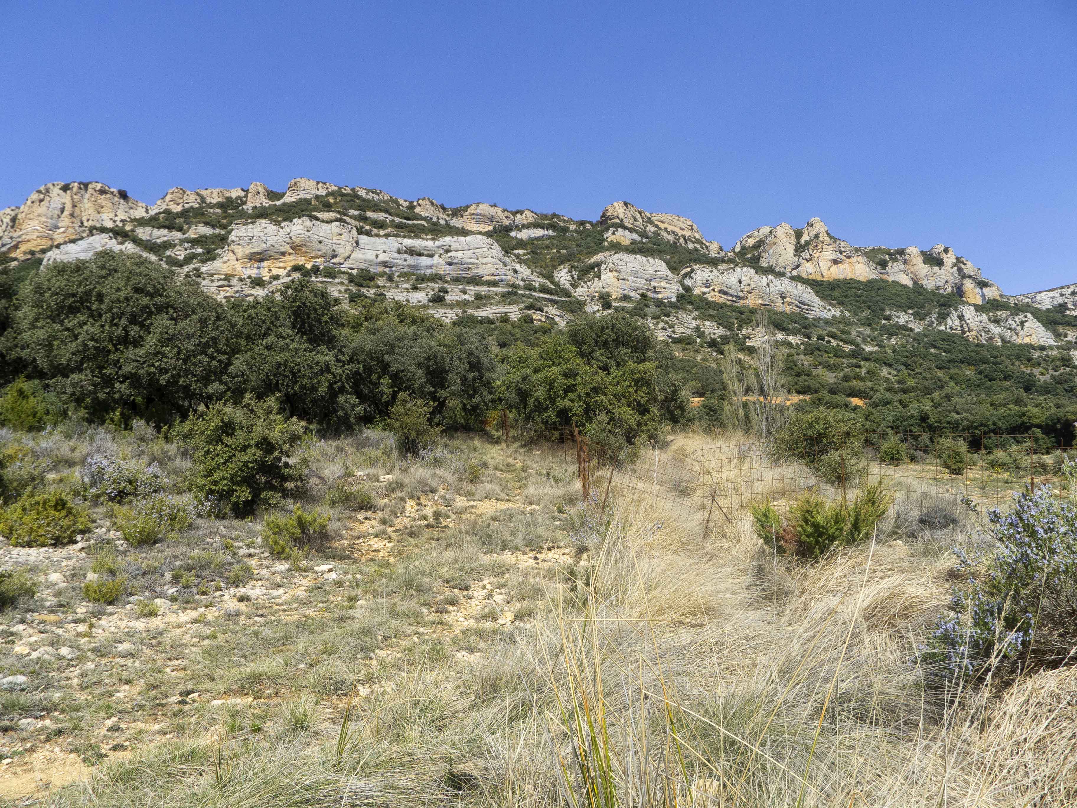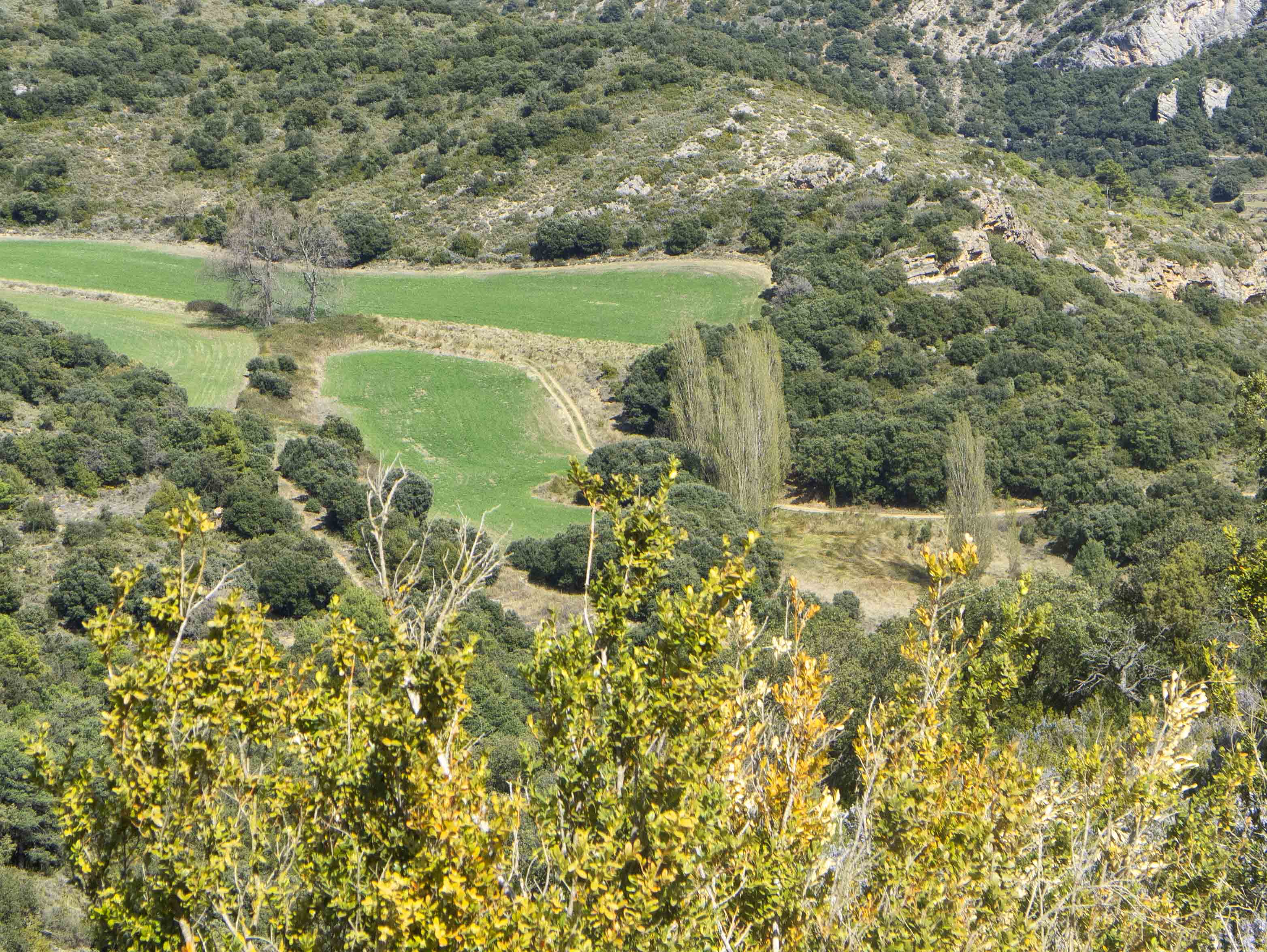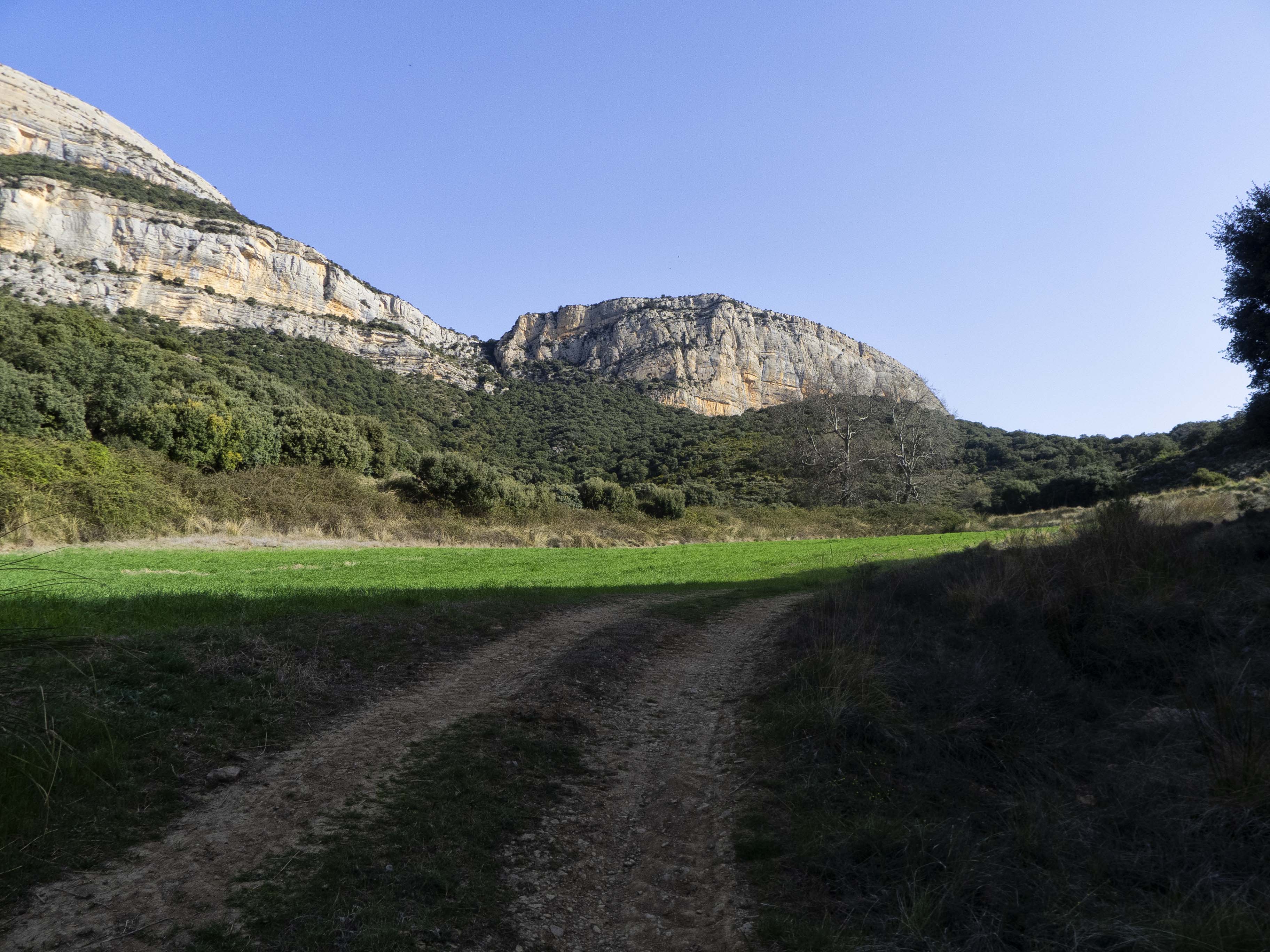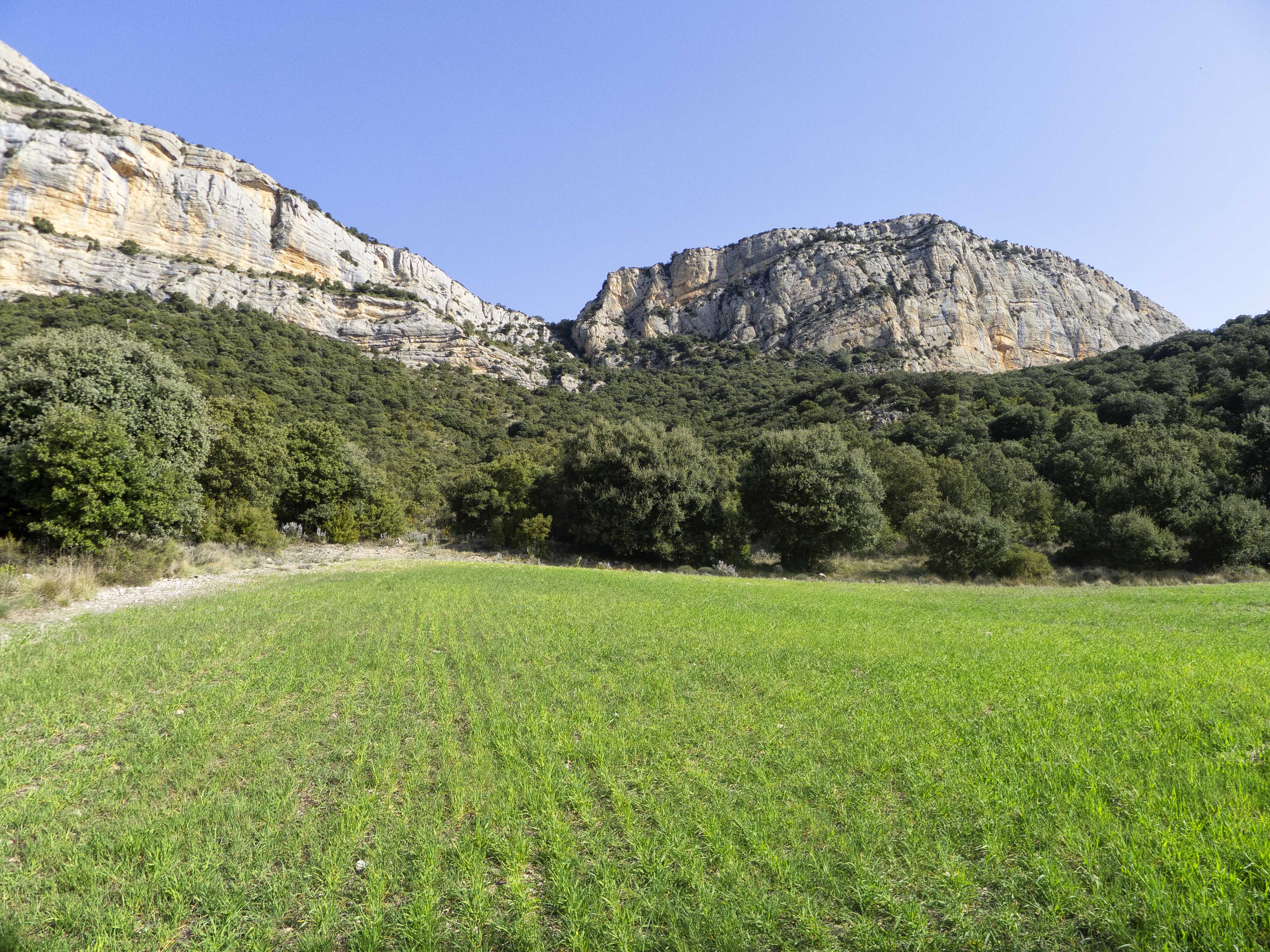 La pista desaparece al llegar a los campos de les Costes de l’Isaac, que tendremos que cruzar en dirección a las paredes del Montsec.