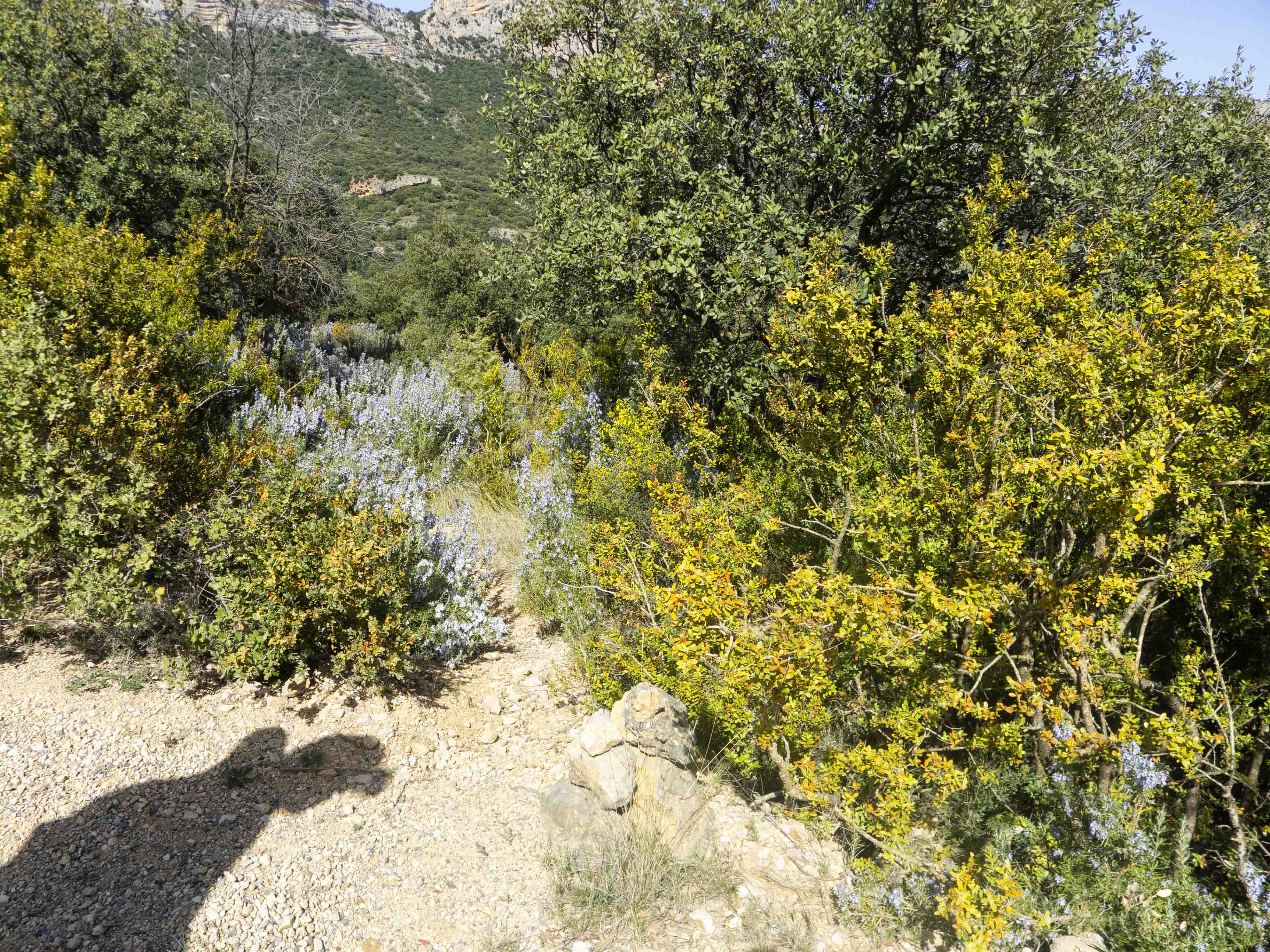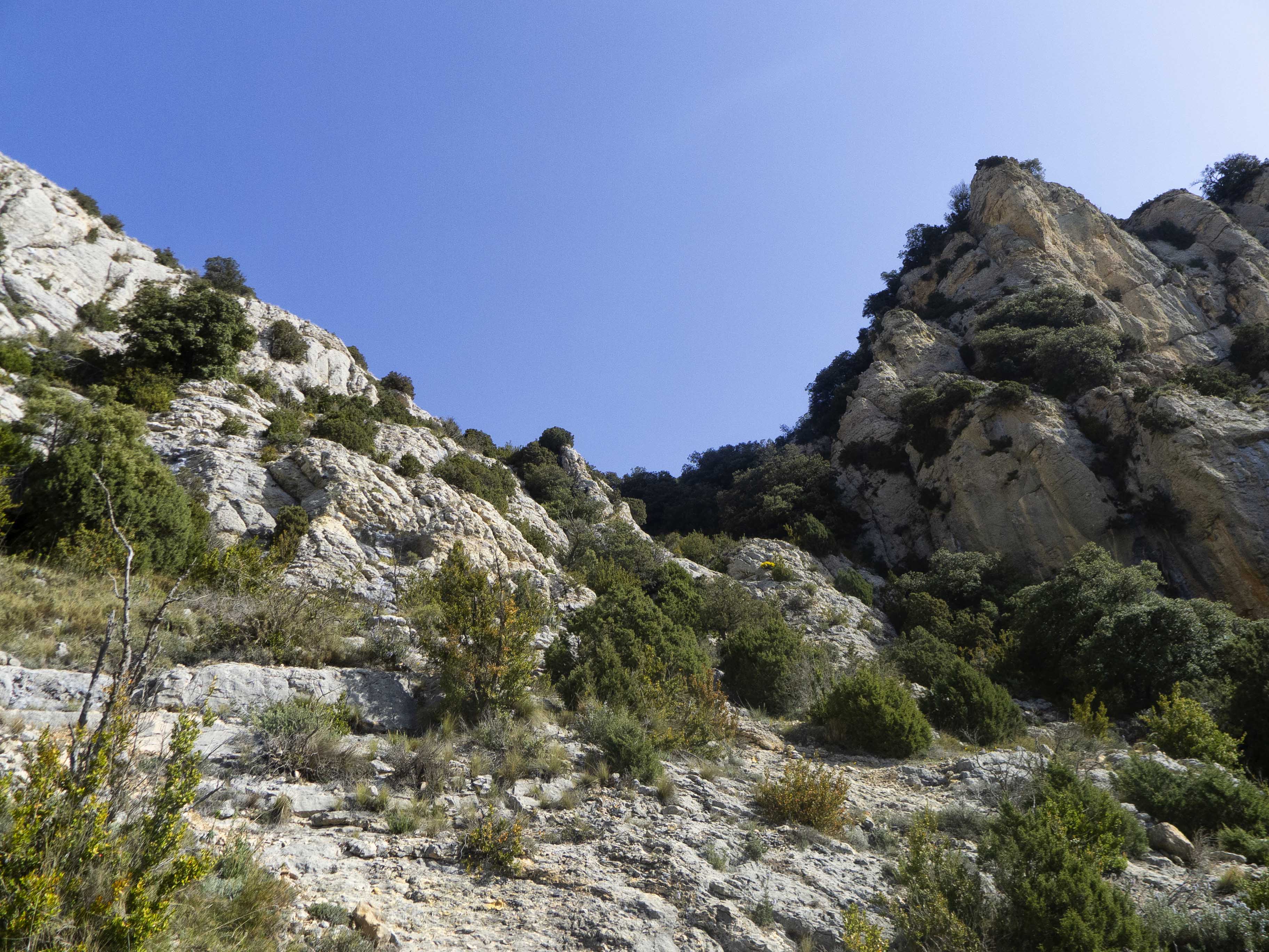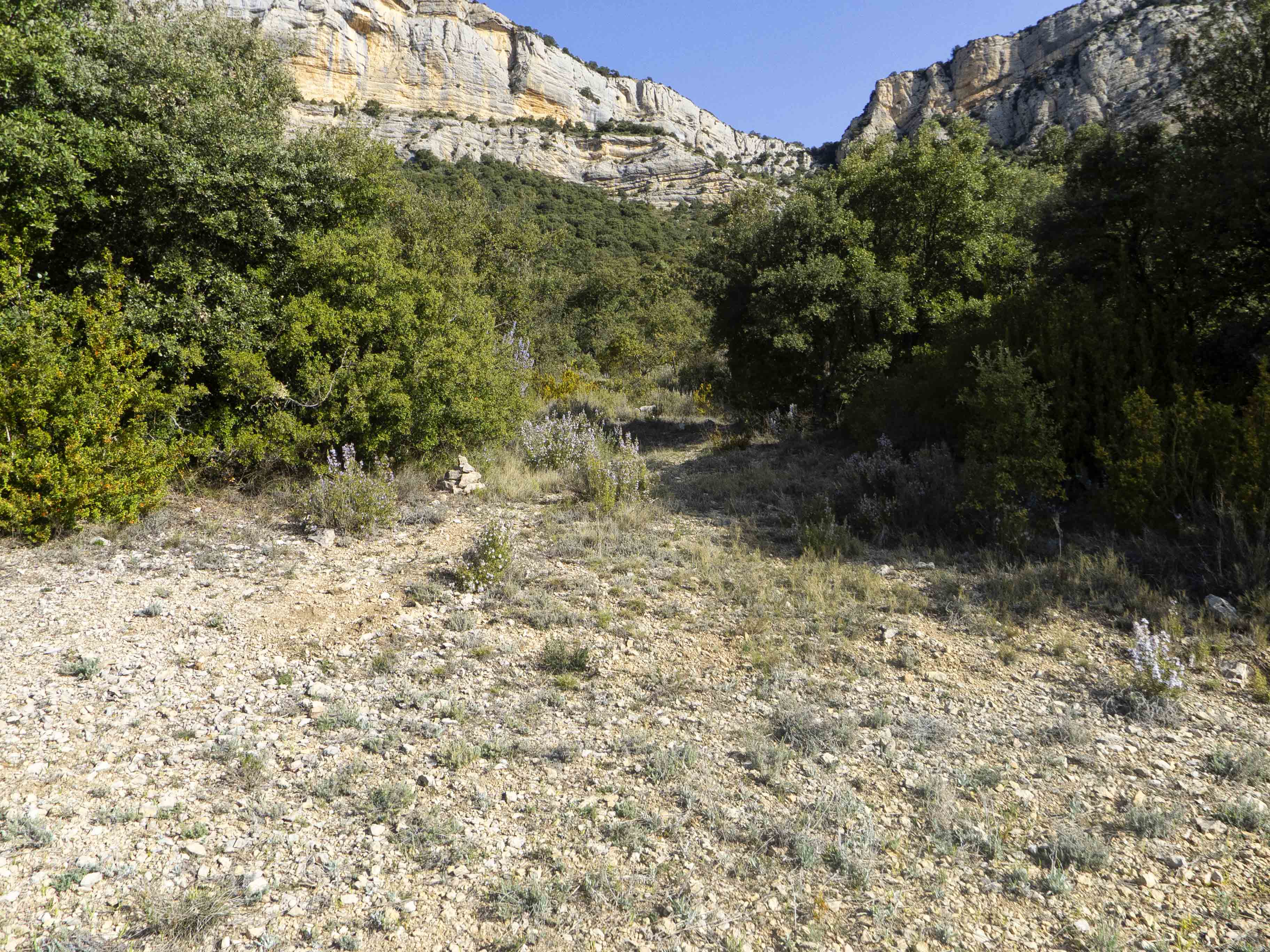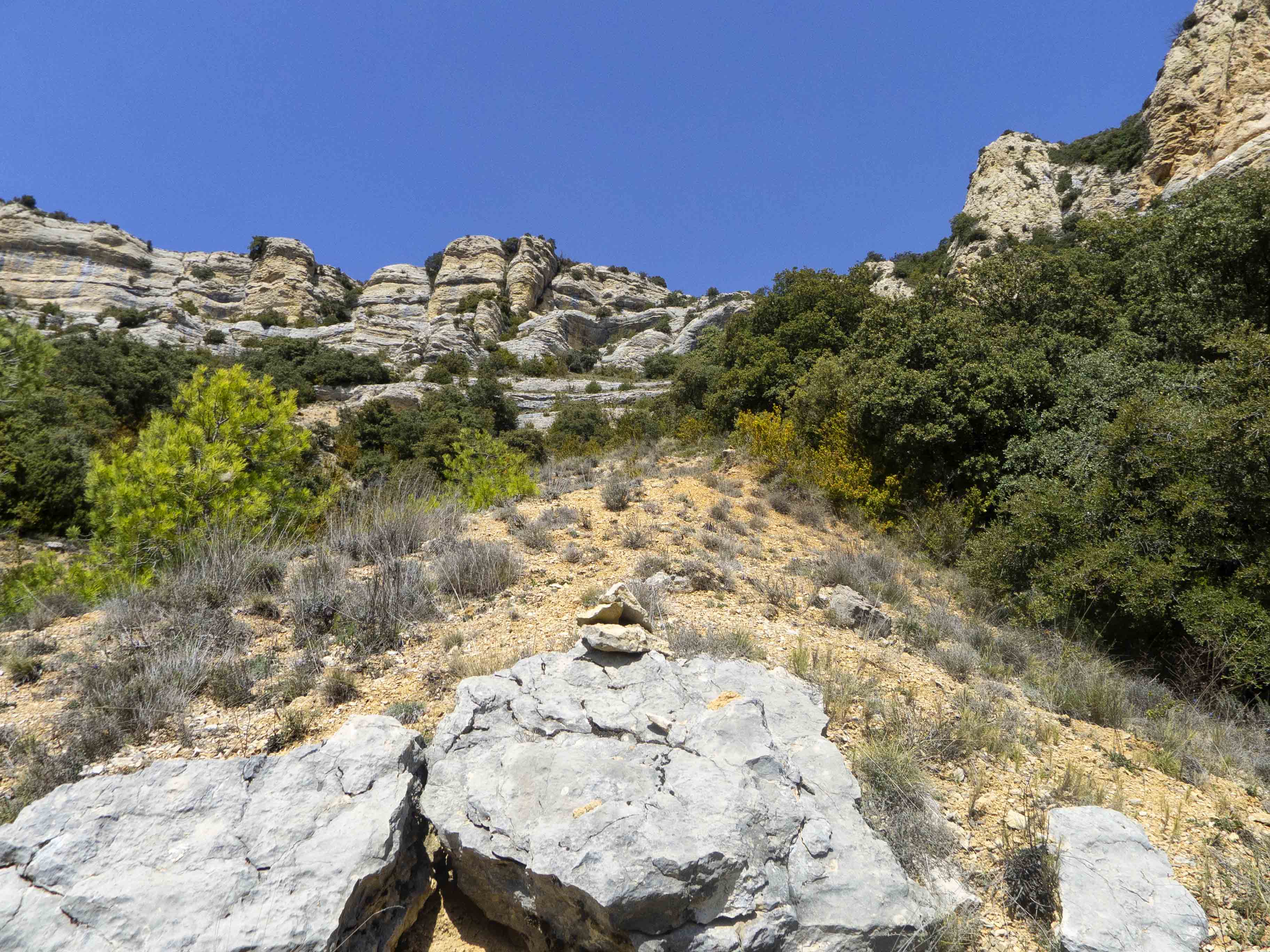 El terreno, al principio boscoso y con mucho arbusto, se va volviendo cada vez más pedregoso y empinado al acercarnos a las grandes paredes a las que nos dirigimos. Ya que el sendero se pierde rápidamente, siguiendo hitos tenemos que ir subiendo tendiendo a la derecha, acercándonos a la pared de la Roca dels Arcs.