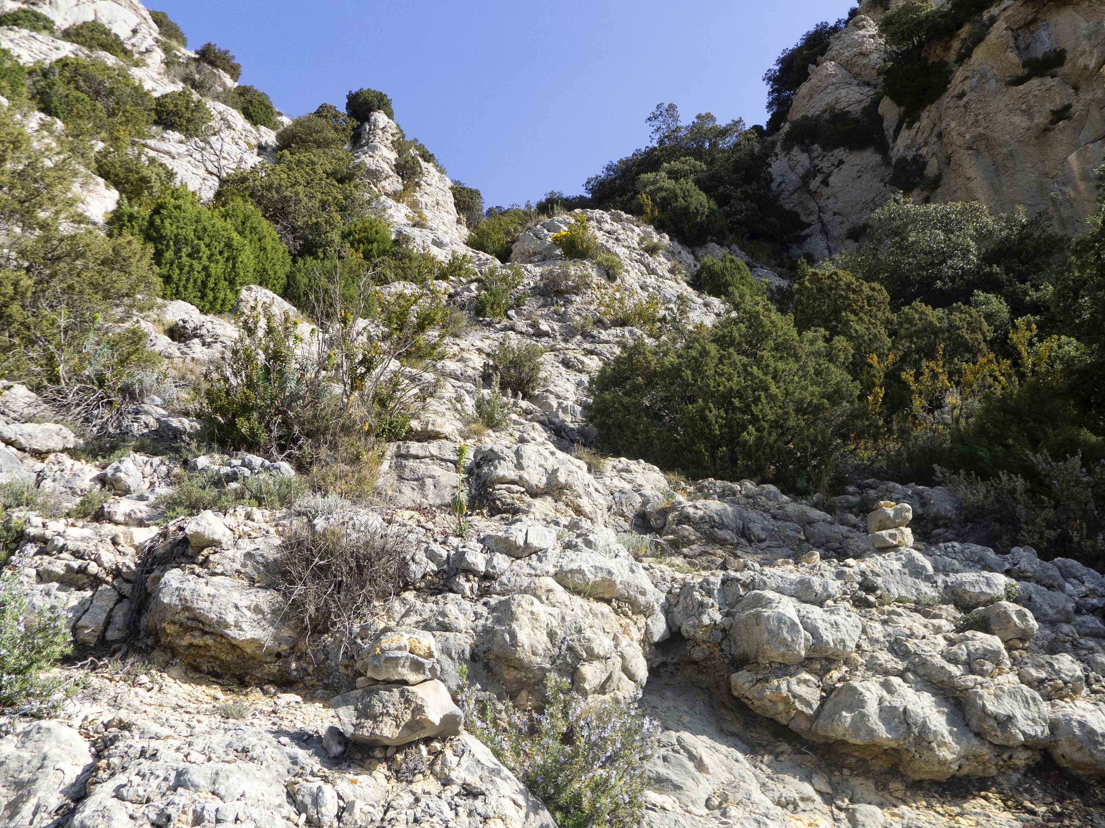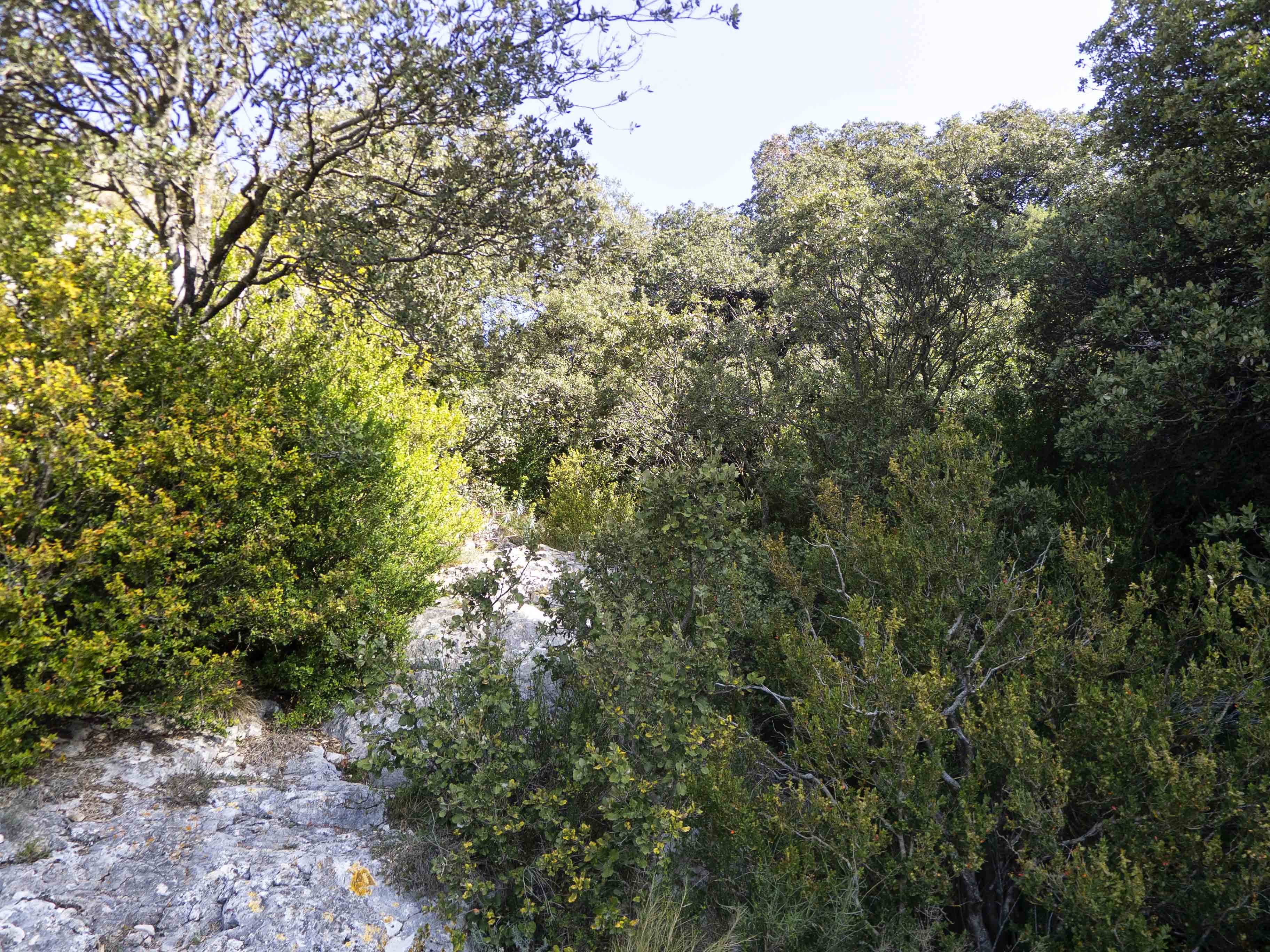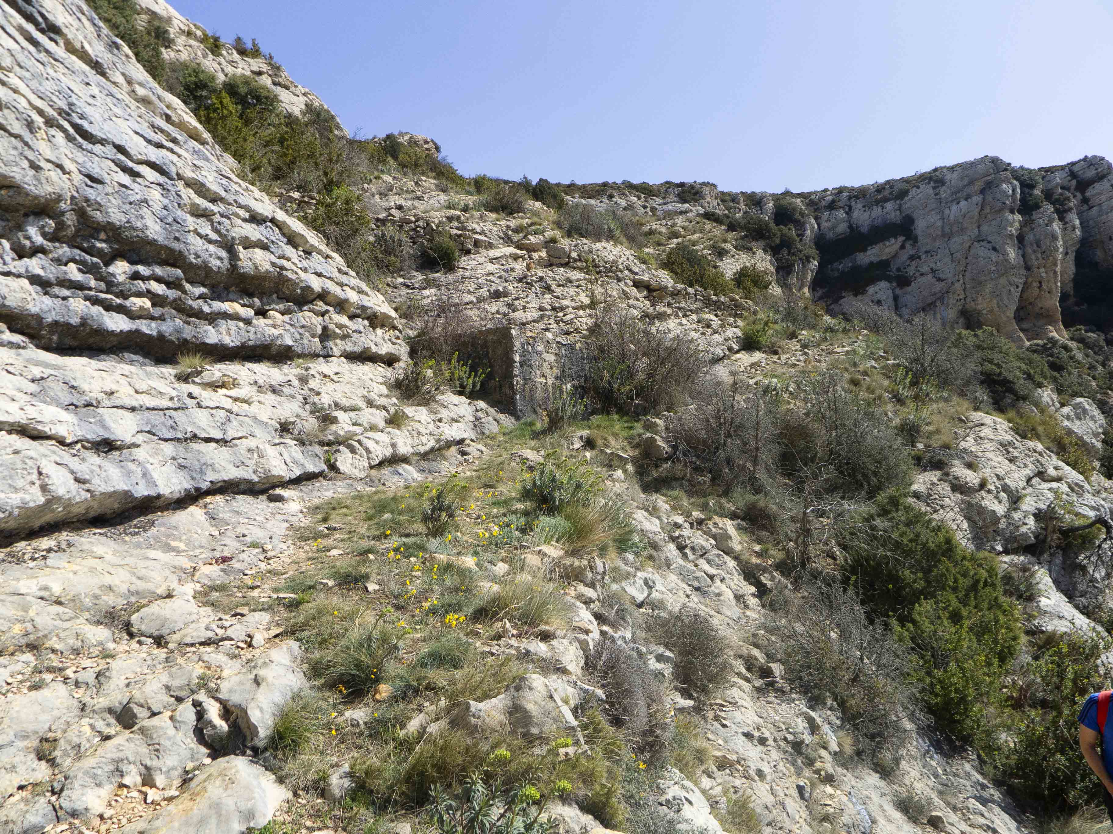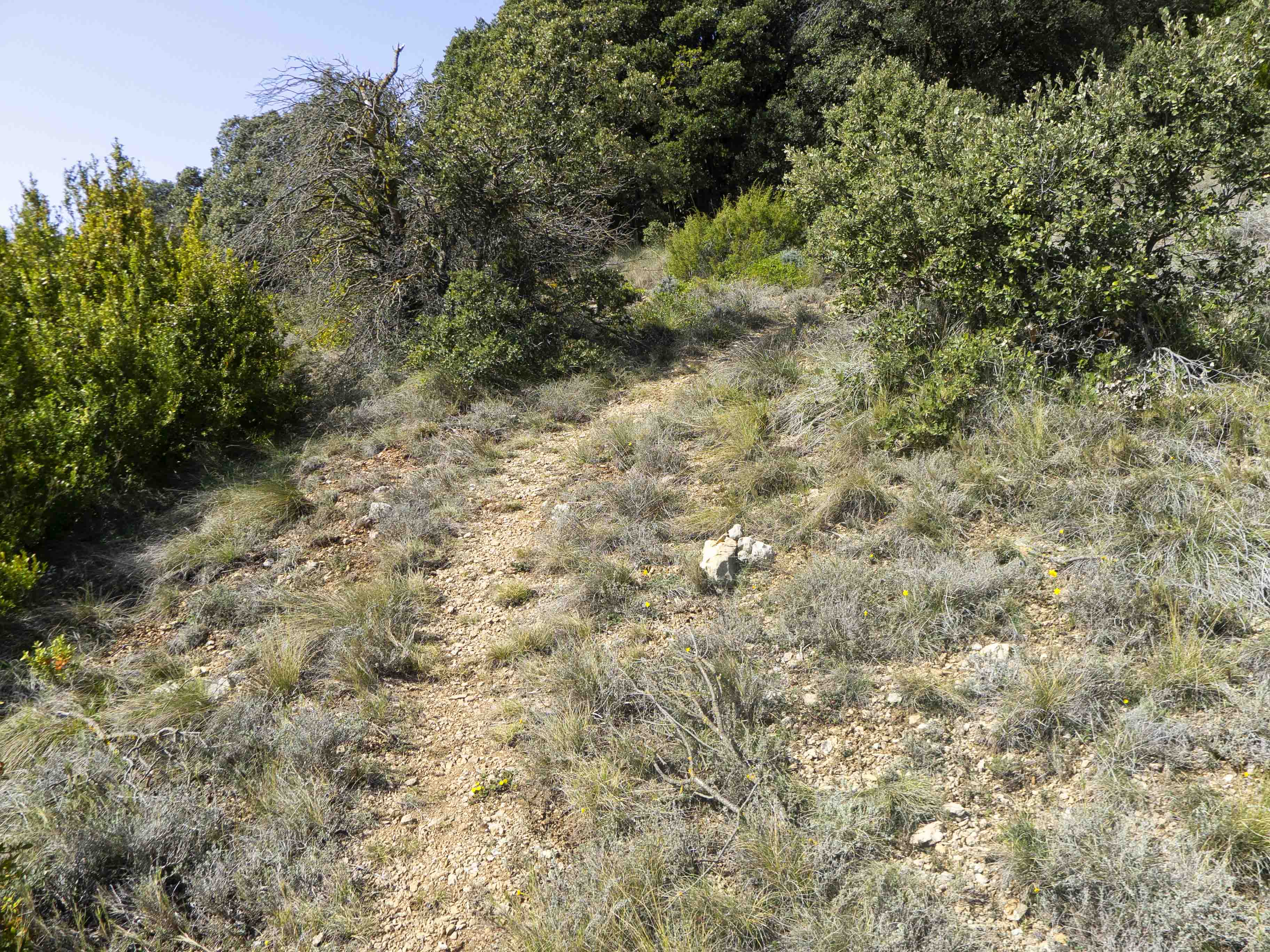 El terreno, al principio boscoso y con mucho arbusto, se va volviendo cada vez más pedregoso y empinado al acercarnos a las grandes paredes a las que nos dirigimos. Ya que el sendero se pierde rápidamente, siguiendo hitos tenemos que ir subiendo tendiendo a la derecha, acercándonos a la pared de la Roca dels Arcs.