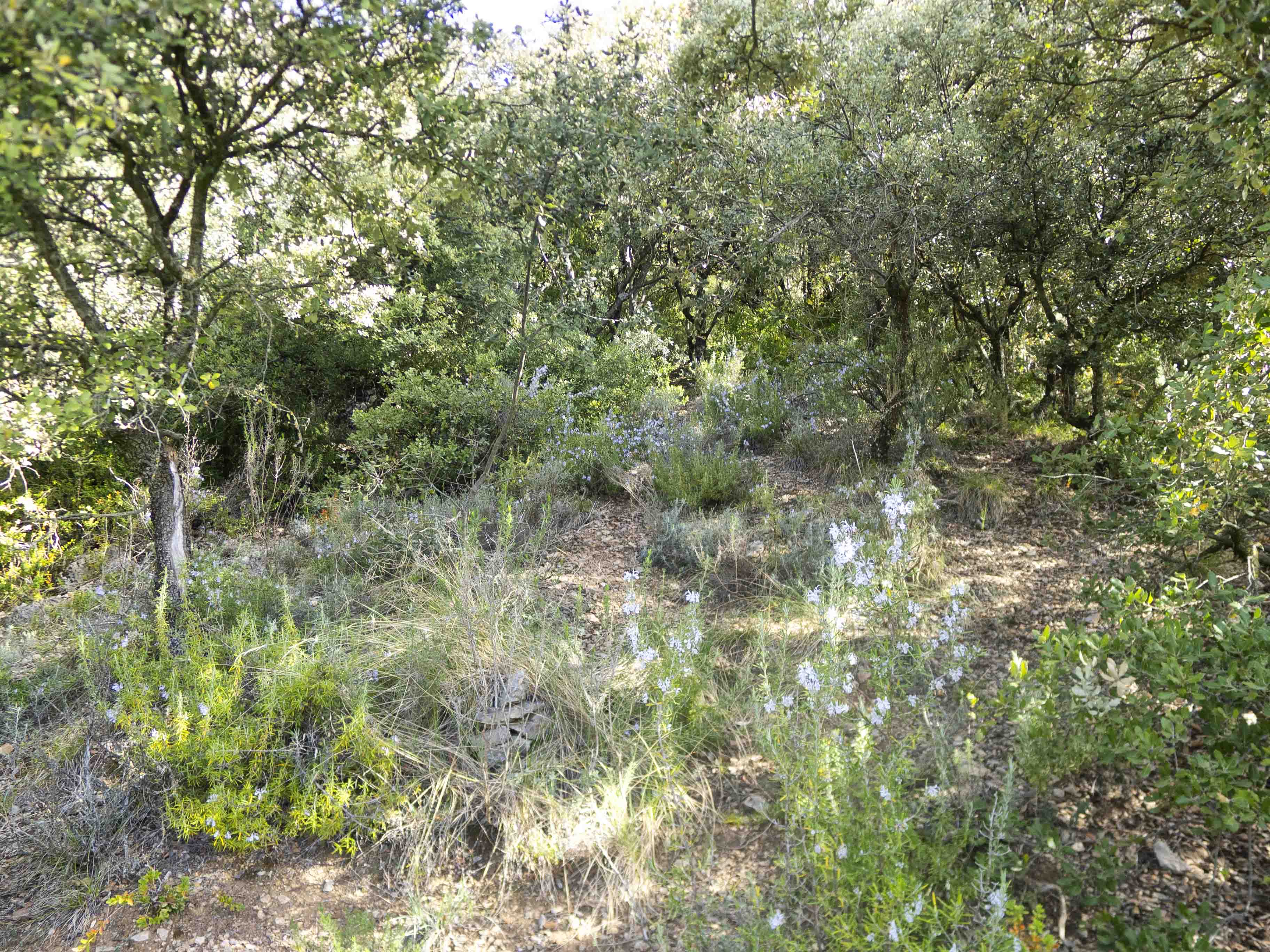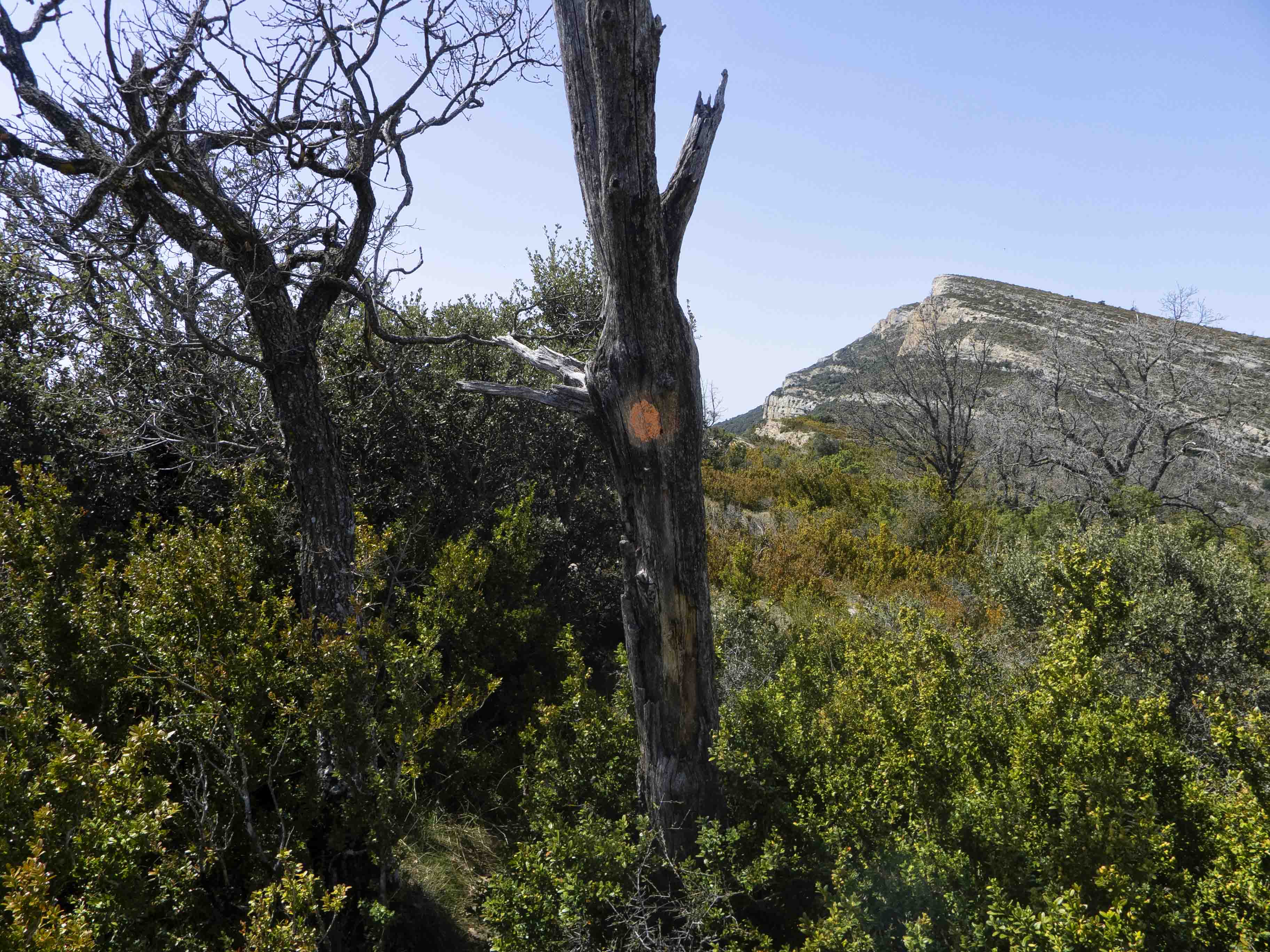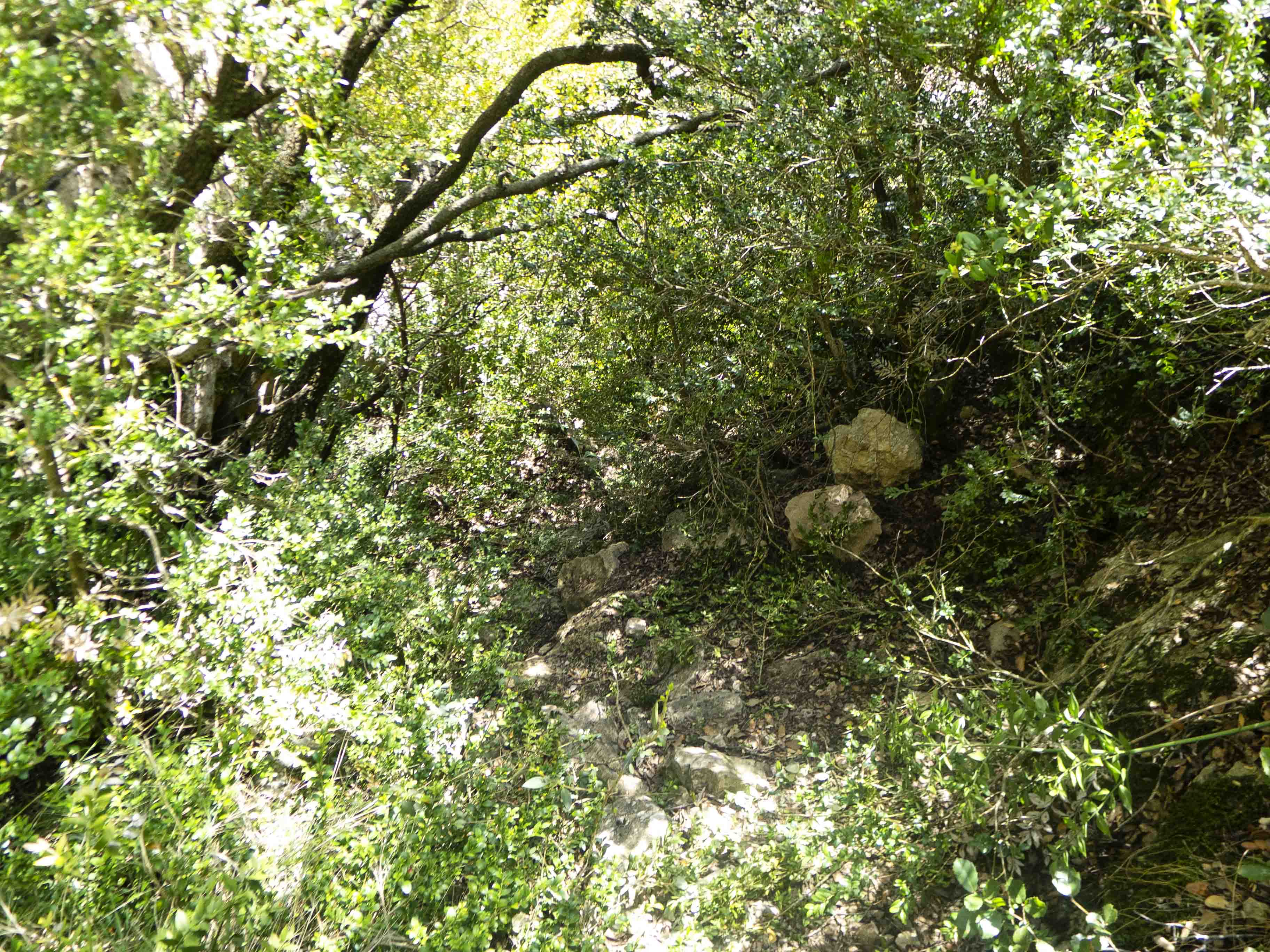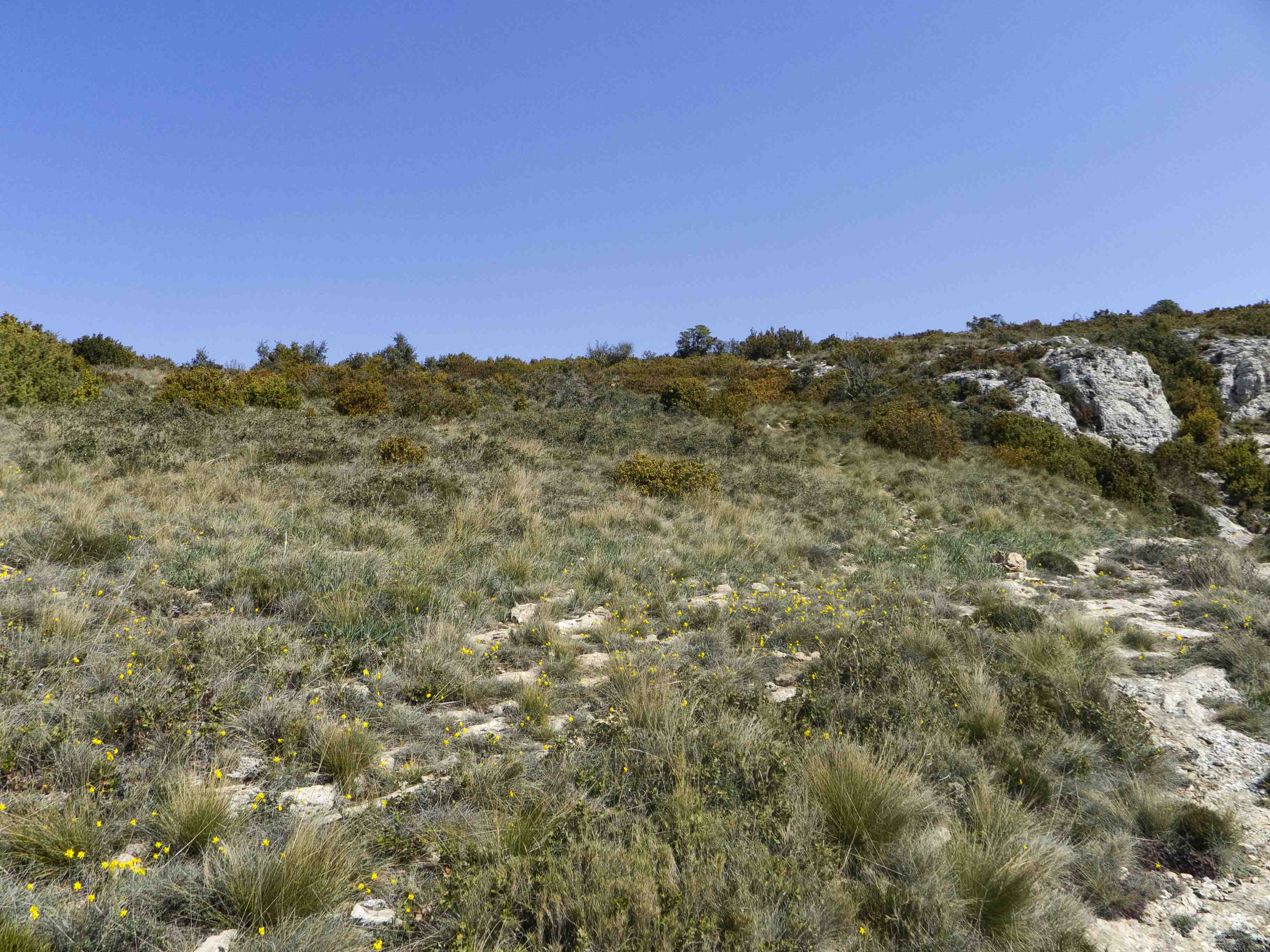 El terreno, al principio boscoso y con mucho arbusto, se va volviendo cada vez más pedregoso y empinado al acercarnos a las grandes paredes a las que nos dirigimos. Ya que el sendero se pierde rápidamente, siguiendo hitos tenemos que ir subiendo tendiendo a la derecha, acercándonos a la pared de la Roca dels Arcs.