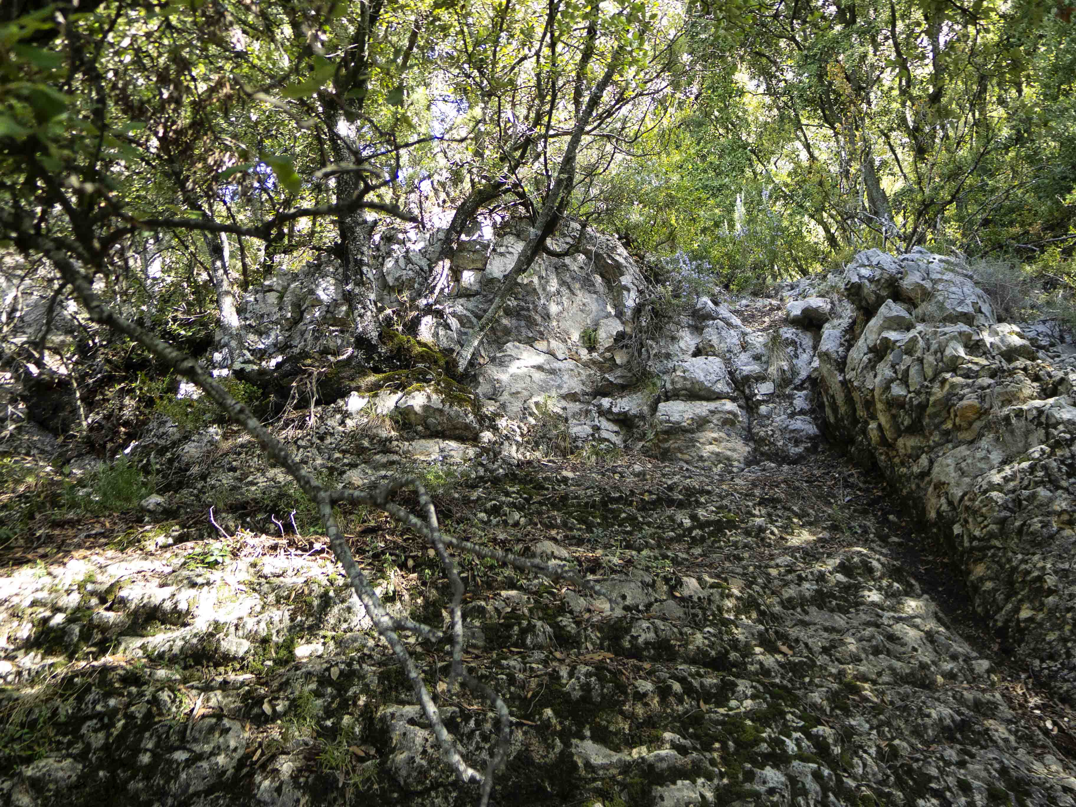 Después de un tramo muy empinado de bosque, empieza a aparecer la roca, unos resaltes rocosos que aparecen en la base del grau.