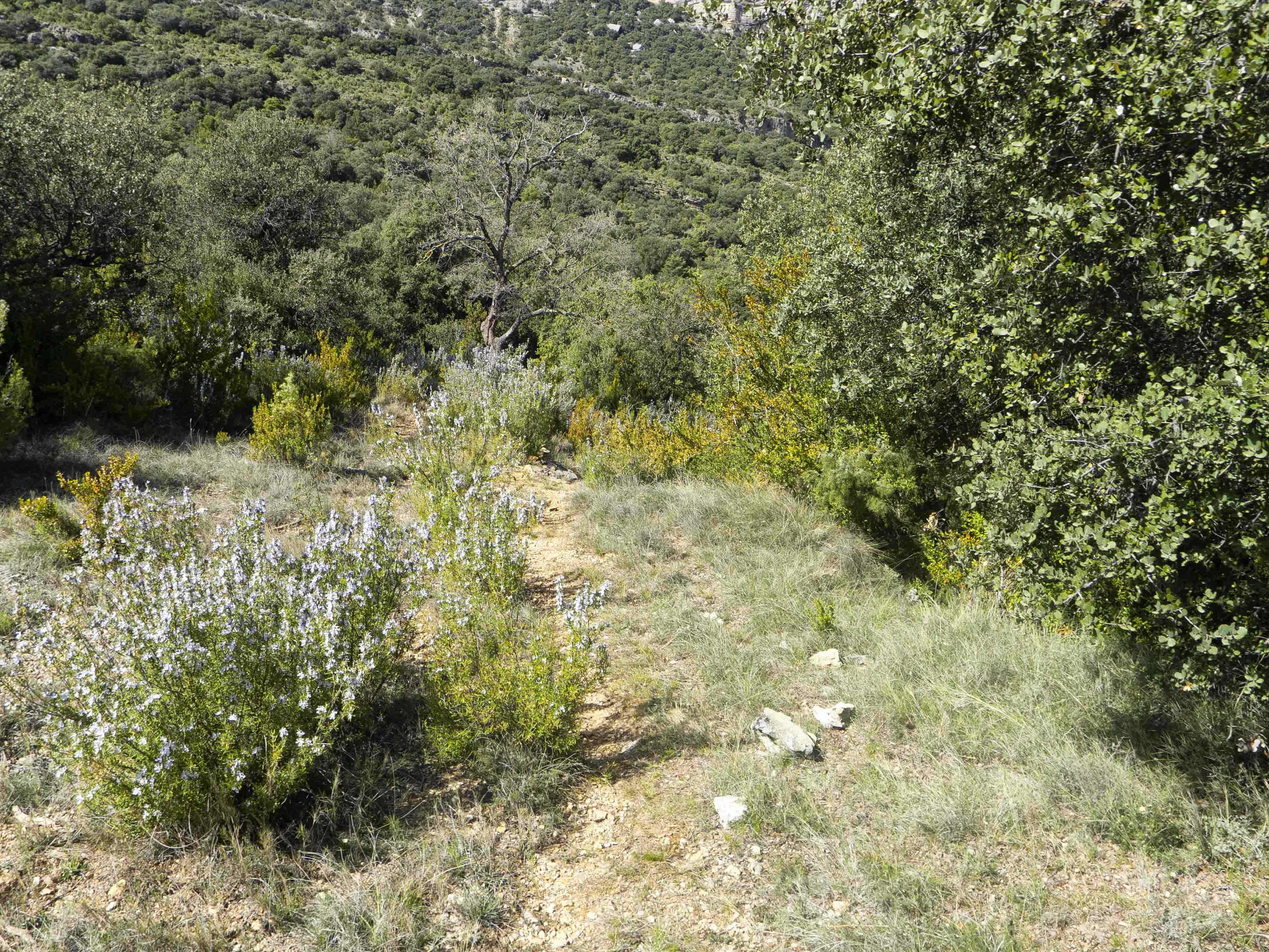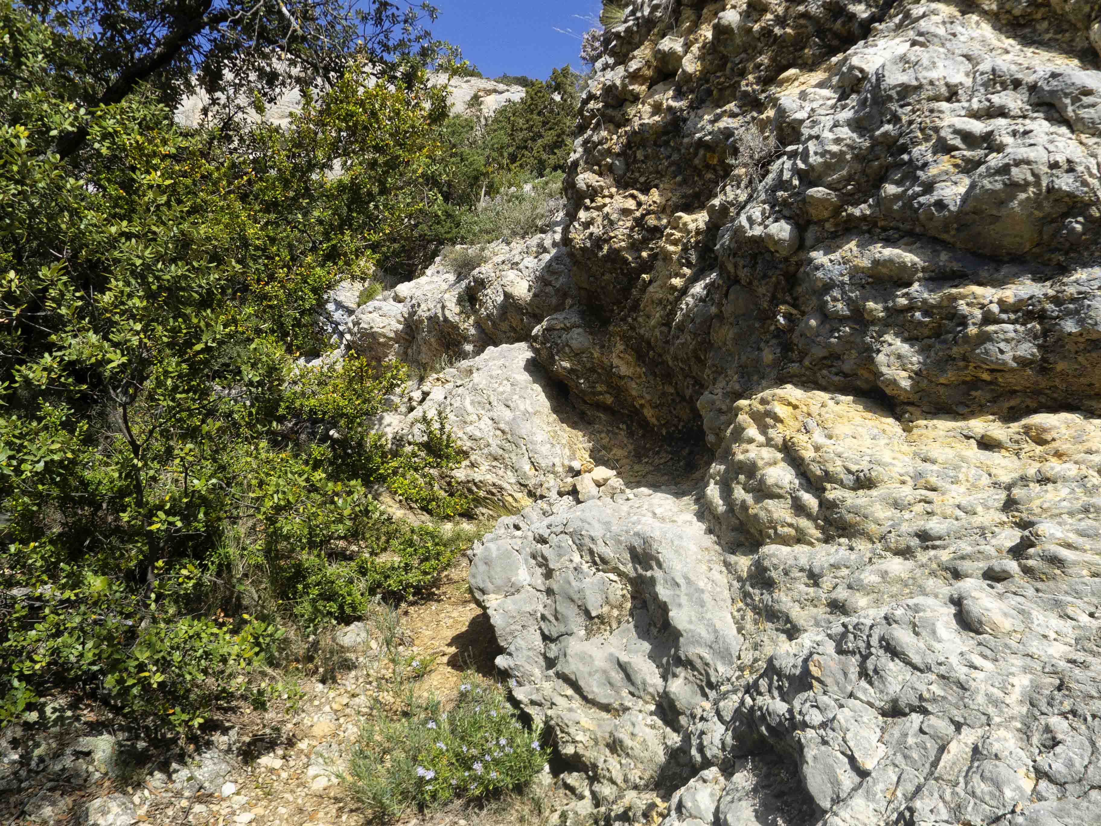El sendero primero tiene que pasar bajo la pared del Nerill, pasando por varias pedreras que caen de las murallas y perdiéndose en ocasiones entre los matorrales.