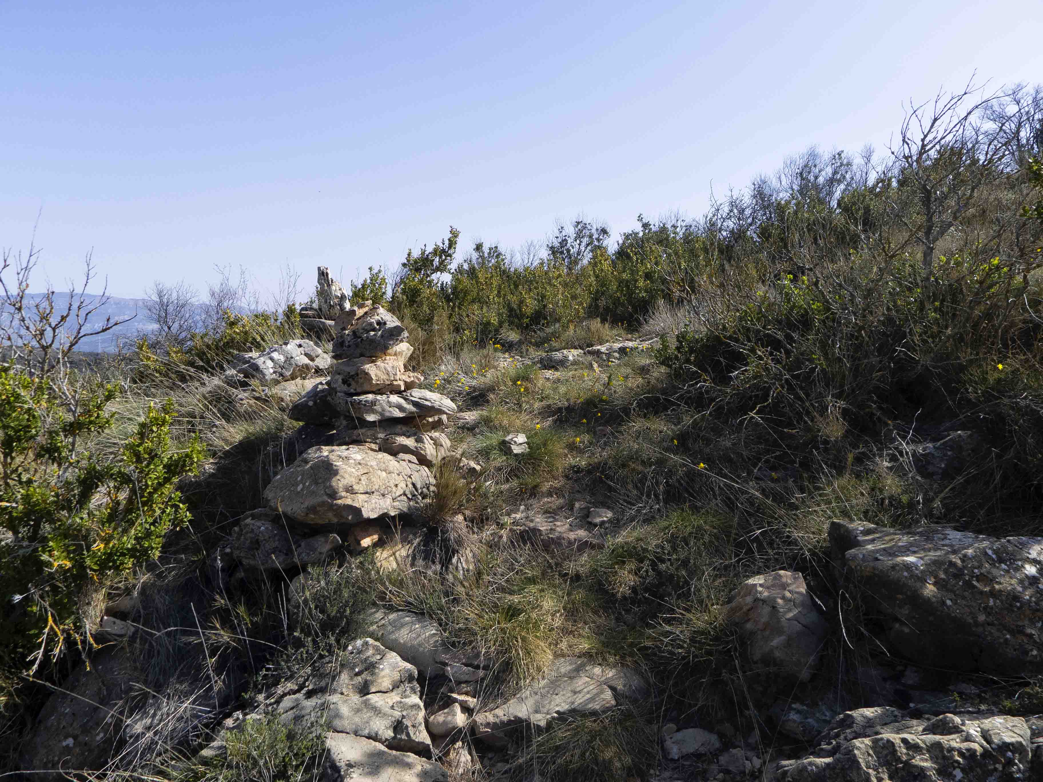 Este gran hito señala el sendero que, en pocos minutos, nos conducirá a la cumbre de la Roca dels Arcs mediante un claro sendero, seguramente definido por los múltiples escaladores de la zona.