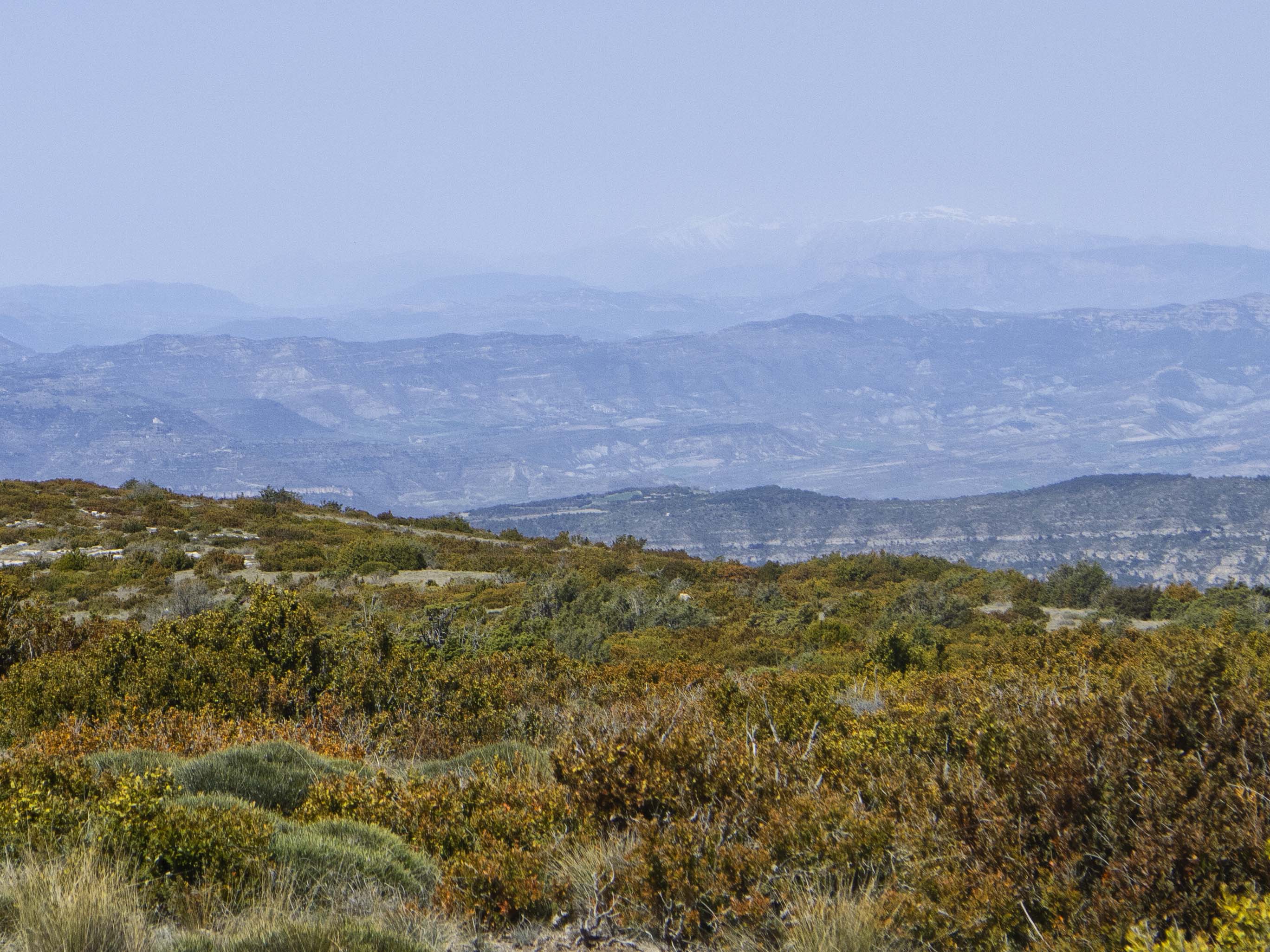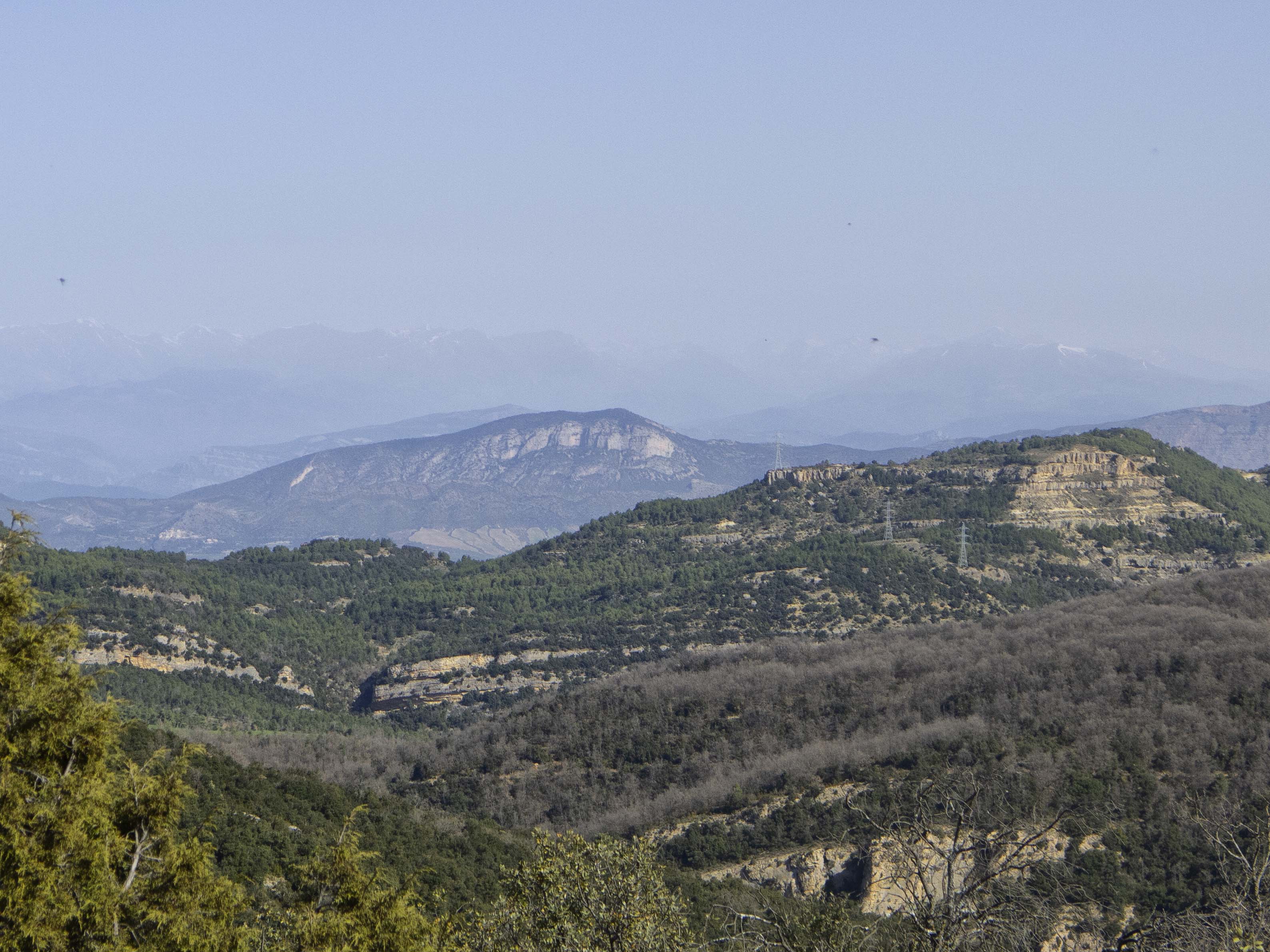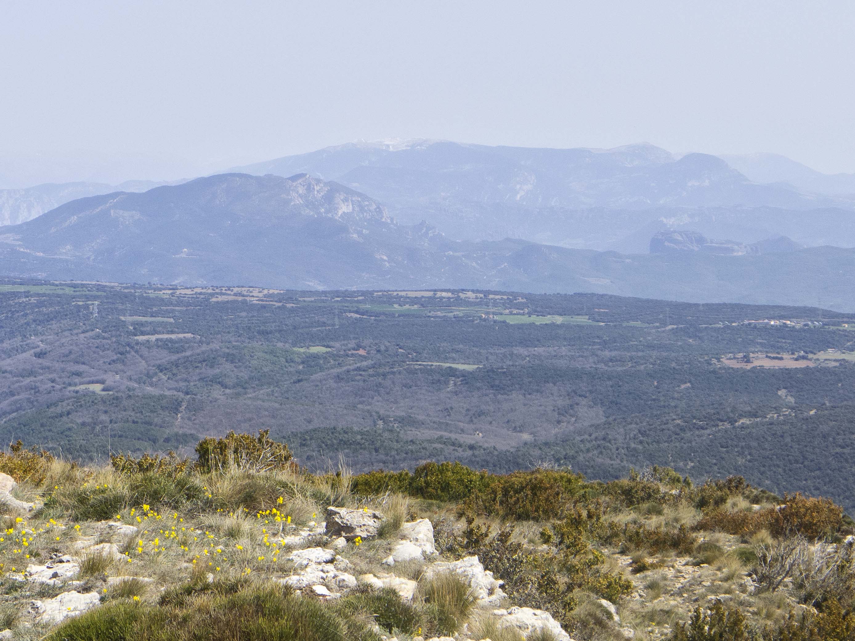 Al norte, tras la Serra de Montllobar y el Sis, apenas se aprecia el Turbón y el Cotiella, con la nieve manchando solo las partes altas.