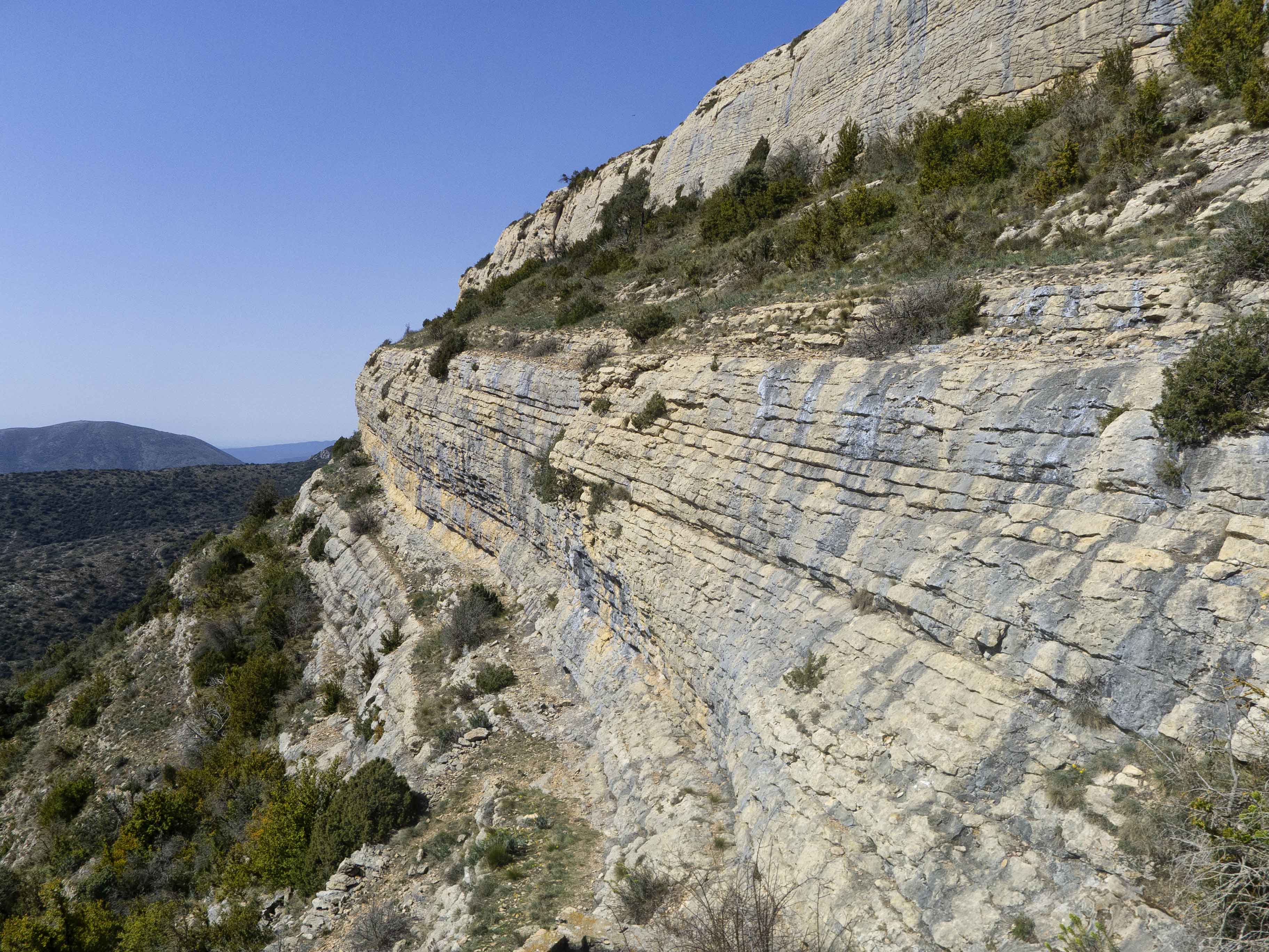 Mientras bajamos, podemos ver la complejidad de los estratos calcáreos del Montsec.