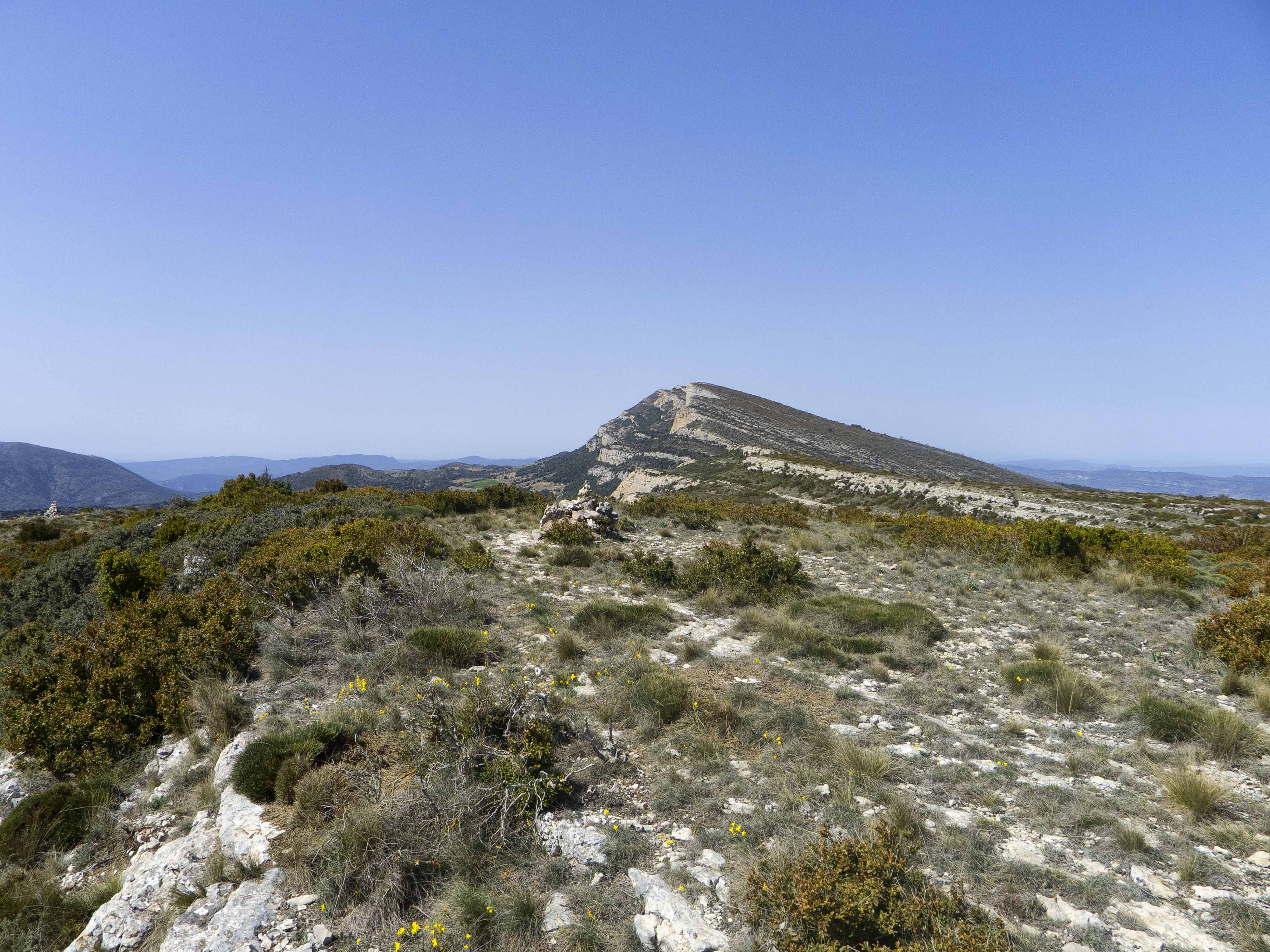 Tras descansar un rato en la cumbre nos disponemos a seguir, ahora en dirección oeste, teniendo como referencia el Puig del Camí Ramader y sus dientes, cumbre donde el Montsec de Rúbies emerge con fuerza y mantiene su altura durante varios kilómetros. Justo antes de esta cumbre se encuentra el Pas de les Eugues, final del sector oriental del Montsec de Rúbies y por donde abandonaremos el cordal.