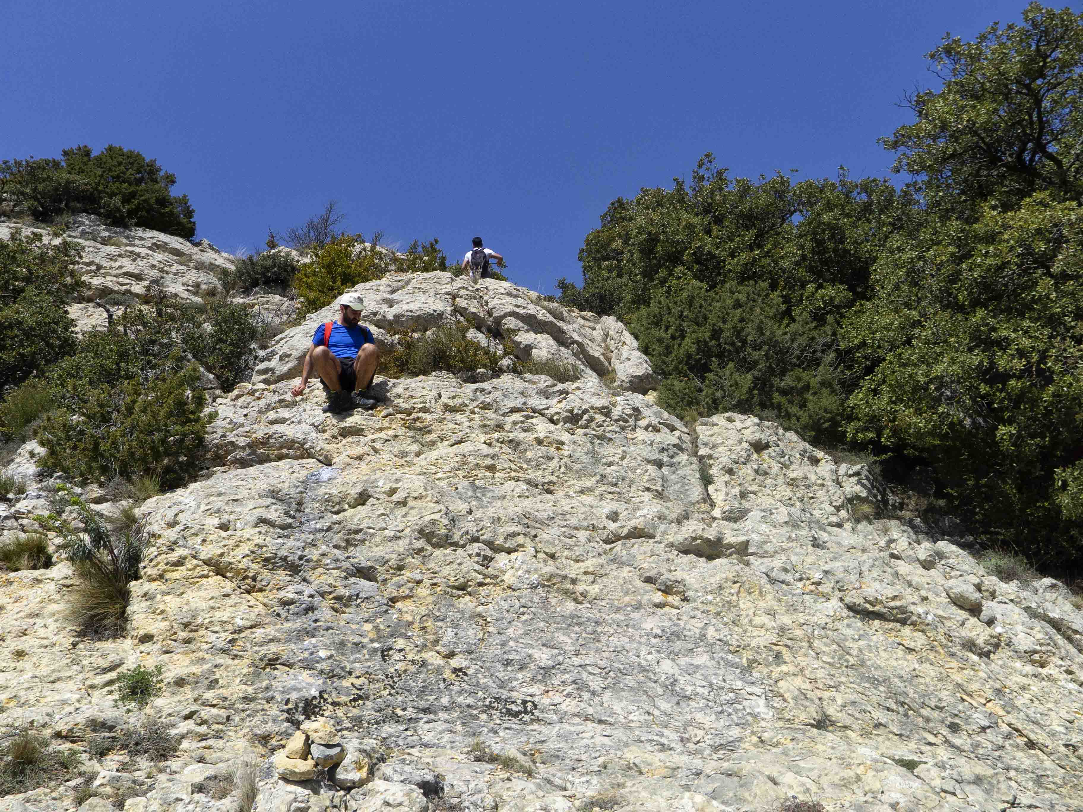 Cumbre de la Roca dels Arcs. Al este, las paredes de lo Pelat marcan la entrada al Congost de l’Escala del Pas Nou juntamente con el paredón en el que estamos ahora mismo.