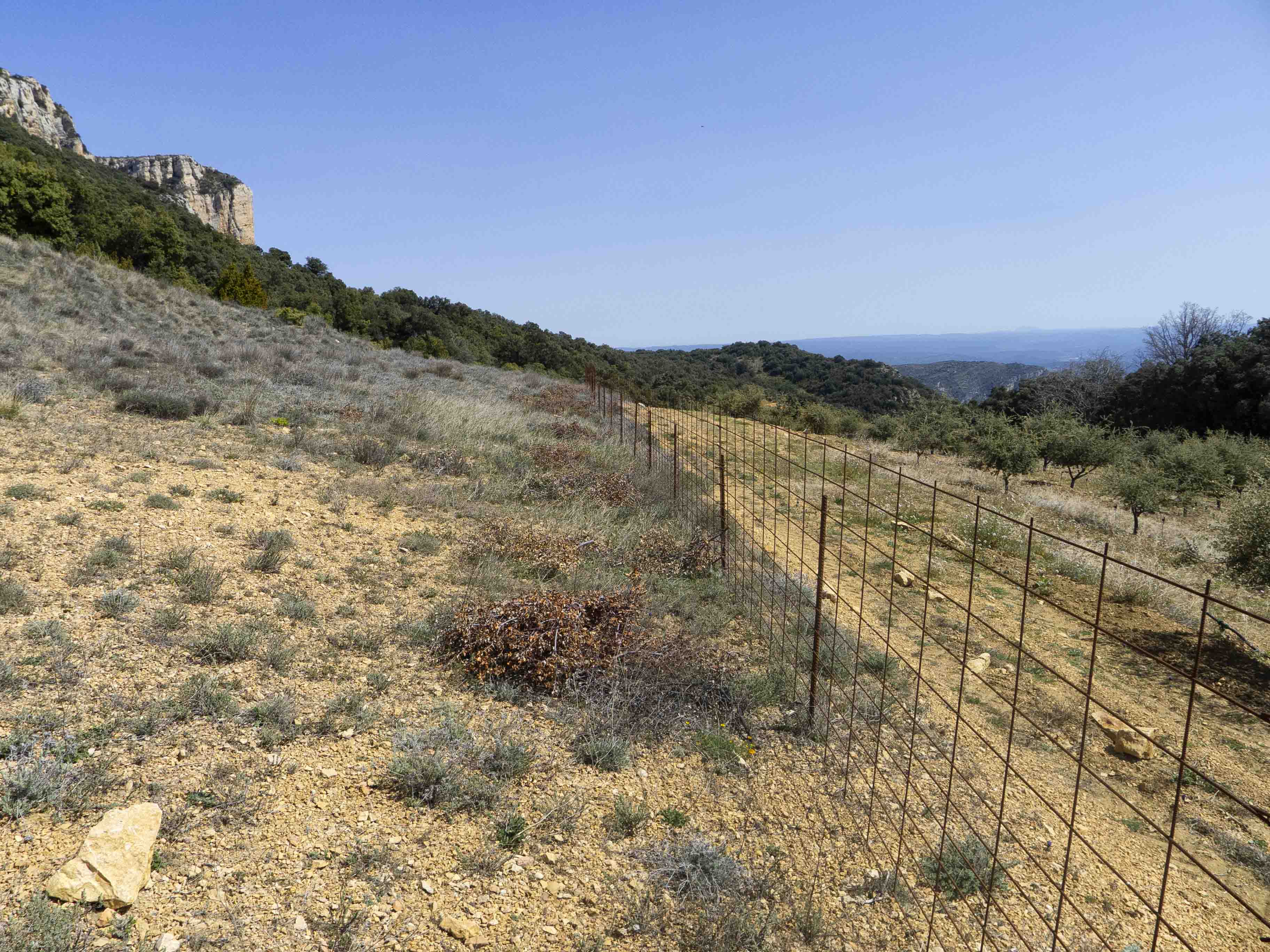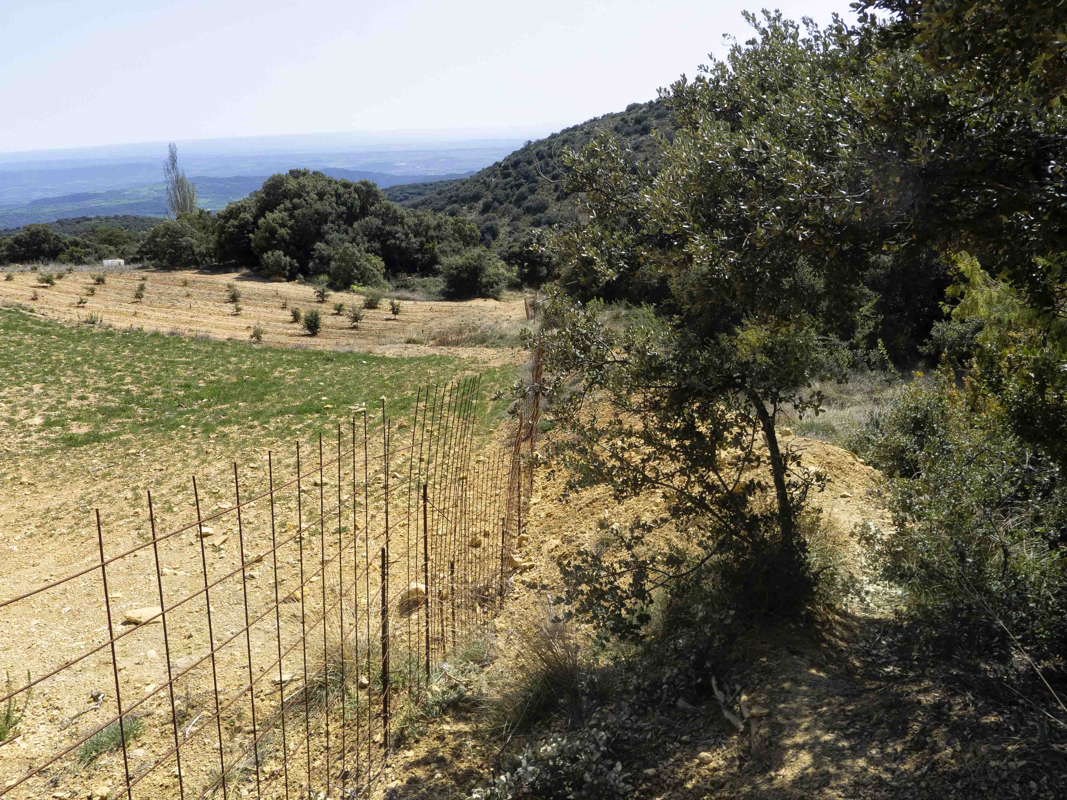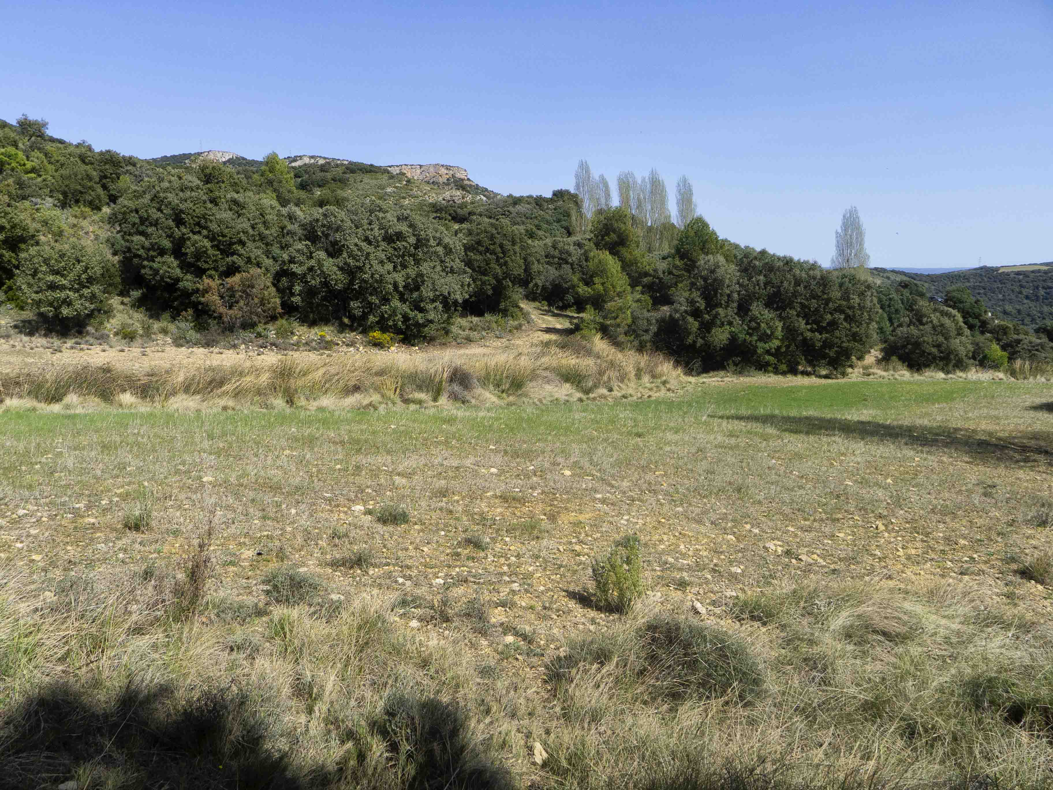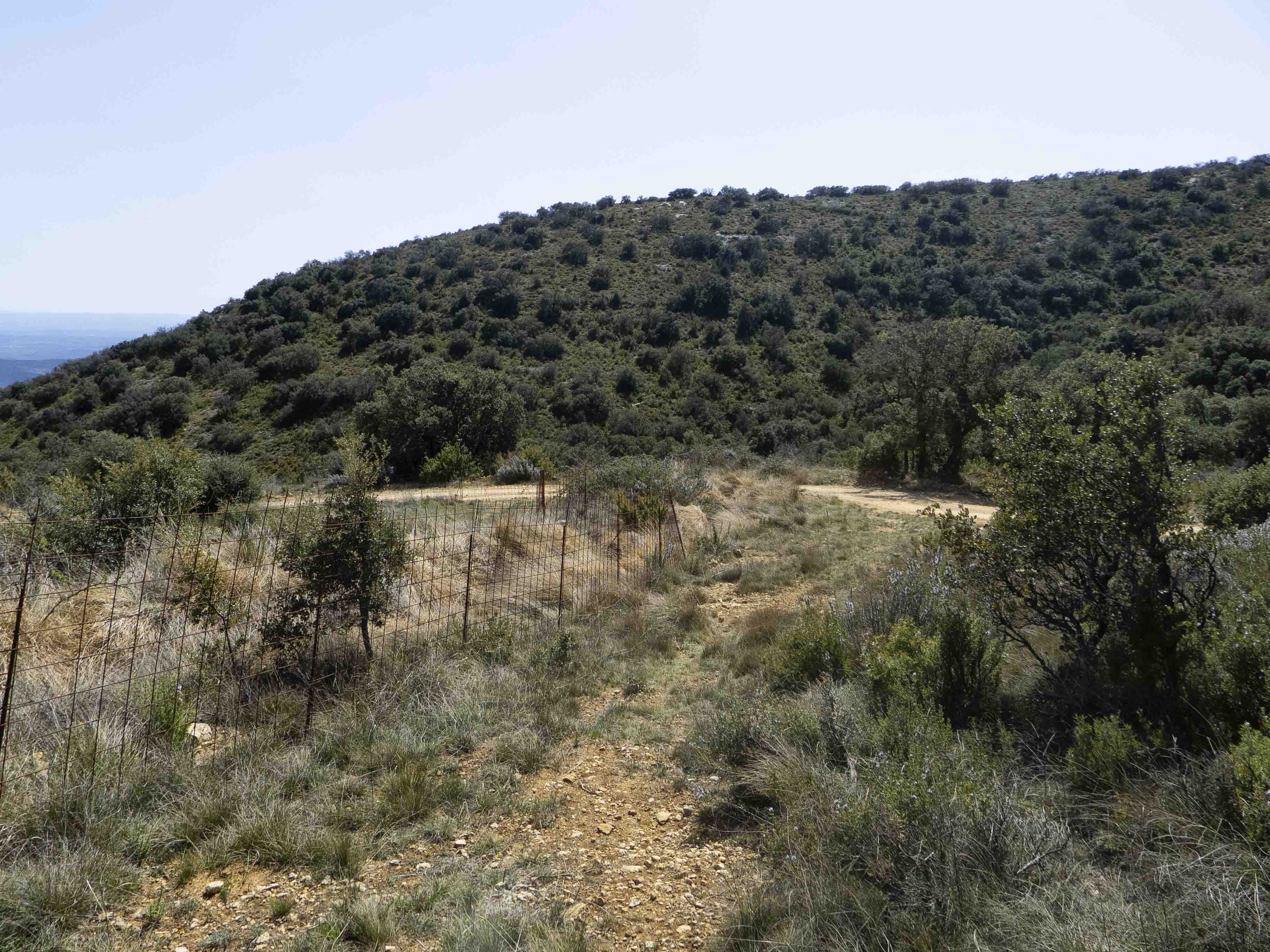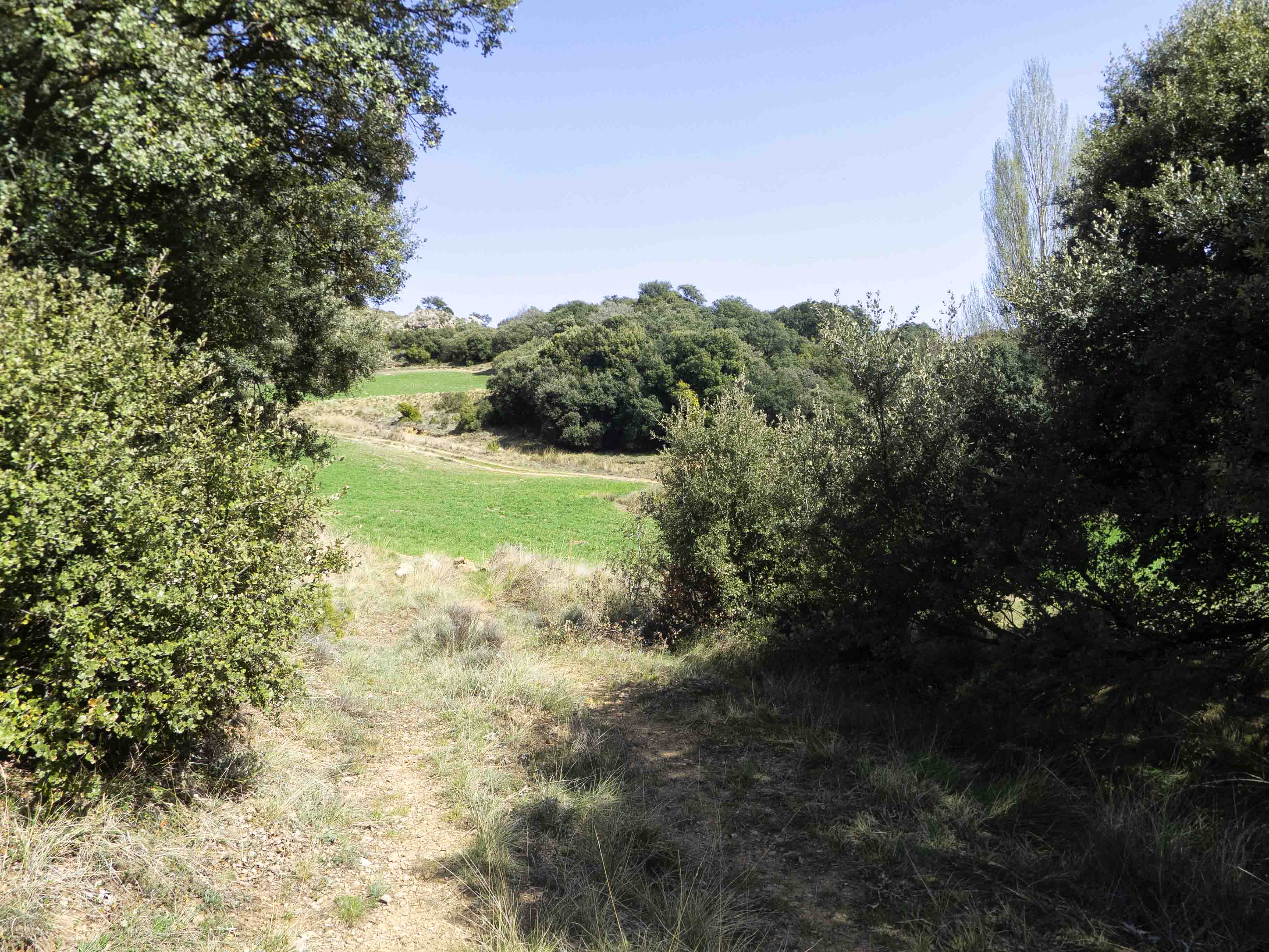 Al llegar al final del campo, nos encontramos con otro que también está vallado, pero afortunadamente entre ambos se abre un pasillo en dirección sur que utilizamos para, al fin, llegar a la Pista del Montsec, por la que volveremos a les Costes de l'Isaac.