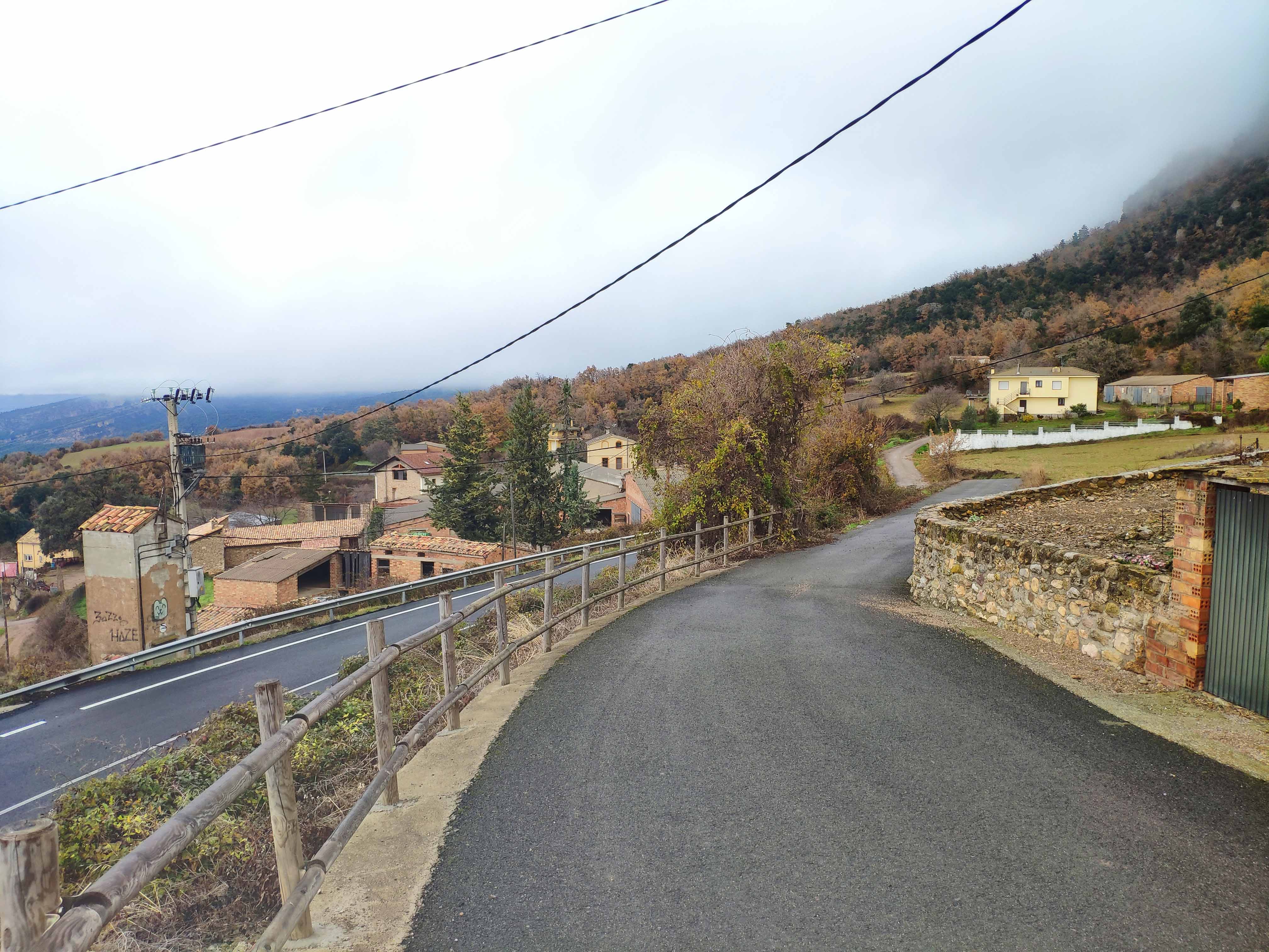 Tras haber perdido bastante desnivel, el sendero vuelve a girar hacia el norte y llega a un prado que toca a la carretera, punto donde se pierde momentáneamente. Aquí podríamos seguir la carretera hasta el pueblo, que queda a un kilómetro aproximadamente, pero si se cruza el prado en diagonal el sendero vuelve a aparecer.