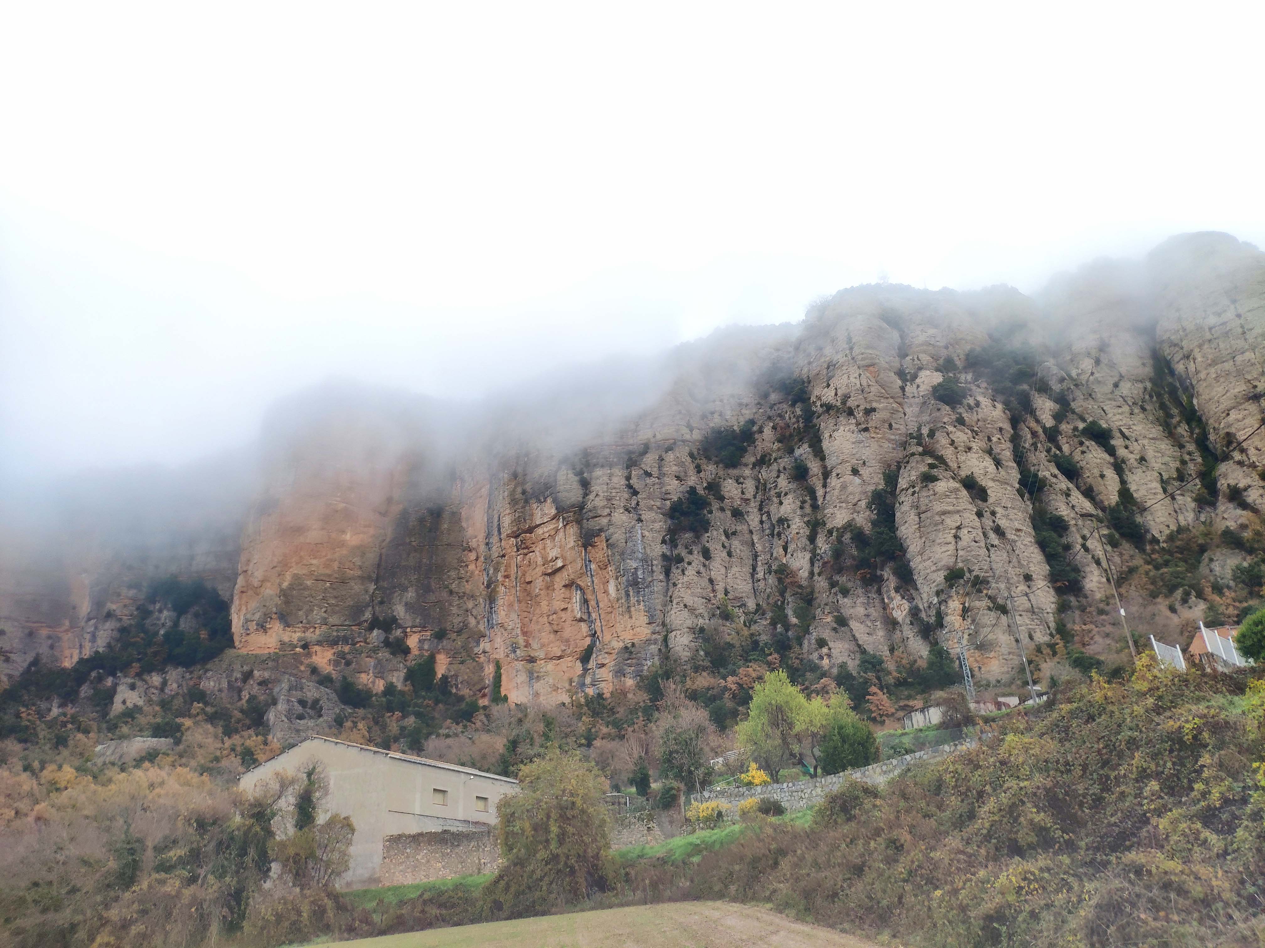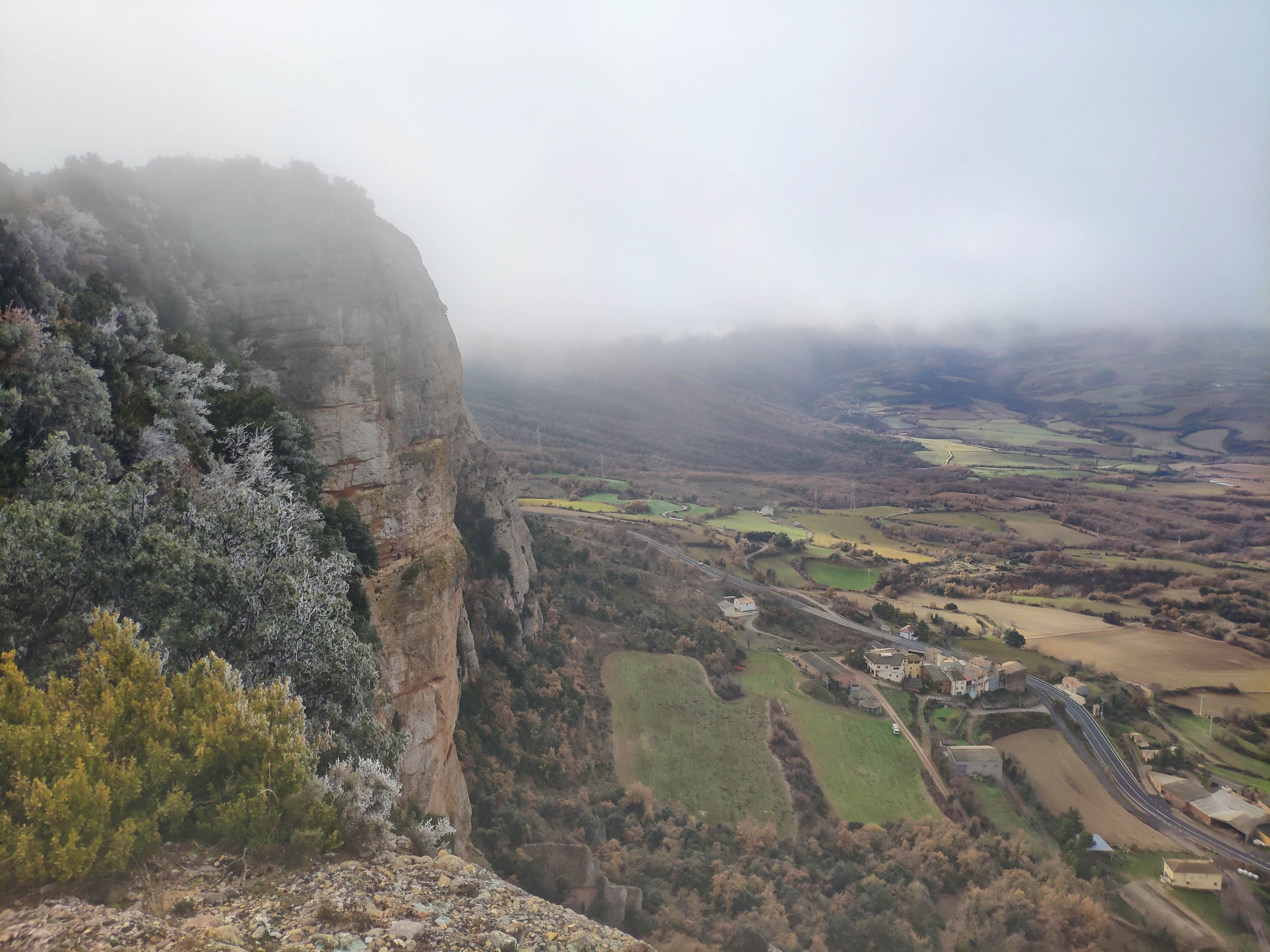 La niebla no solo cubre el valle, también las alturas. La Roca Roja de Benavent, única cumbre con nombre de la sierra, vigila el pueblo desde sus paredes de más de 200 metros.