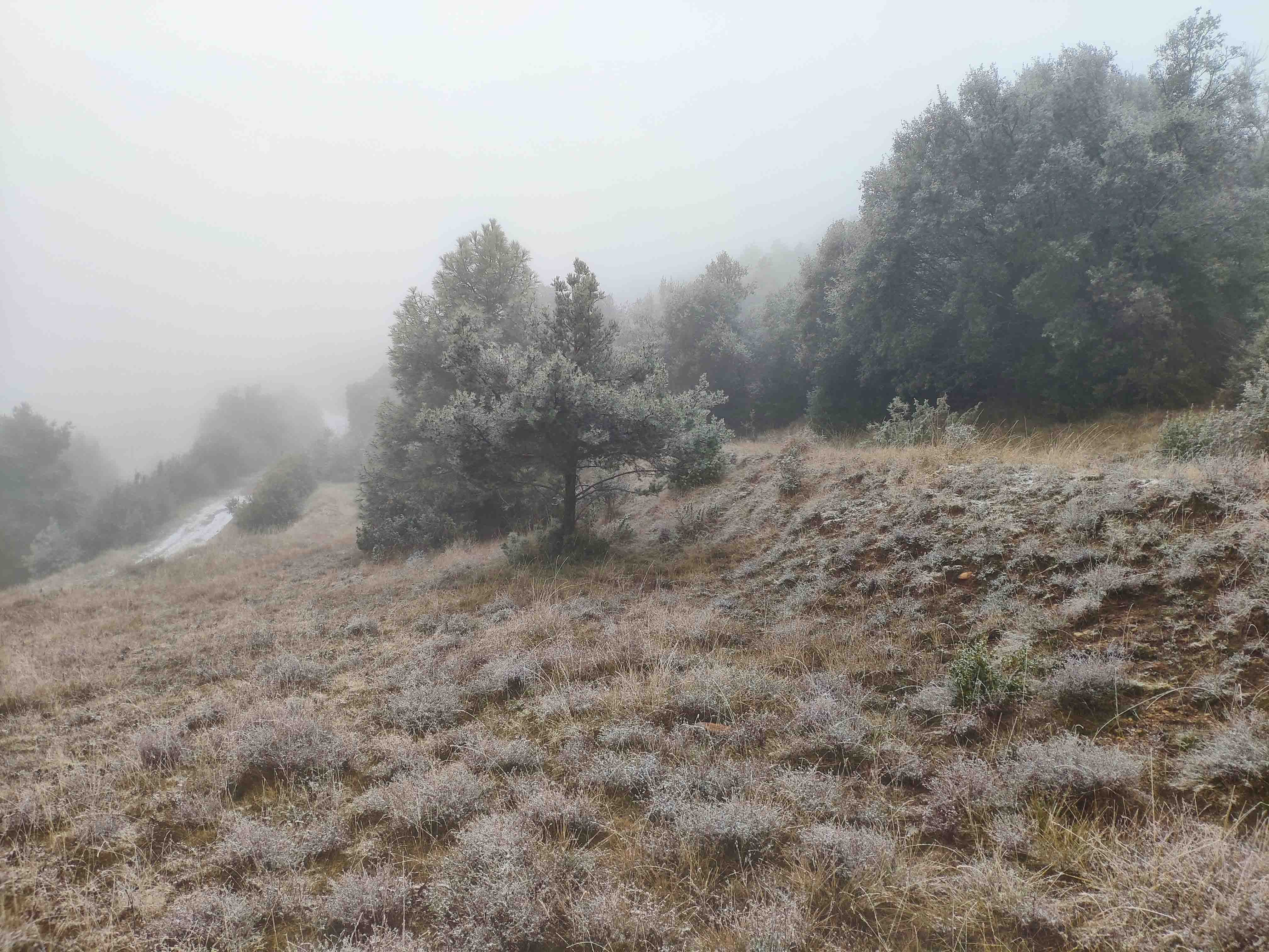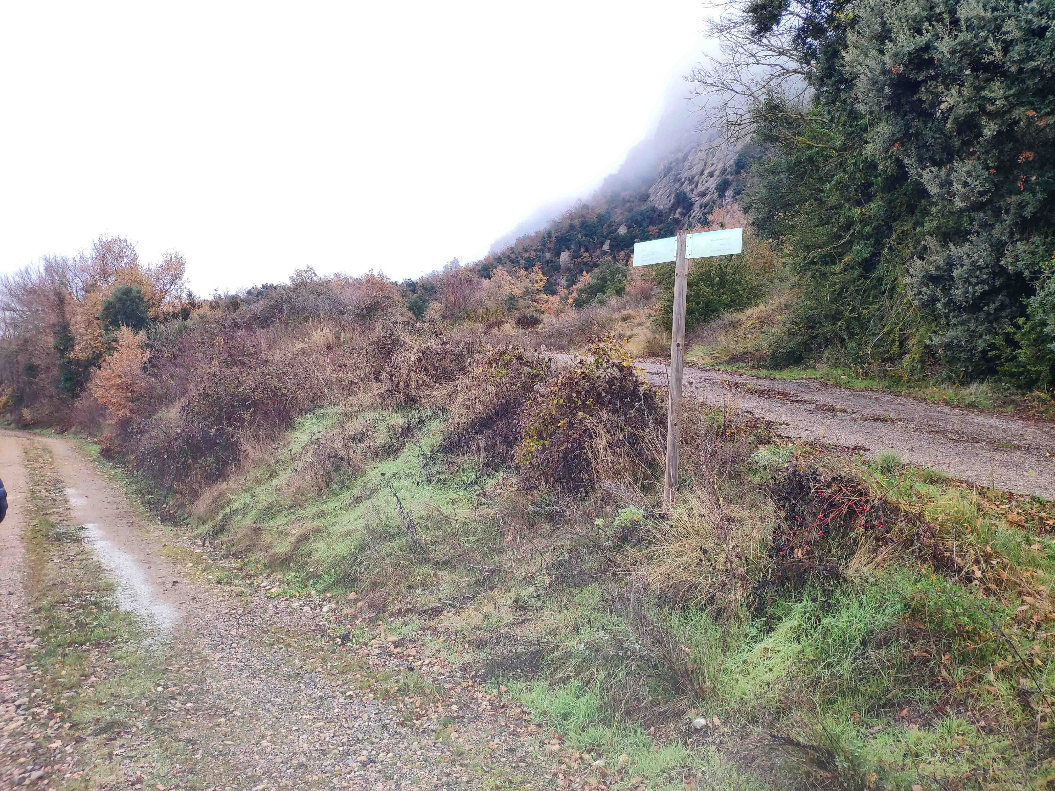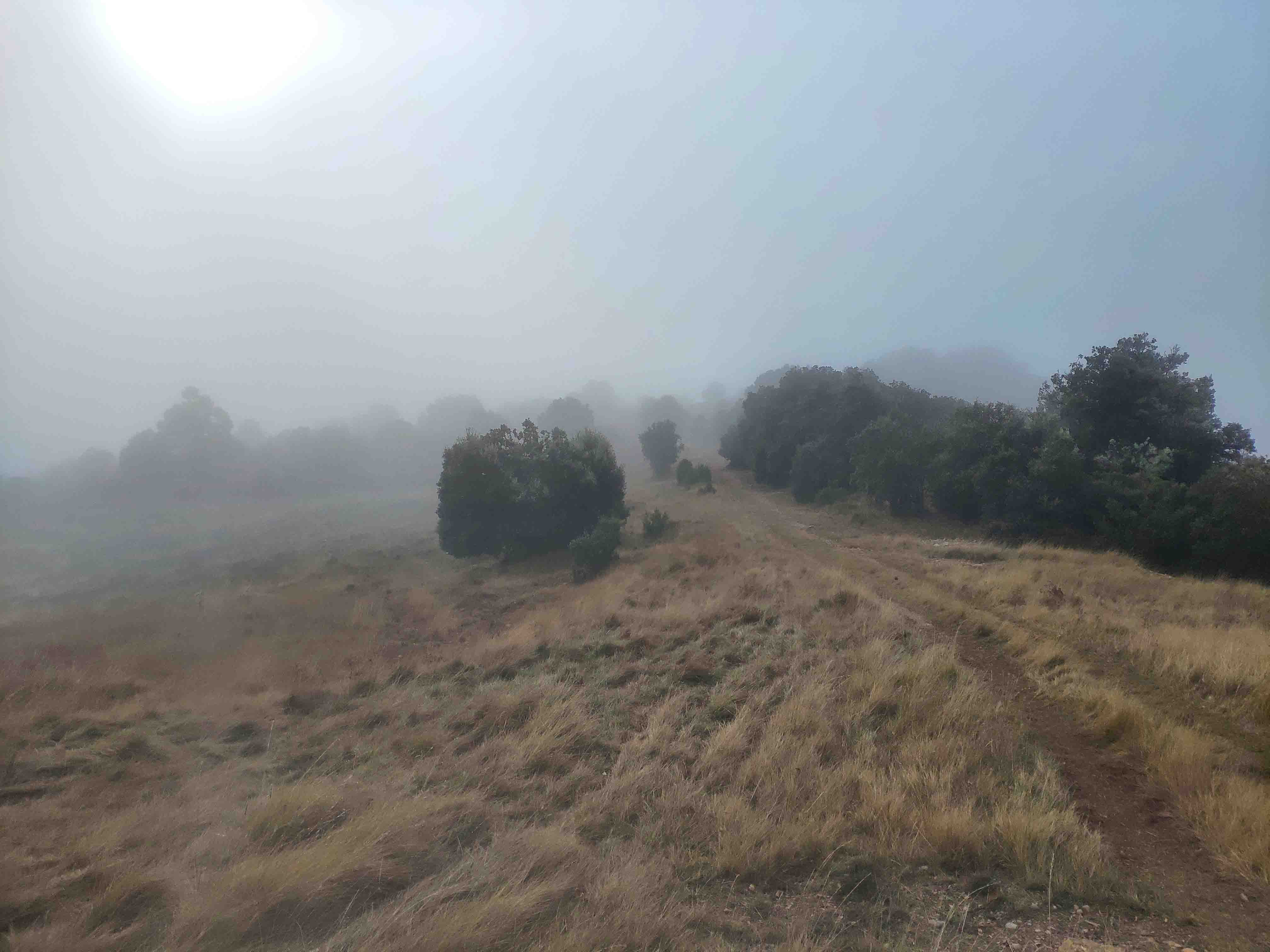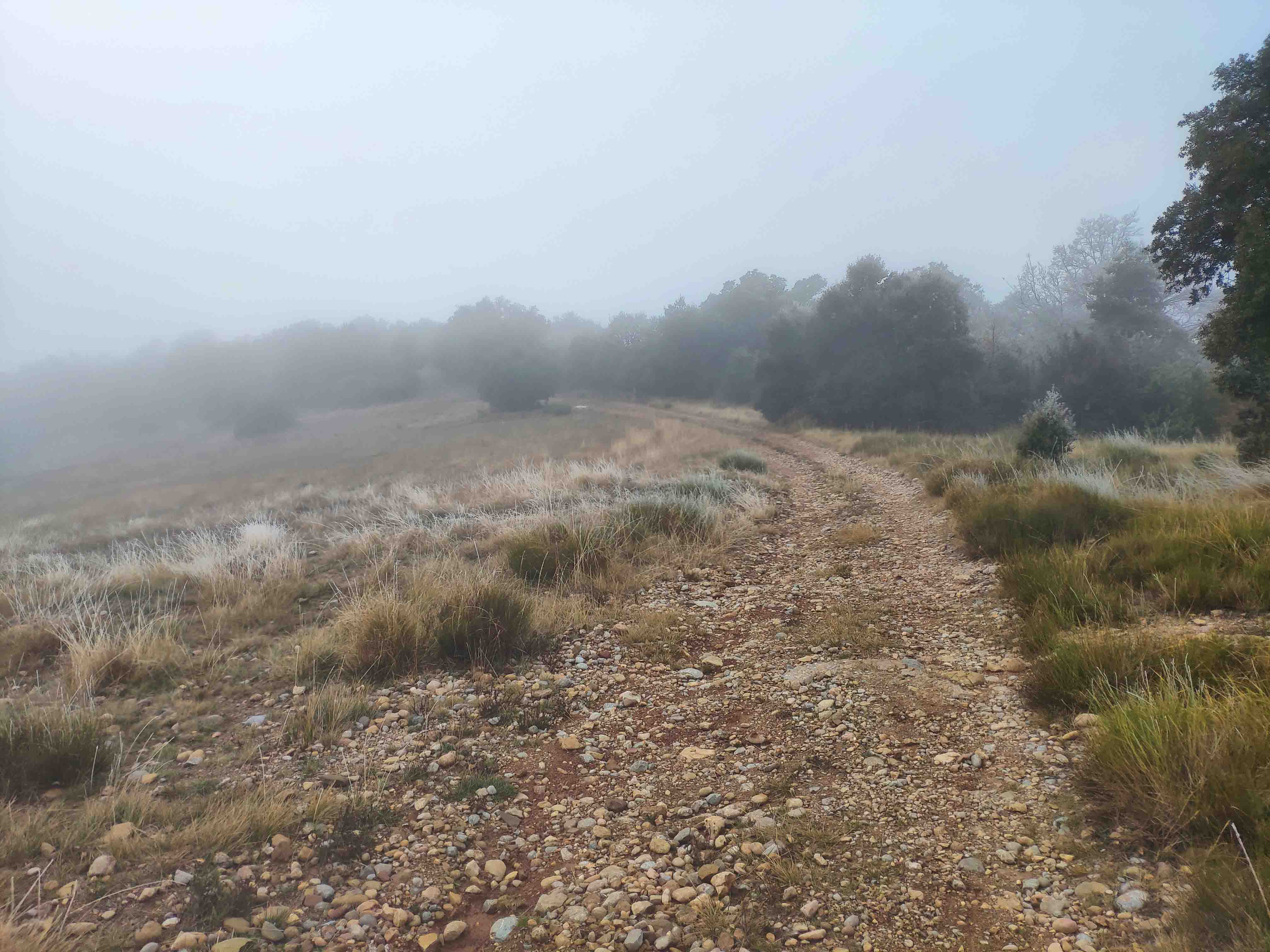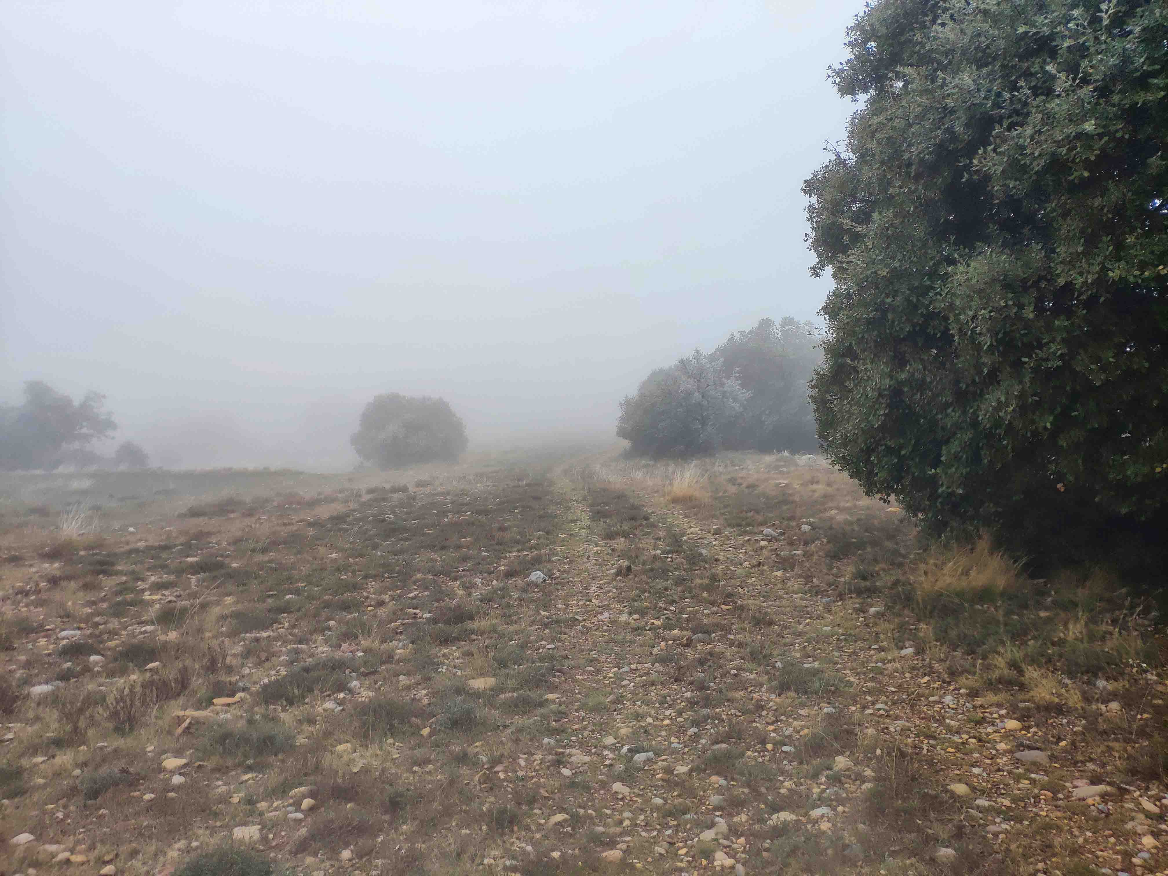 La mañana es gélida, con la niebla cubriendo totalmente la parte alta de la Serra de Benavent y prácticamente todas las cumbres que rodean la Conca Dellà, por lo que las panorámicas hoy van a estar muy reducidas. La pista va realizando sube y bajas mientras avanza hacia el norte, paralela a las paredes de Benavent, yendo en búsqueda de uno de sus pocos puntos débiles.