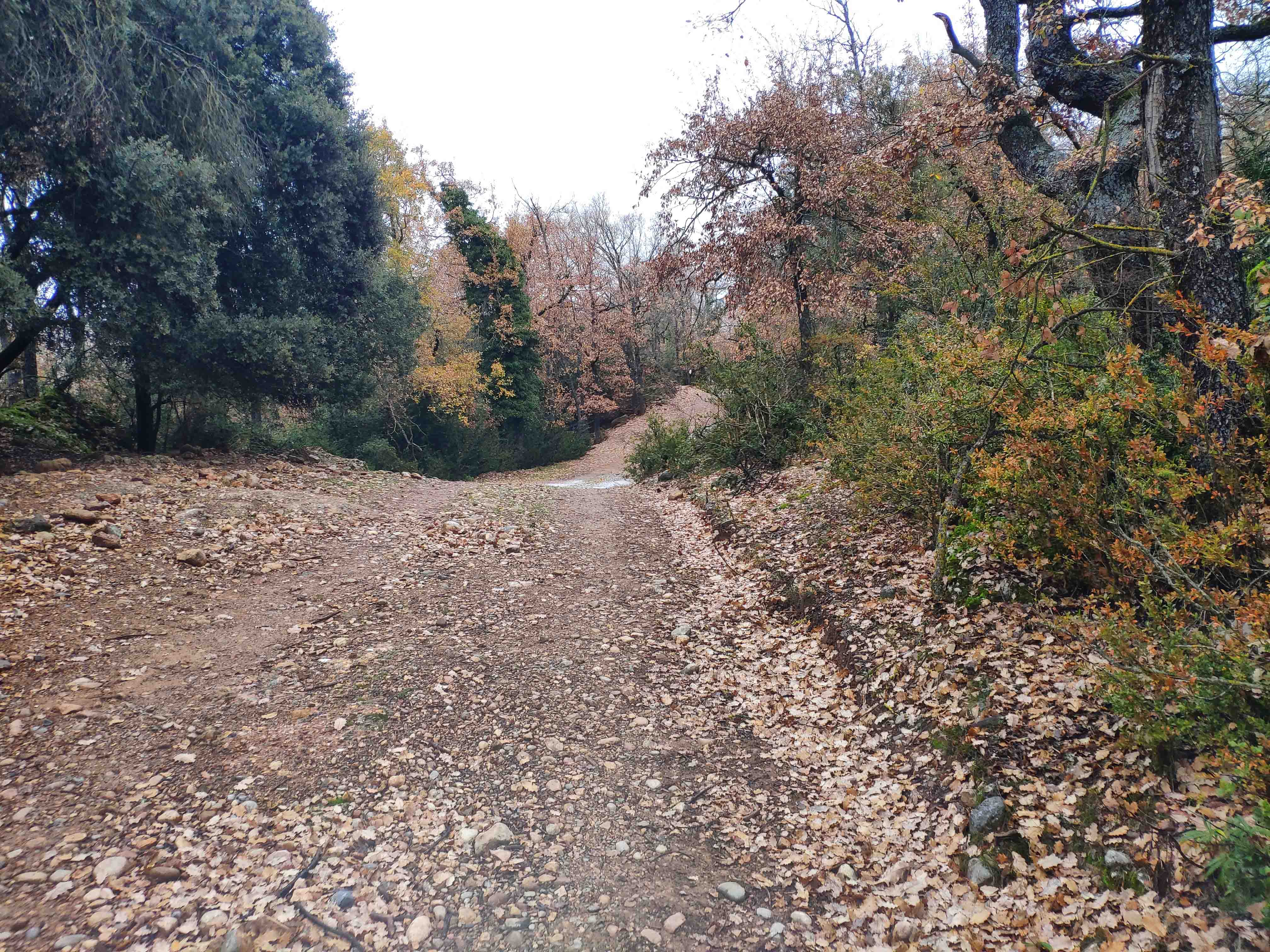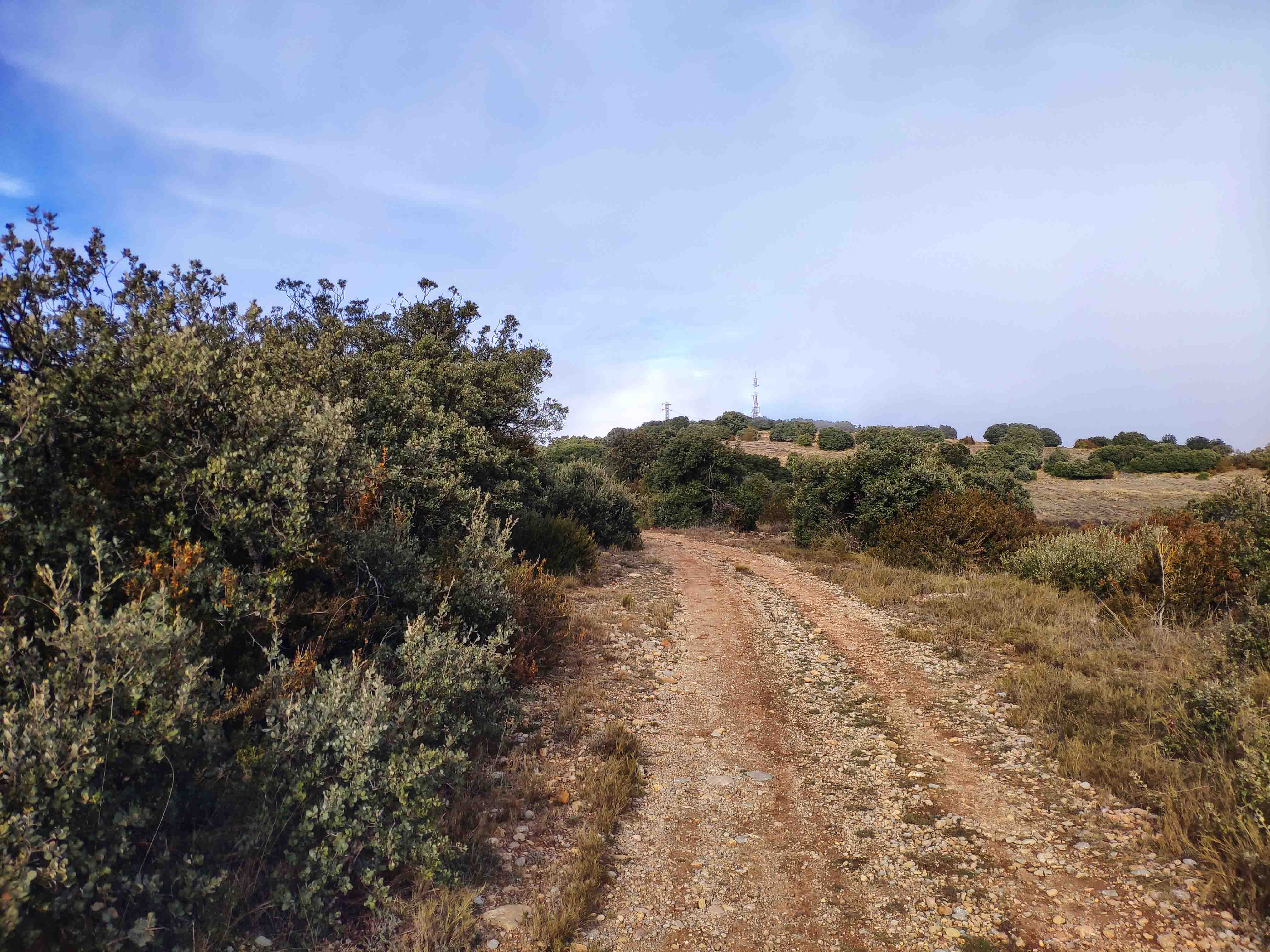 Primero por sendero y luego campo a través, subimos la colina del Serrat de la Socarrada y bajamos para llegar al siguiente collado, que es el previo a la cota máxima del Serrat del Pèl, de menor altura.