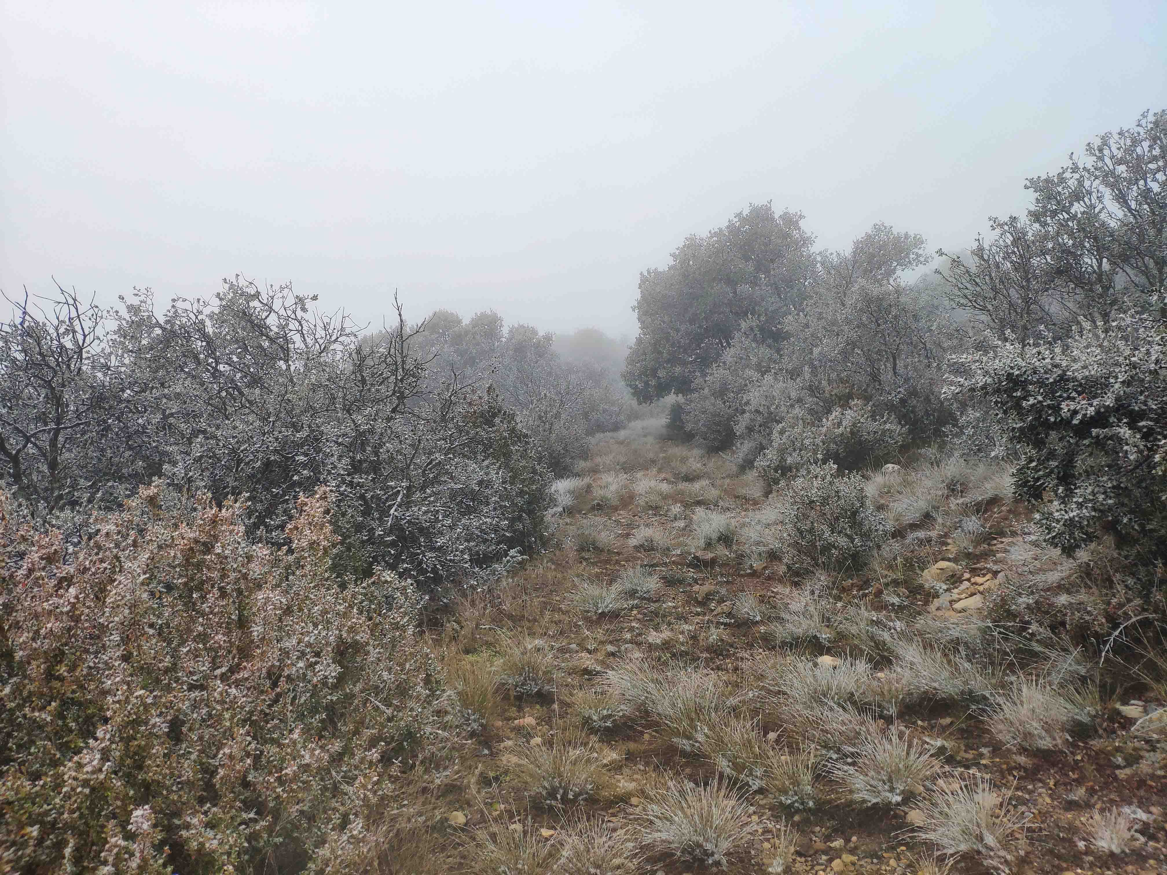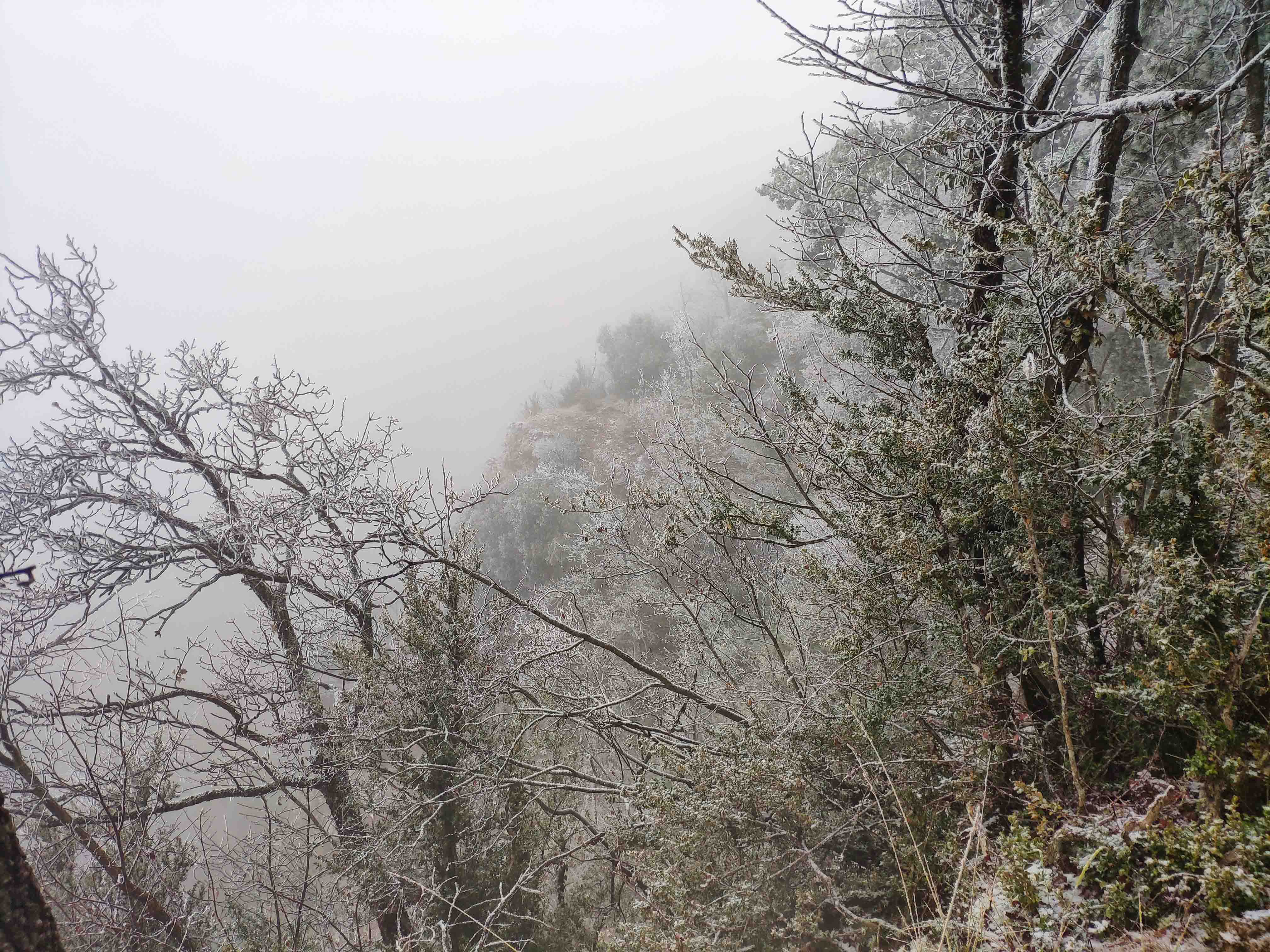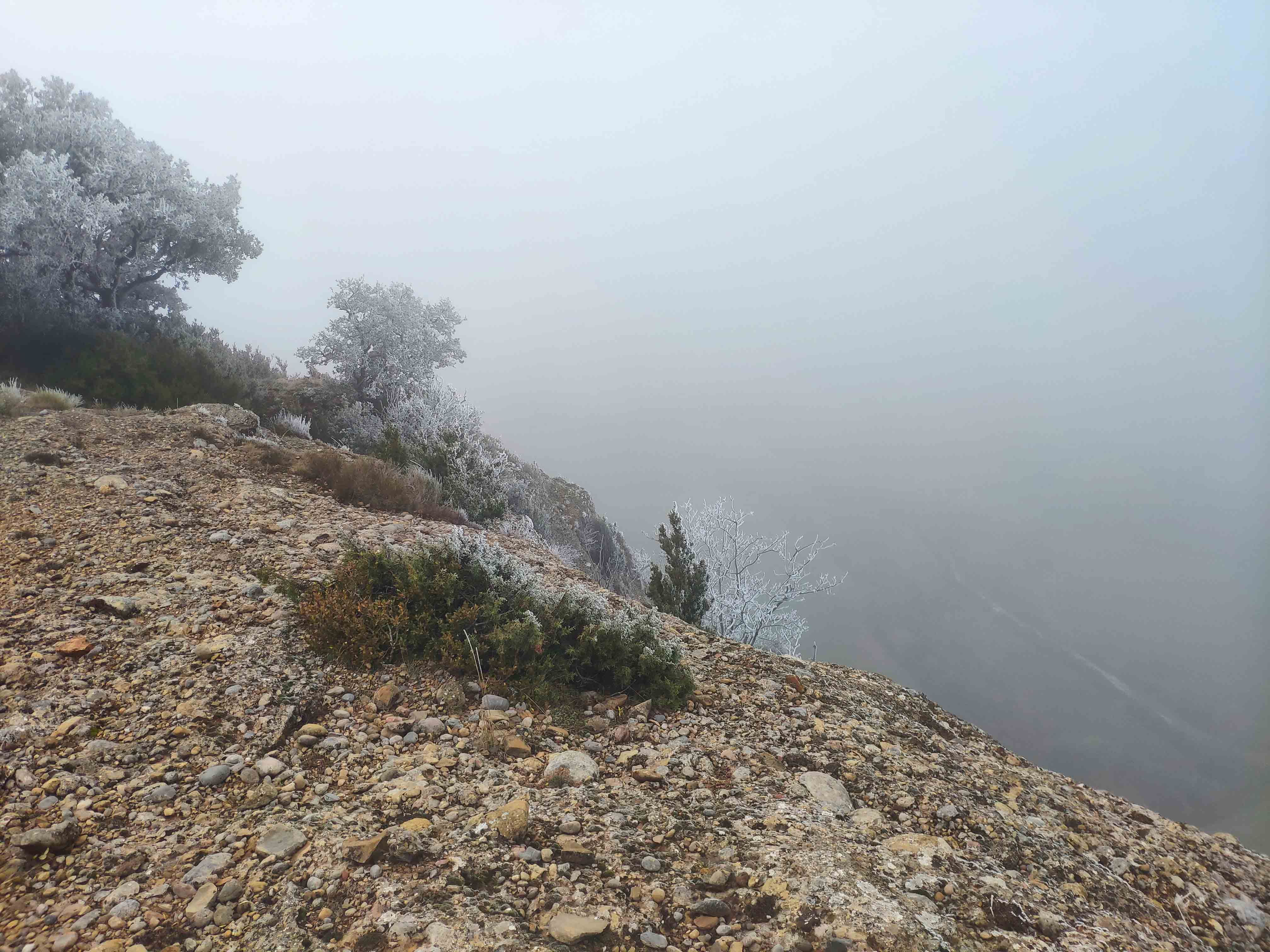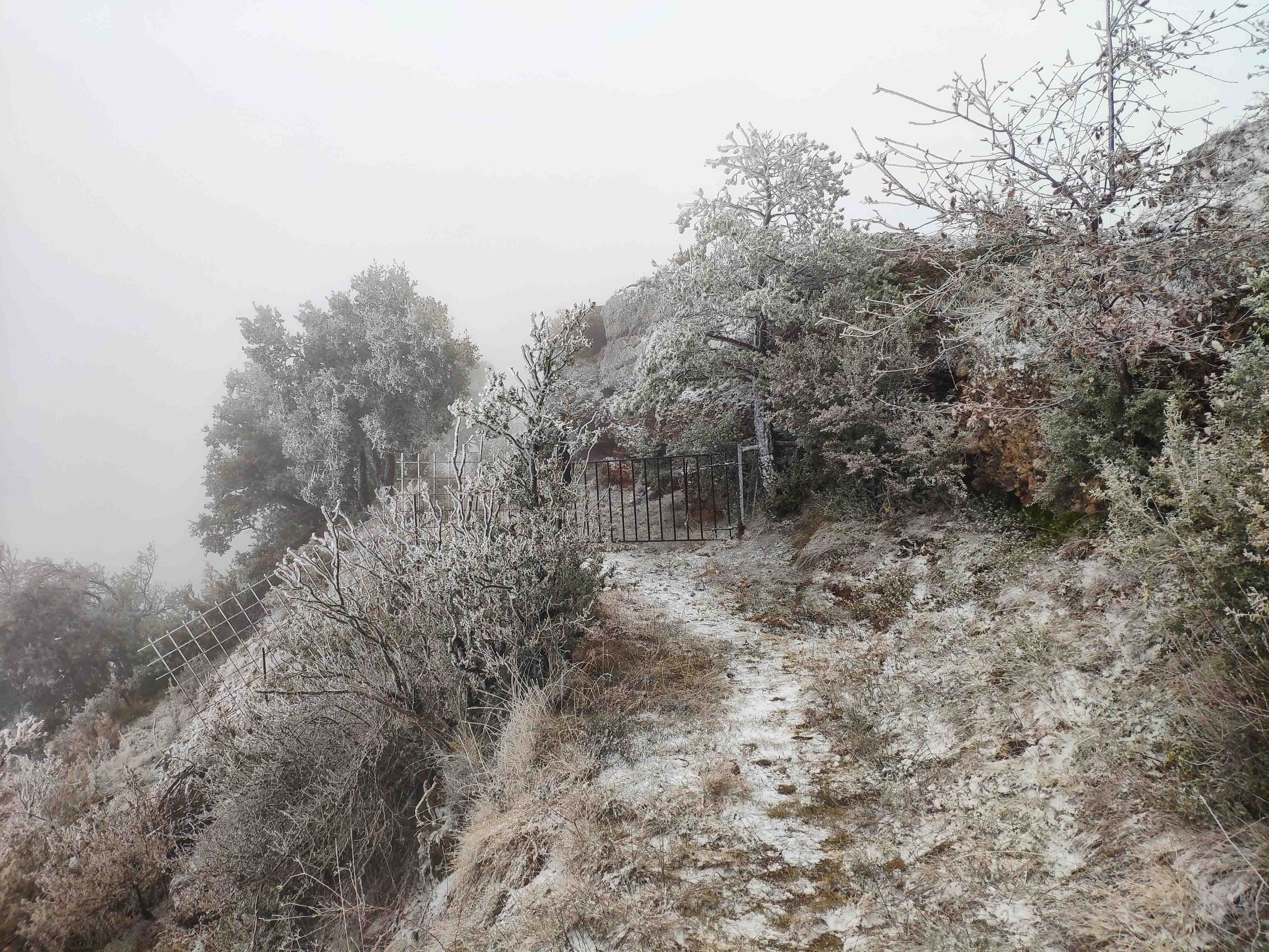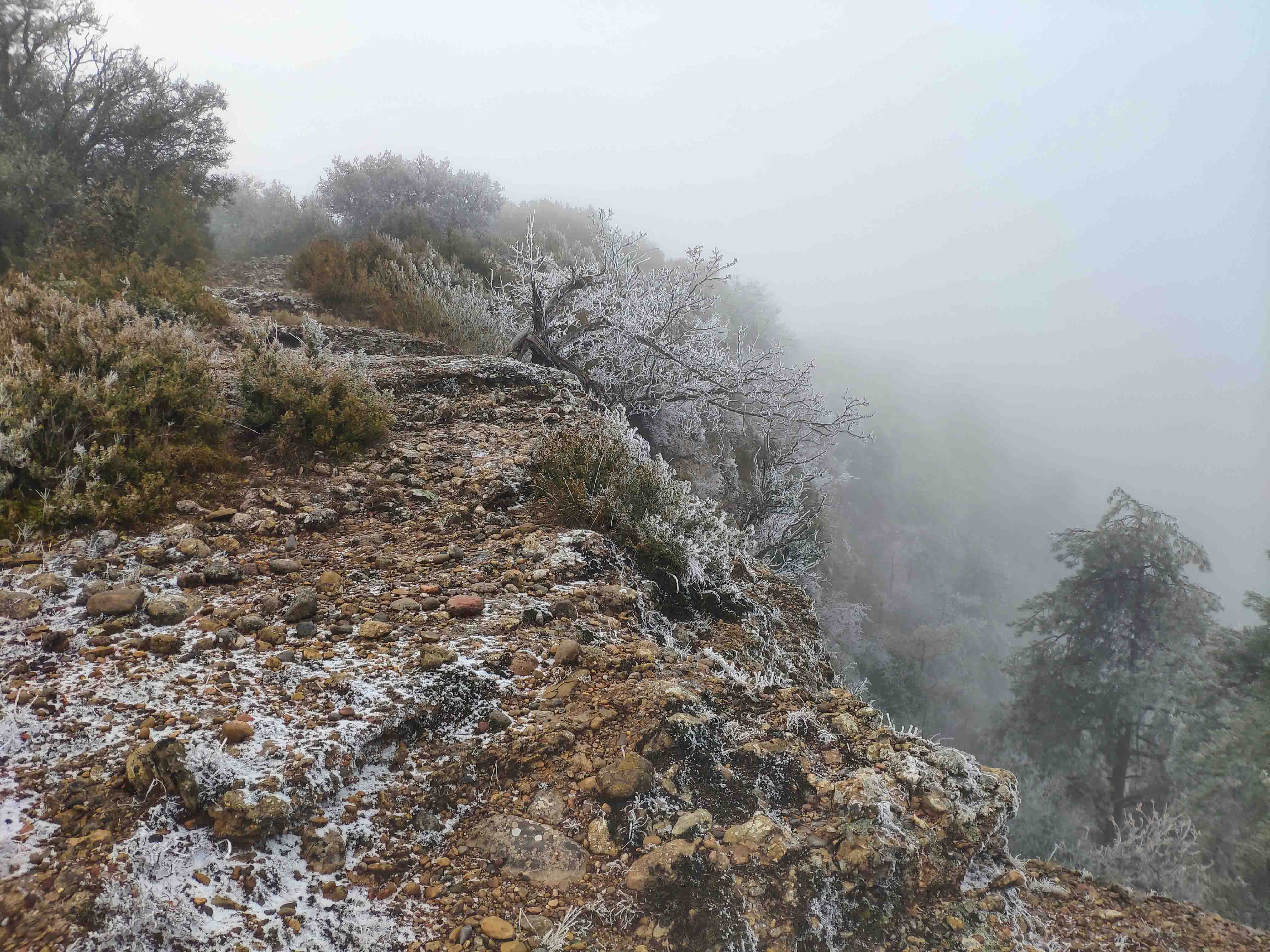 Mientras vamos ascendiendo, la helada va cobrando fuerza y los árboles y el camino se van emblanqueciendo con la escarcha. Tras llegar casi a la vertical del Grau de Moles, el camino se estrecha notablemente y empieza a hacer zigzags mientras va ganando altura más decididamente y nos vamos acercando a la pared.