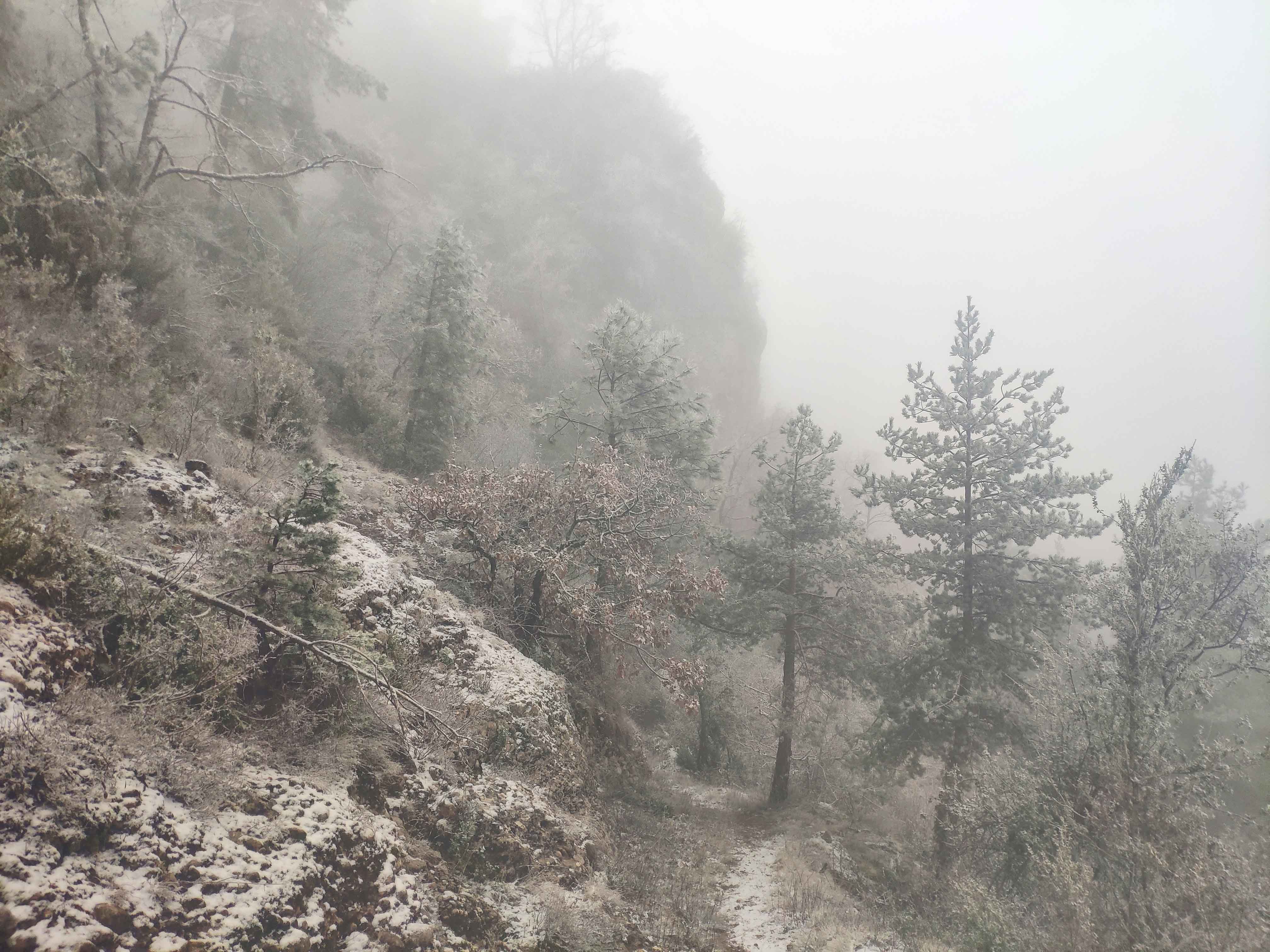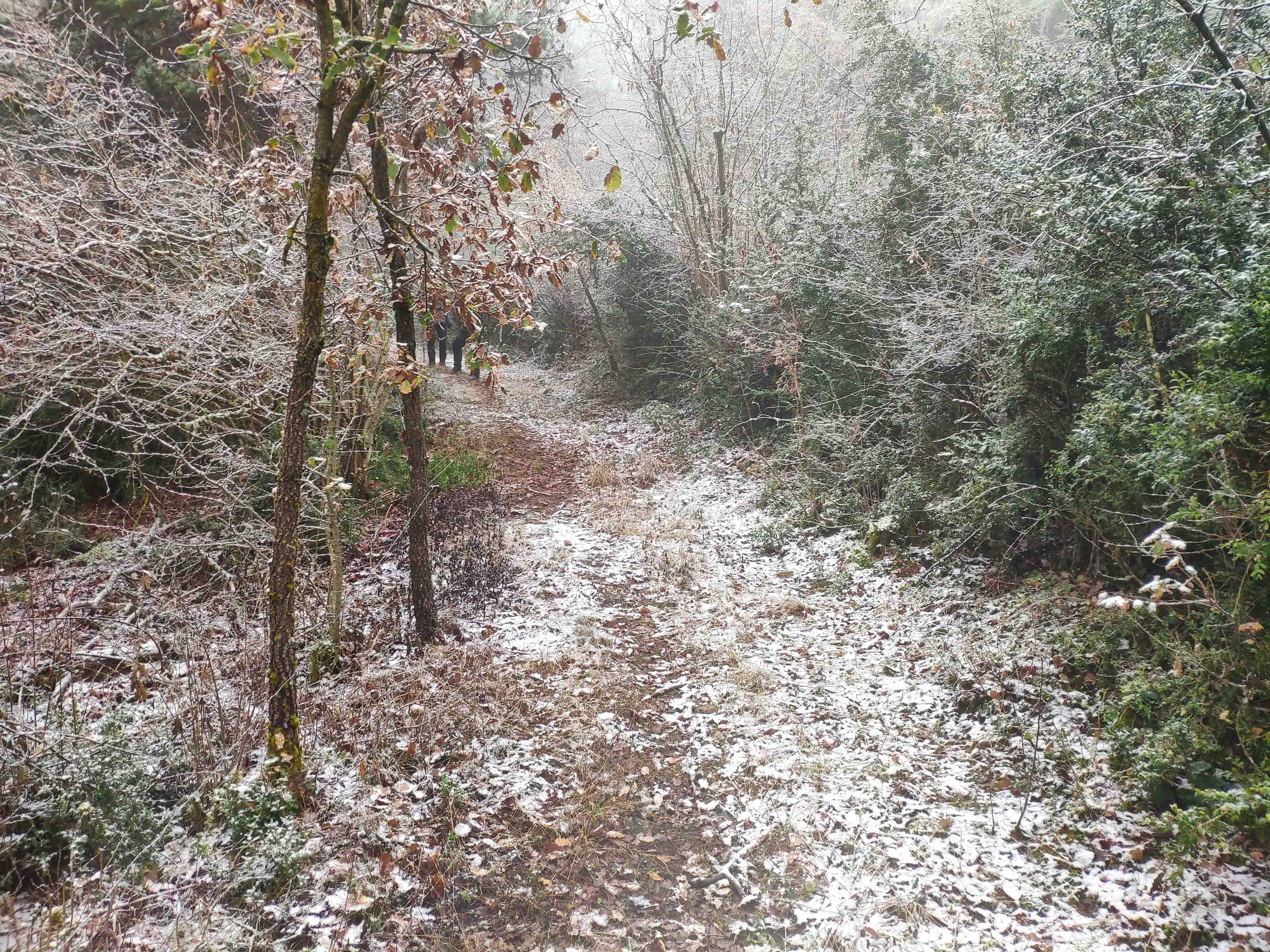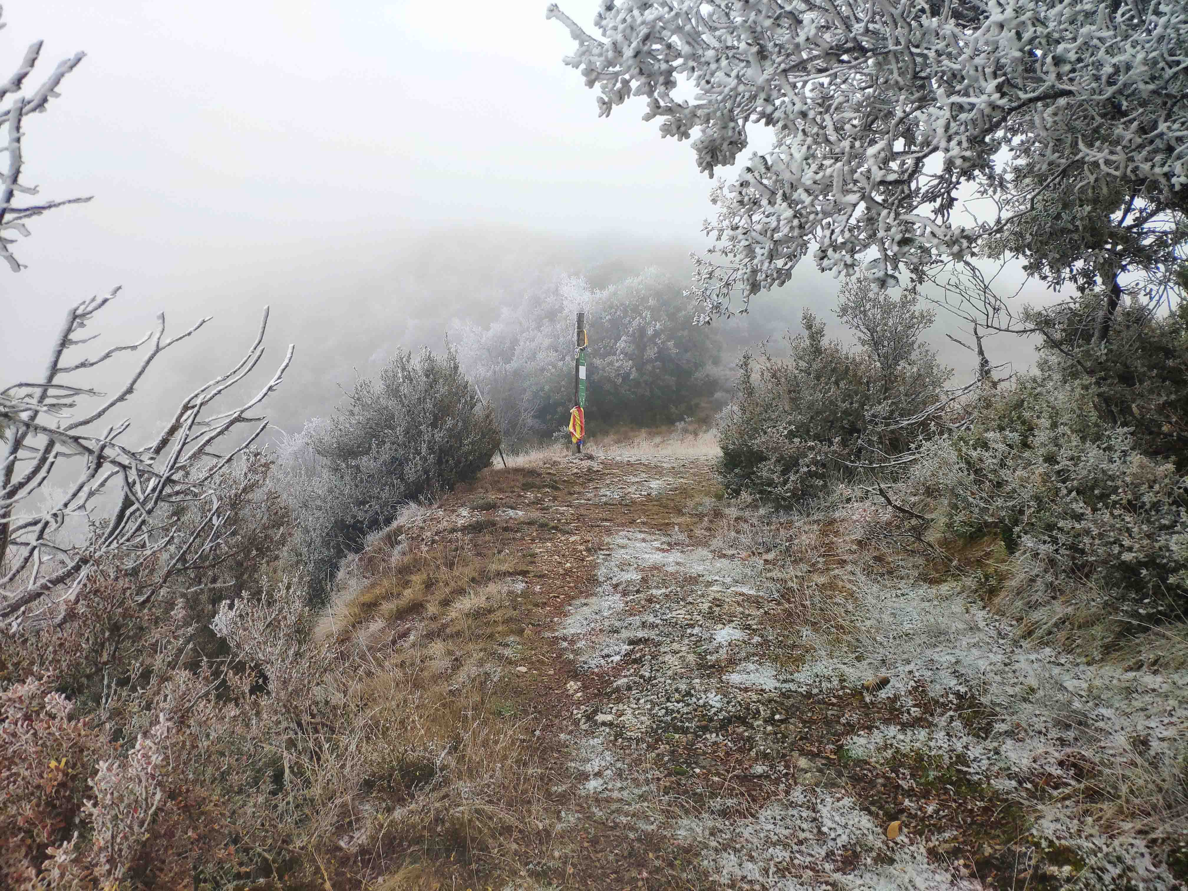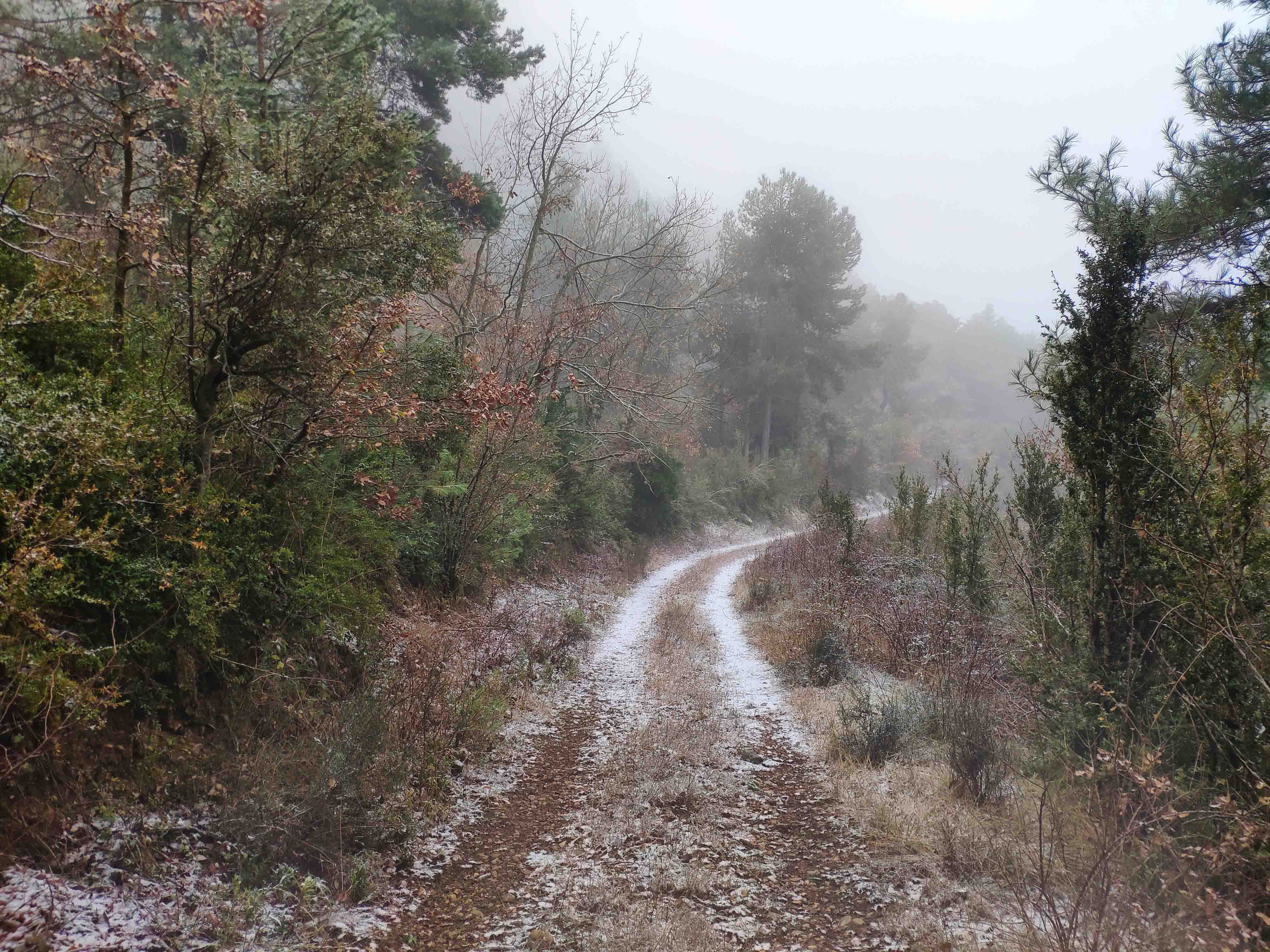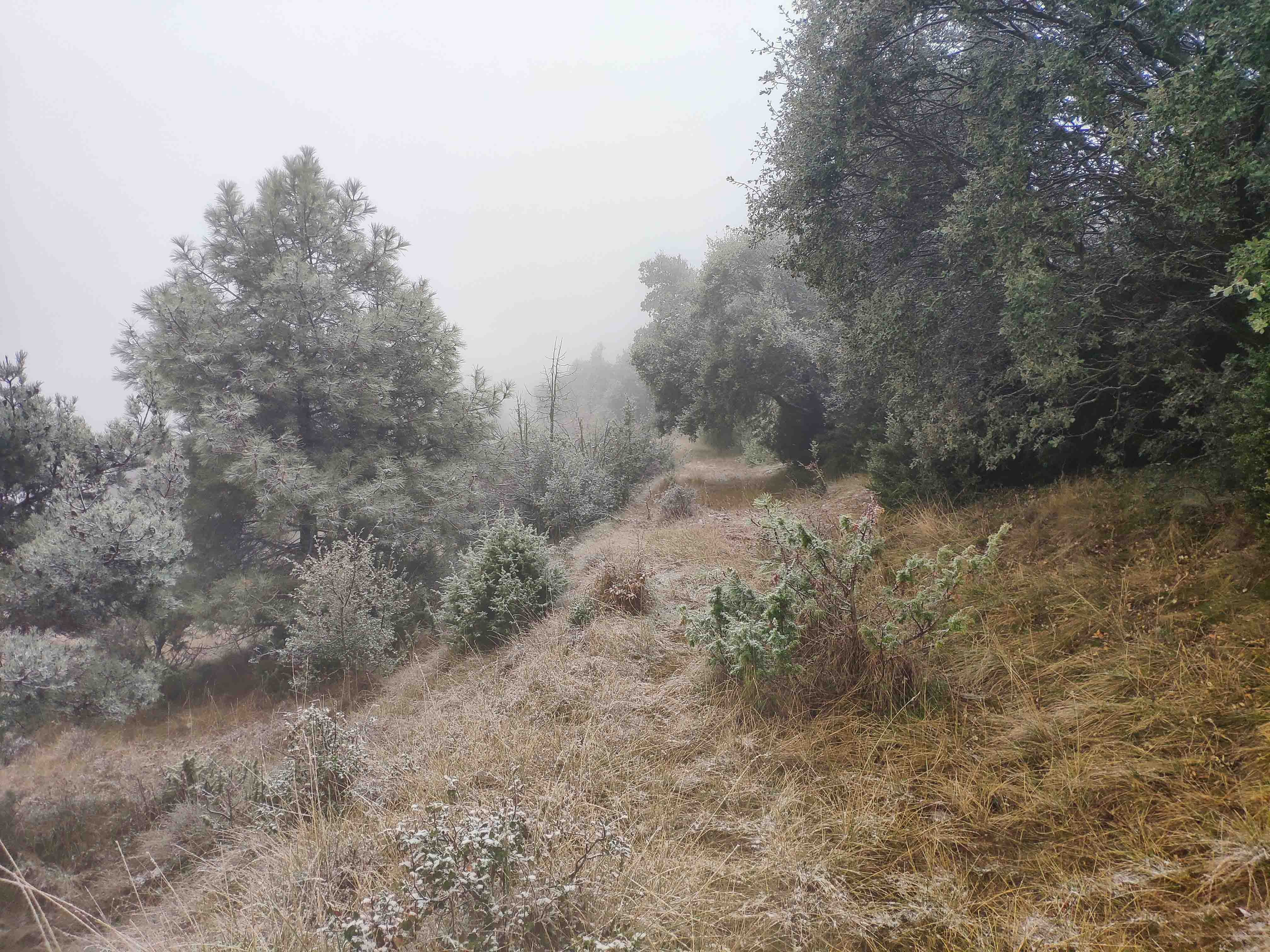 Mientras vamos ascendiendo, la helada va cobrando fuerza y los árboles y el camino se van emblanqueciendo con la escarcha. Tras llegar casi a la vertical del Grau de Moles, el camino se estrecha notablemente y empieza a hacer zigzags mientras va ganando altura más decididamente y nos vamos acercando a la pared.