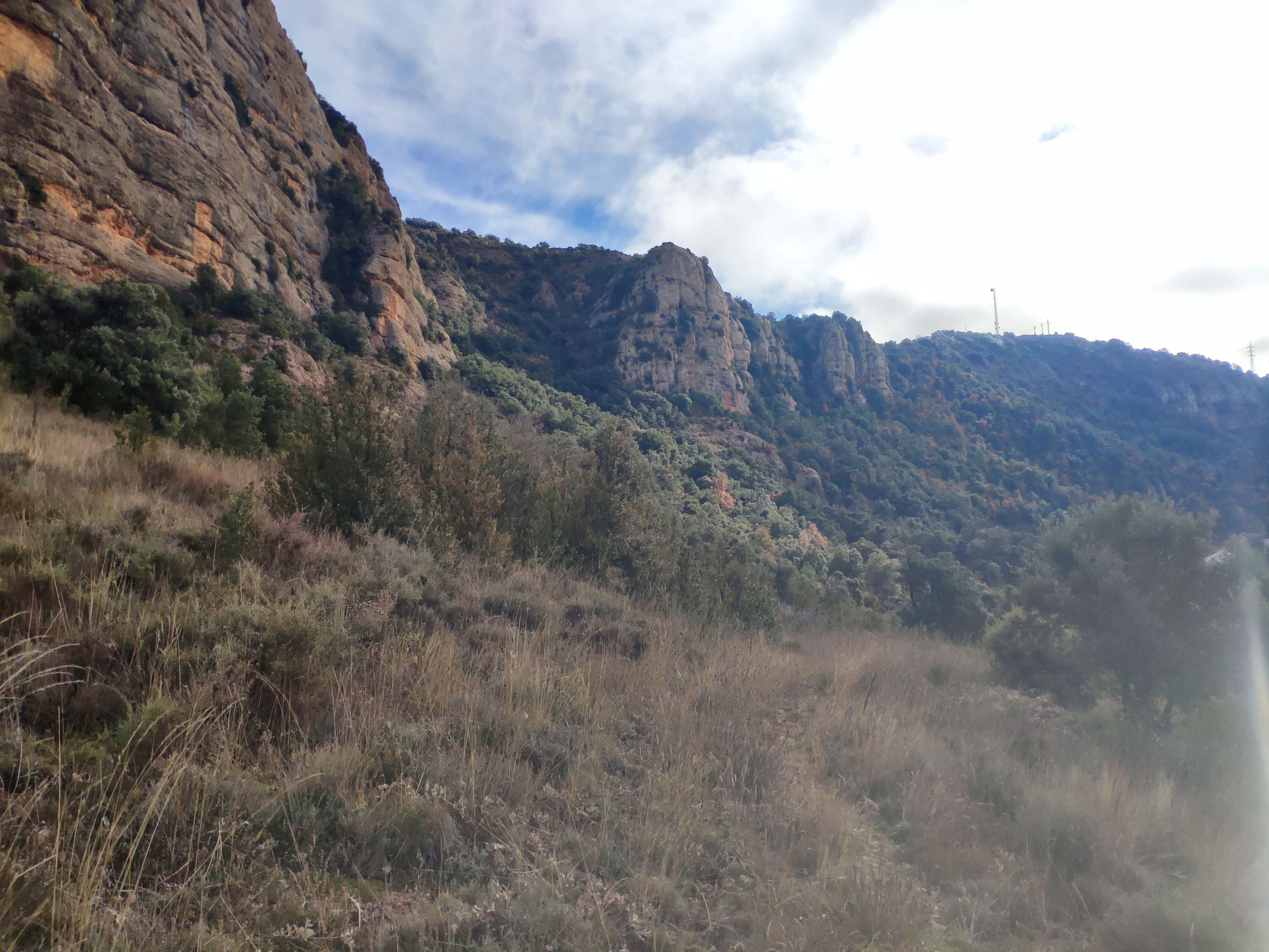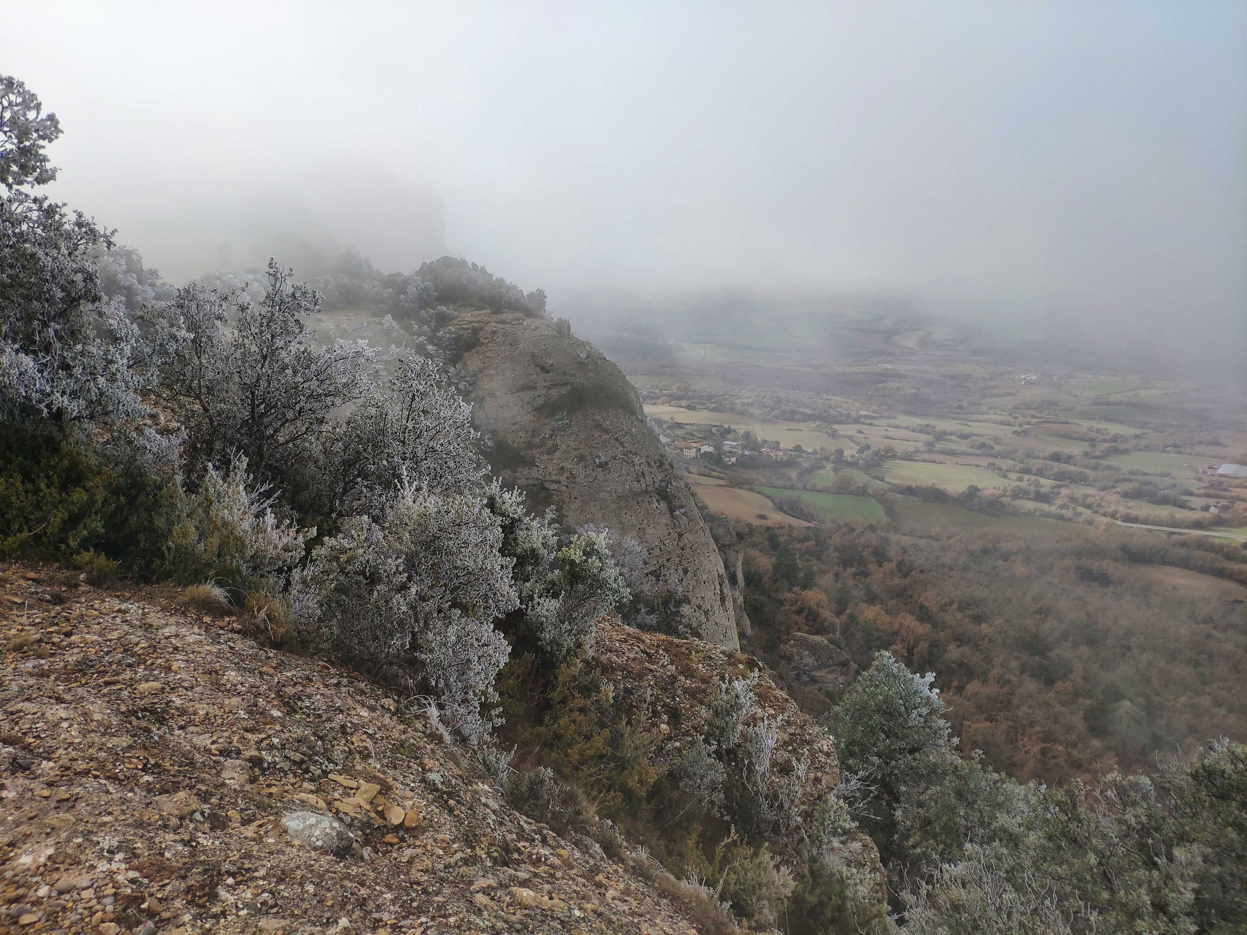 Tras superar la penúltima elevación, la que culmina el Serrat de l’Herba-Sana, nos disponemos a ascender por última vez en el día de hoy. Primero por pista y luego por un exiguo sendero que asciende pegado a la pared, primero llegamos a un bonito balcón, justo en el momento en el que la niebla se abre por primera vez de forma considerable.