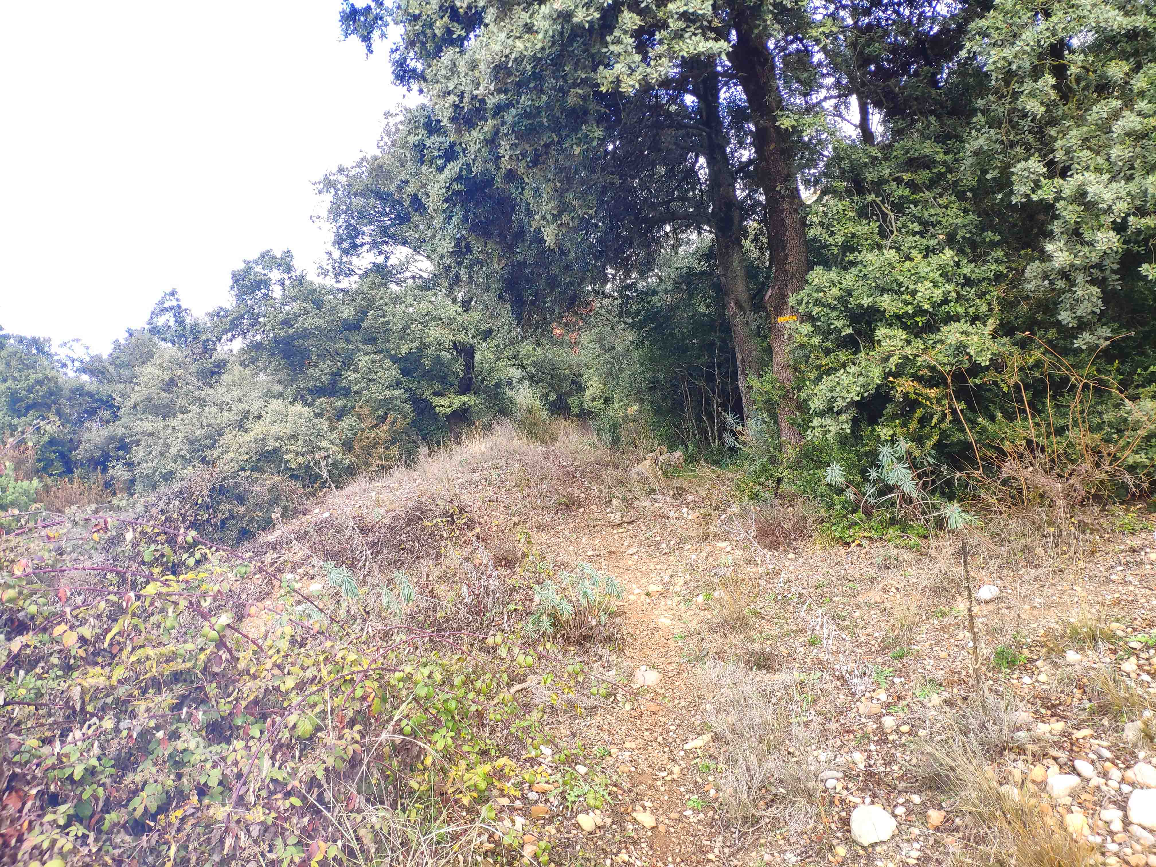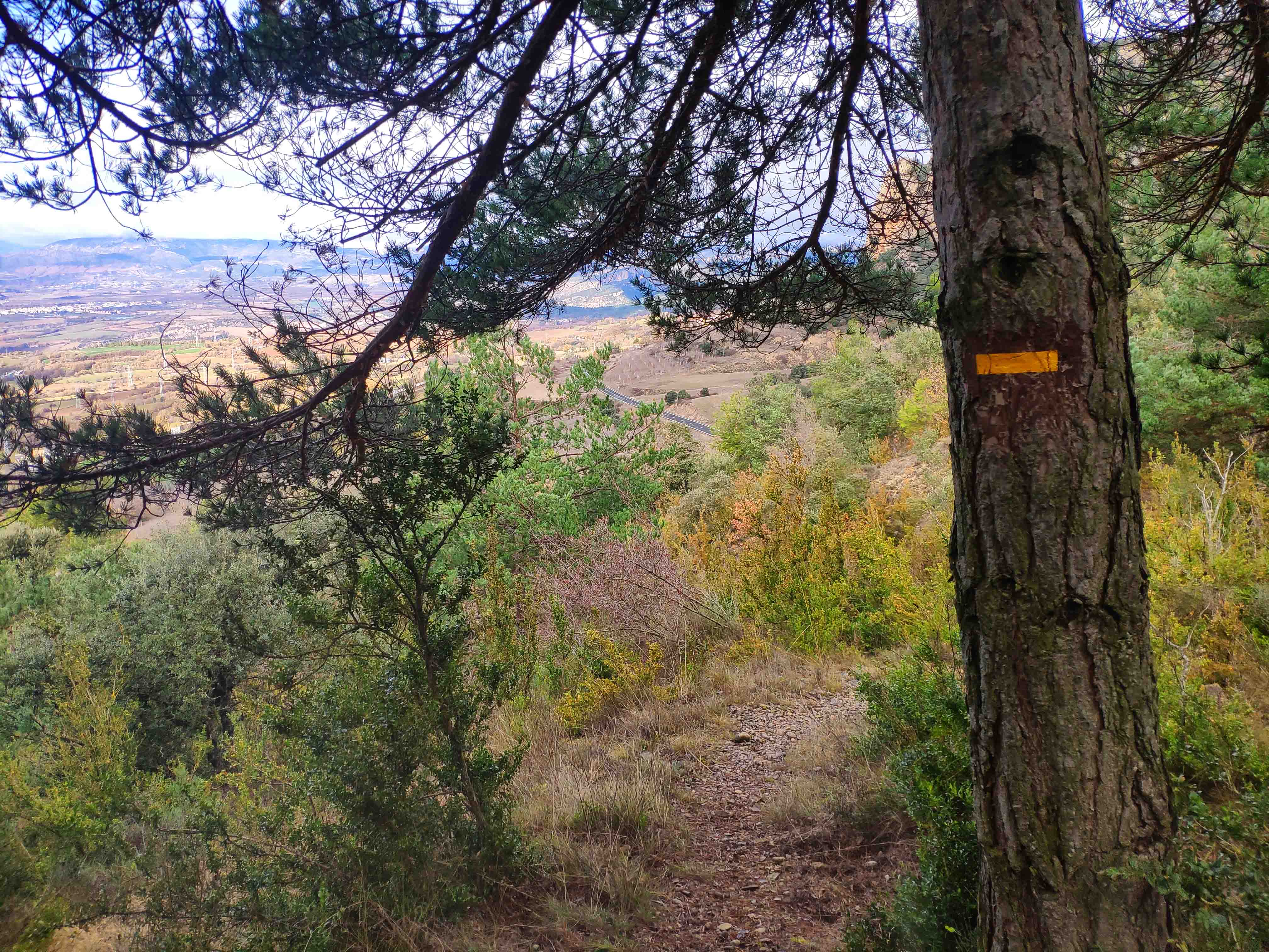 Tras pasar el tramo más vertical, el sendero baja por un bosque, donde nos encontramos con alguna señal pintada de amarillo.