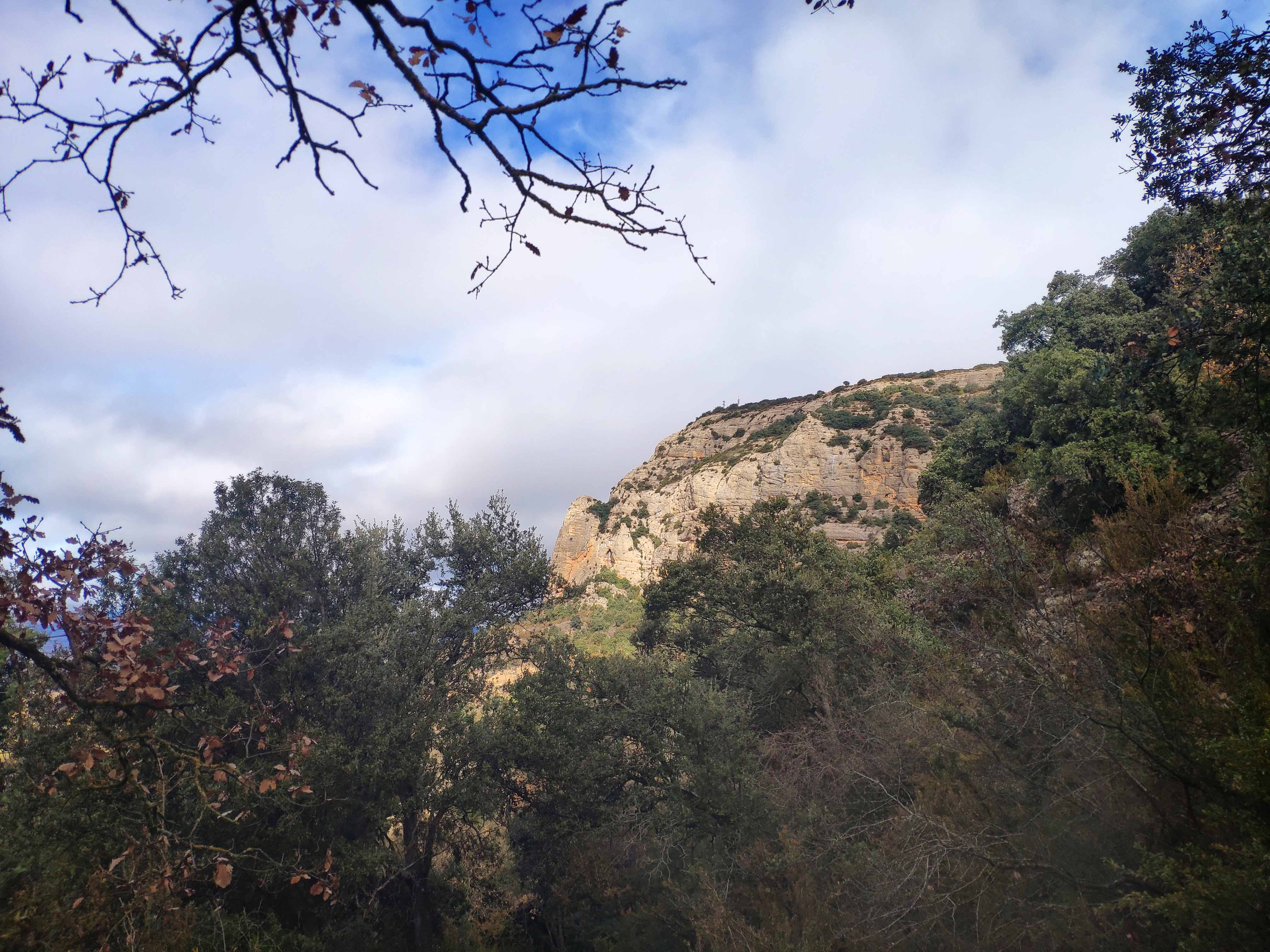 Volviendo a subir unos metros, el camino va por el bosque a cierta altura sobre los campos que tenemos a la izquierda mientras va bordeando las grandes paredes del Roc de Benavent.