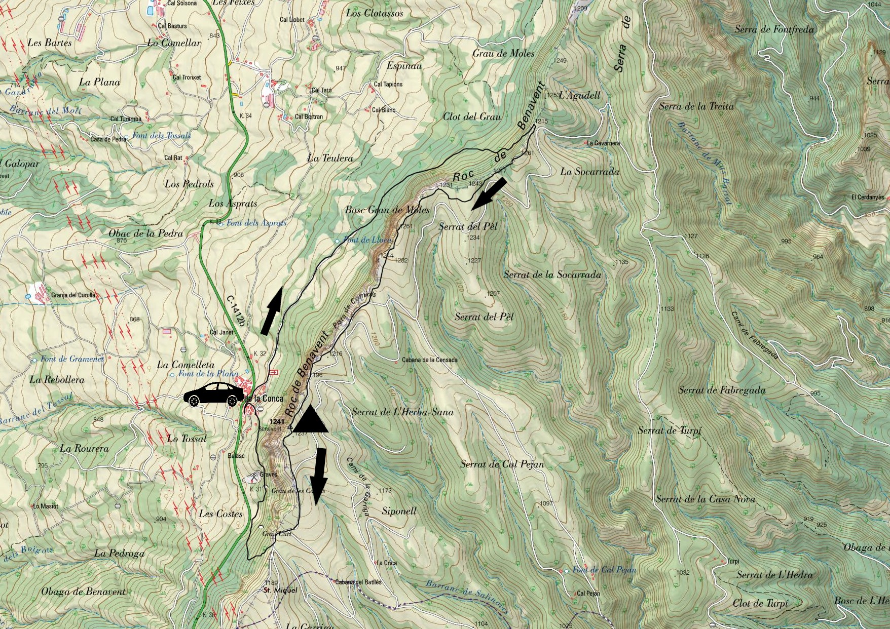 La mayor de las tres cuencas del Pallars Jussà, la Conca Dellà, está delimitada por distintas sierras en tres de sus puntos cardinales ya que hacia el oeste se encuentra el valle de la Noguera Pallaresa. Al sur se alza, gigantesco, el Montsec de Rúbies, al norte el gran Sant Corneli ejerce de avanzadilla de la afilada Serra de Carreu, mientras que al este se encuentra una sierra con mucho menor prominencia e importancia pero que se encuentra protegida por una alta pared en casi toda su longitud. Este cordal recibe varios nombres según avanza de sur a norte pero sin duda el sector más destacado y transitado es el más cercano al importante Coll de Comiols, principal escape de la Conca Dellà. Este sector recibe el nombre de Roc de Benavent por el poblado homónimo que se encuentra en la vertical de su cumbre más imponente y destacada (pero no más alta), la Roca Roja de Benavent, paraíso de los escaladores gracias a su frontón vertical y rojizo de más de 200 metros de verticalidad. Esta sierra solo se ve rota en contadas ocasiones por los graus, pasos que permiten acceder al amable cordal y transitar por sus panorámicas alturas. En esta ocasión, recorreremos la totalidad del Roc de Benavent, subiendo a la sierra por el Grau de Moles y descendiendo por el Grau Curt.
