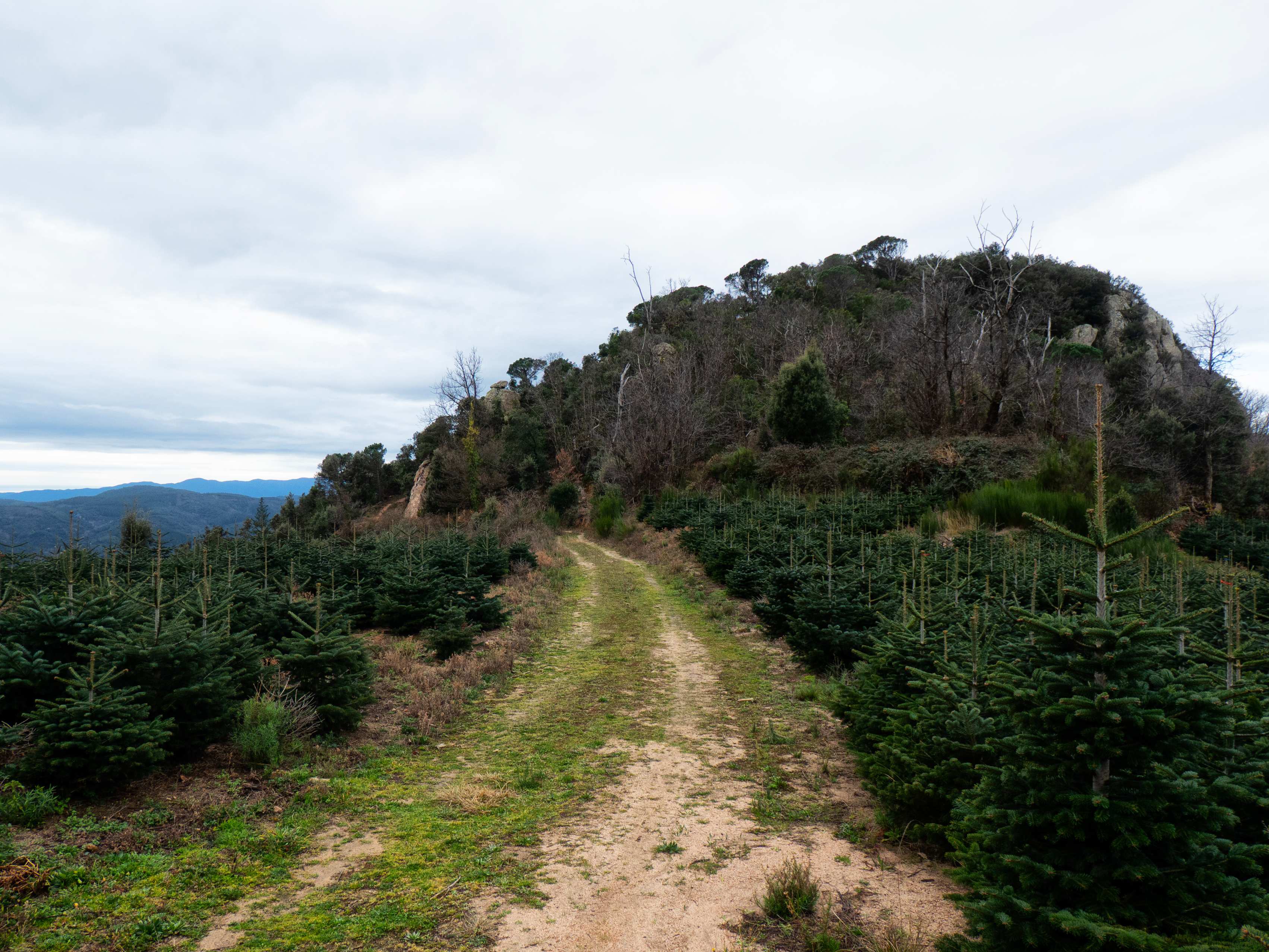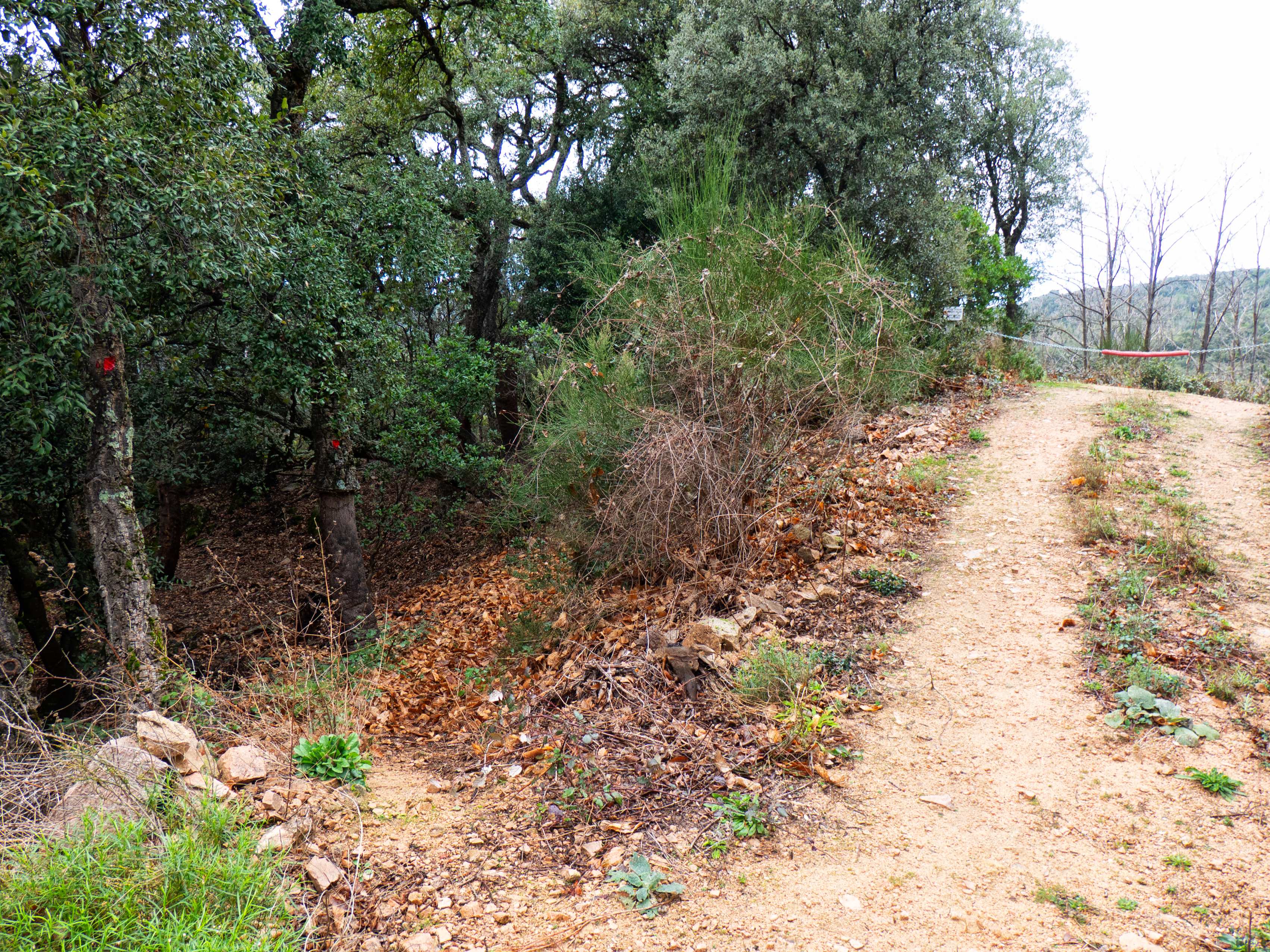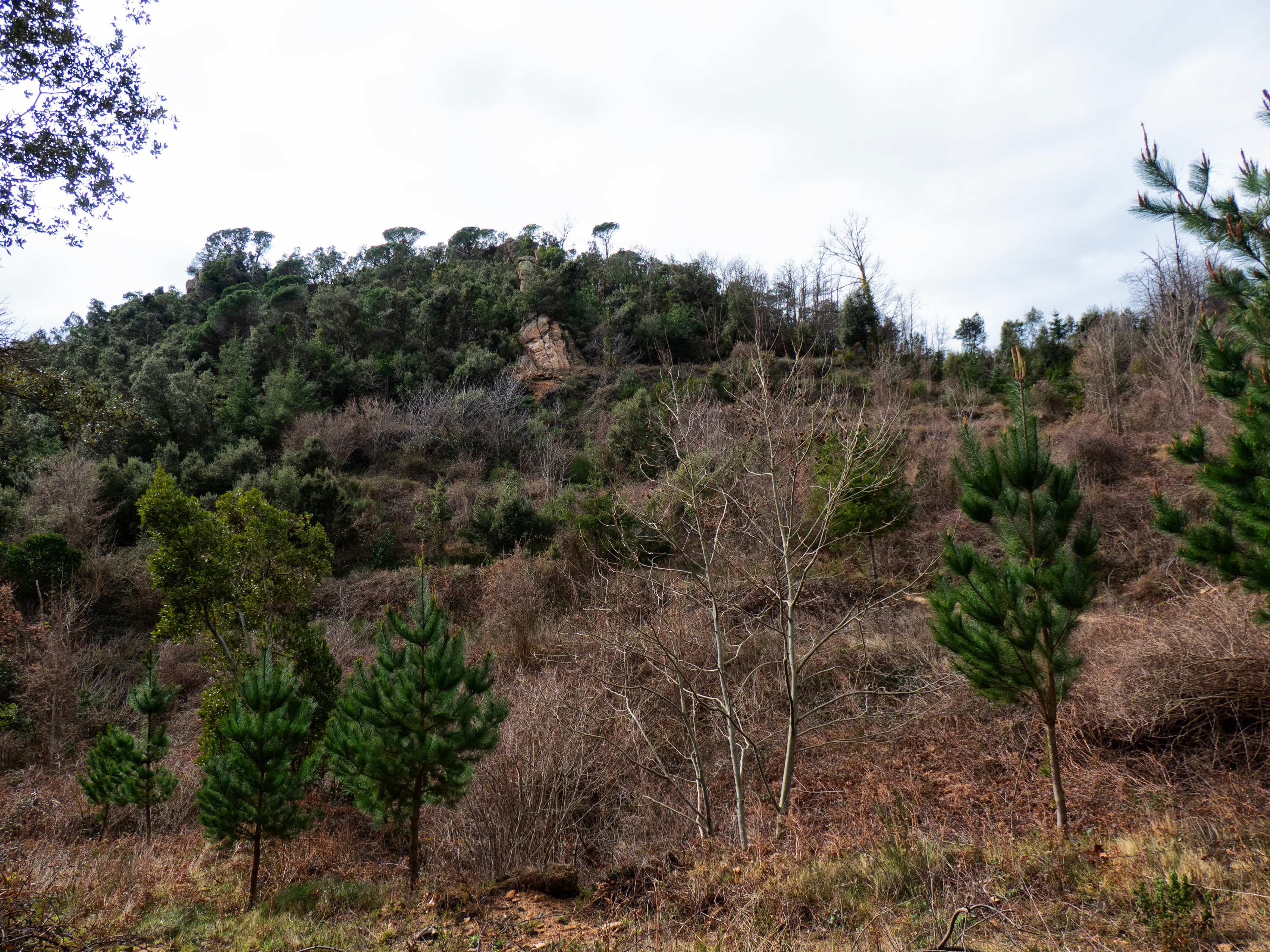 Entre el follaje de la cumbre, vislumbramos nuevamente el collado norte de les Roques del Rei, de donde venimos, y dos colinas detrás de Cal Cigala. La de la derecha, que recibe el nombre de Goteres, es la más alta del sector y, para alargar un poco la excursión, decidimos visitarla.