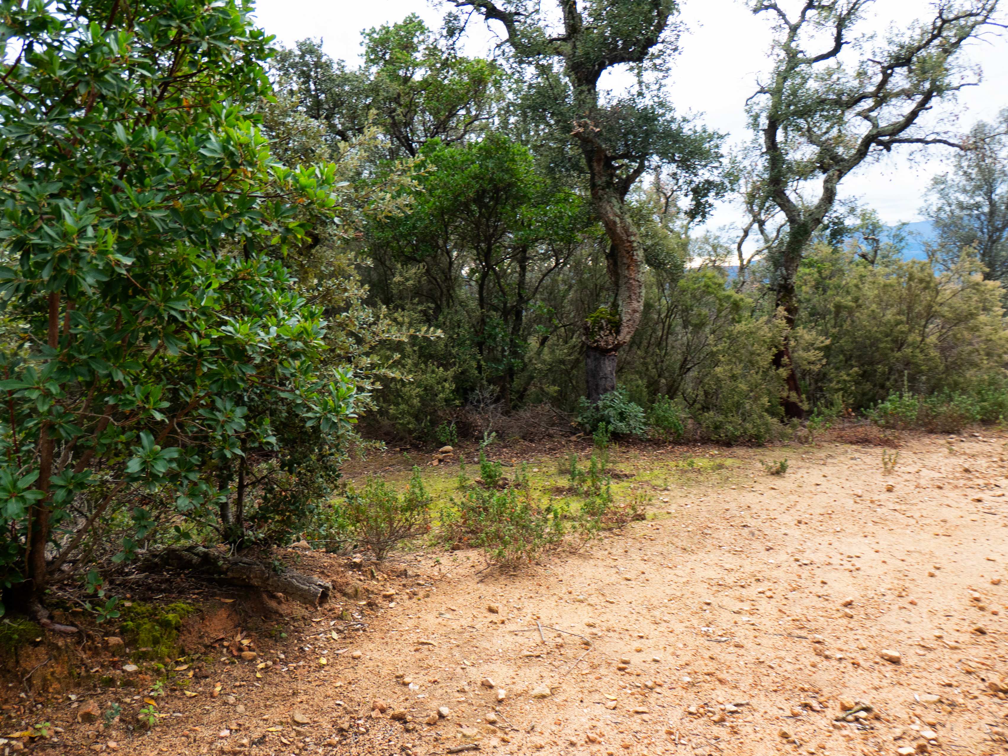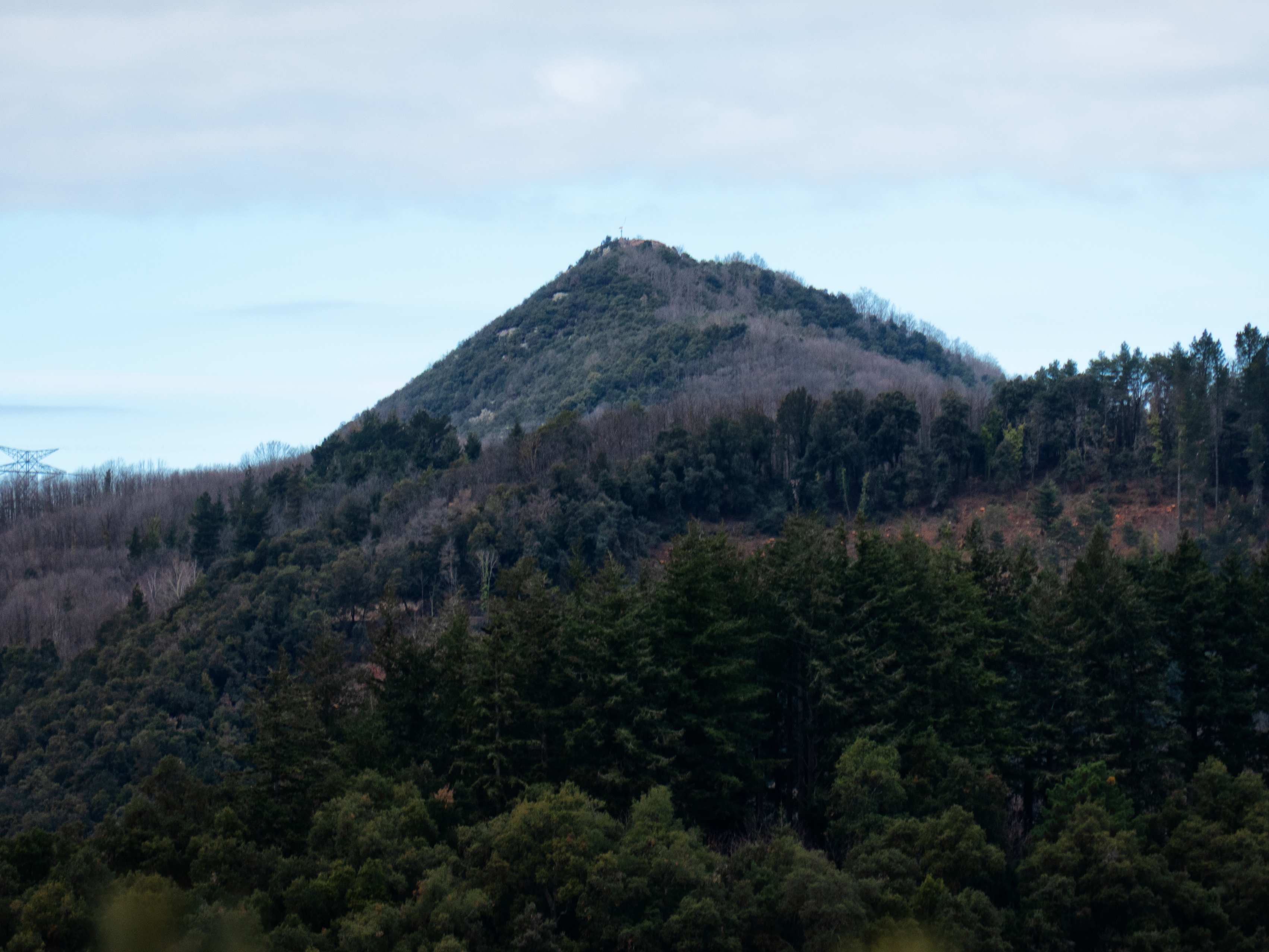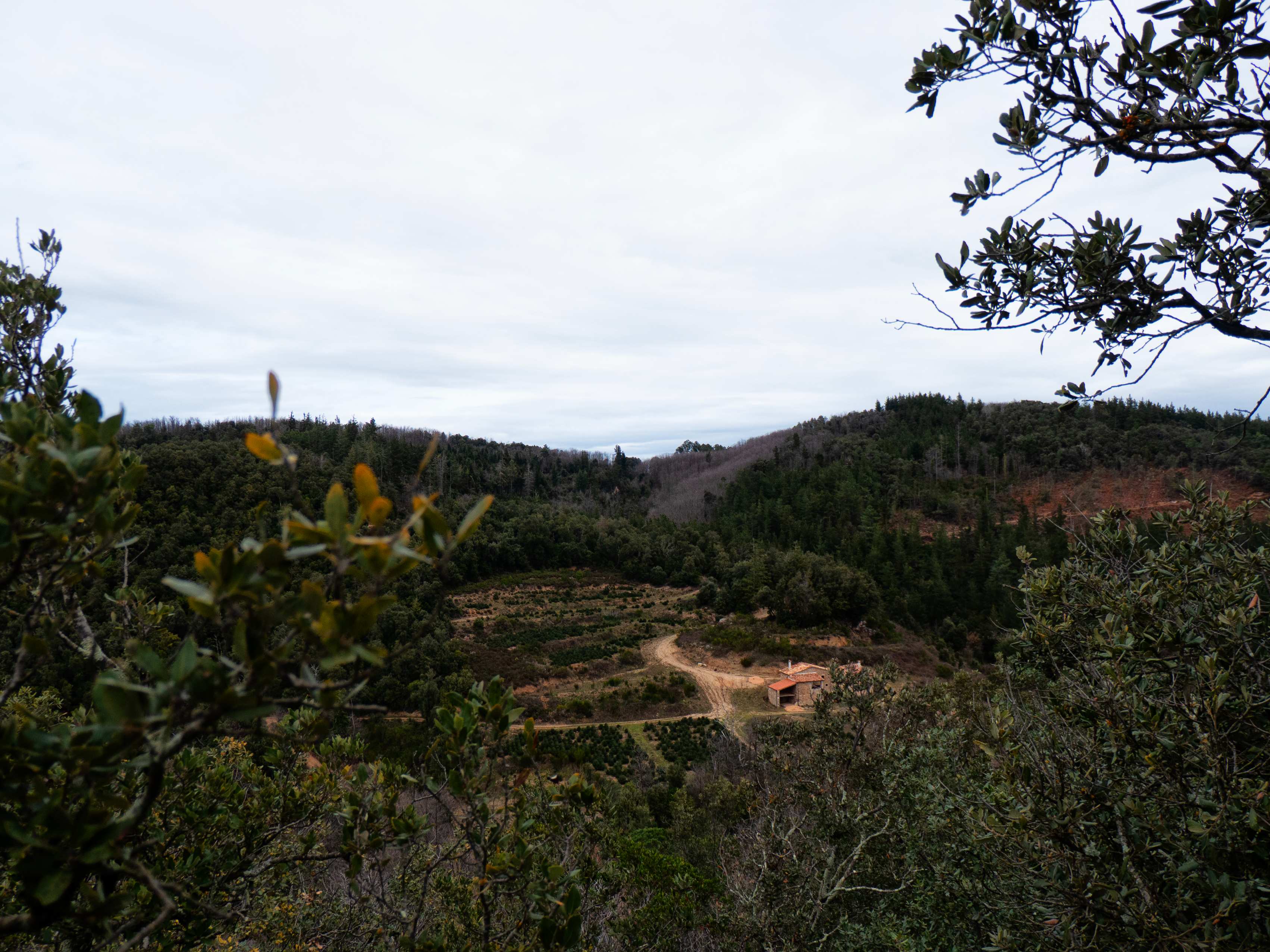 Entre el follaje de la cumbre, vislumbramos nuevamente el collado norte de les Roques del Rei, de donde venimos, y dos colinas detrás de Cal Cigala. La de la derecha, que recibe el nombre de Goteres, es la más alta del sector y, para alargar un poco la excursión, decidimos visitarla.