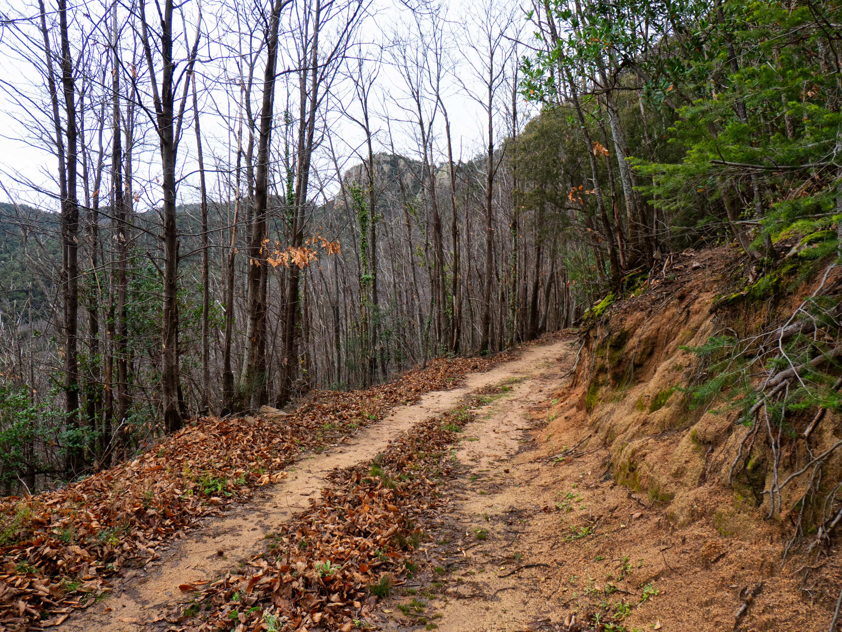 Tras volver a la pista, giramos ahora hacia el norte, donde ya asoman, entre los desnudos troncos de haya, los riscos de les Roques del Rei. A partir de aquí, la pendiente de la pista se acentúa notablemente, en lo que será la subida más intensa del día.