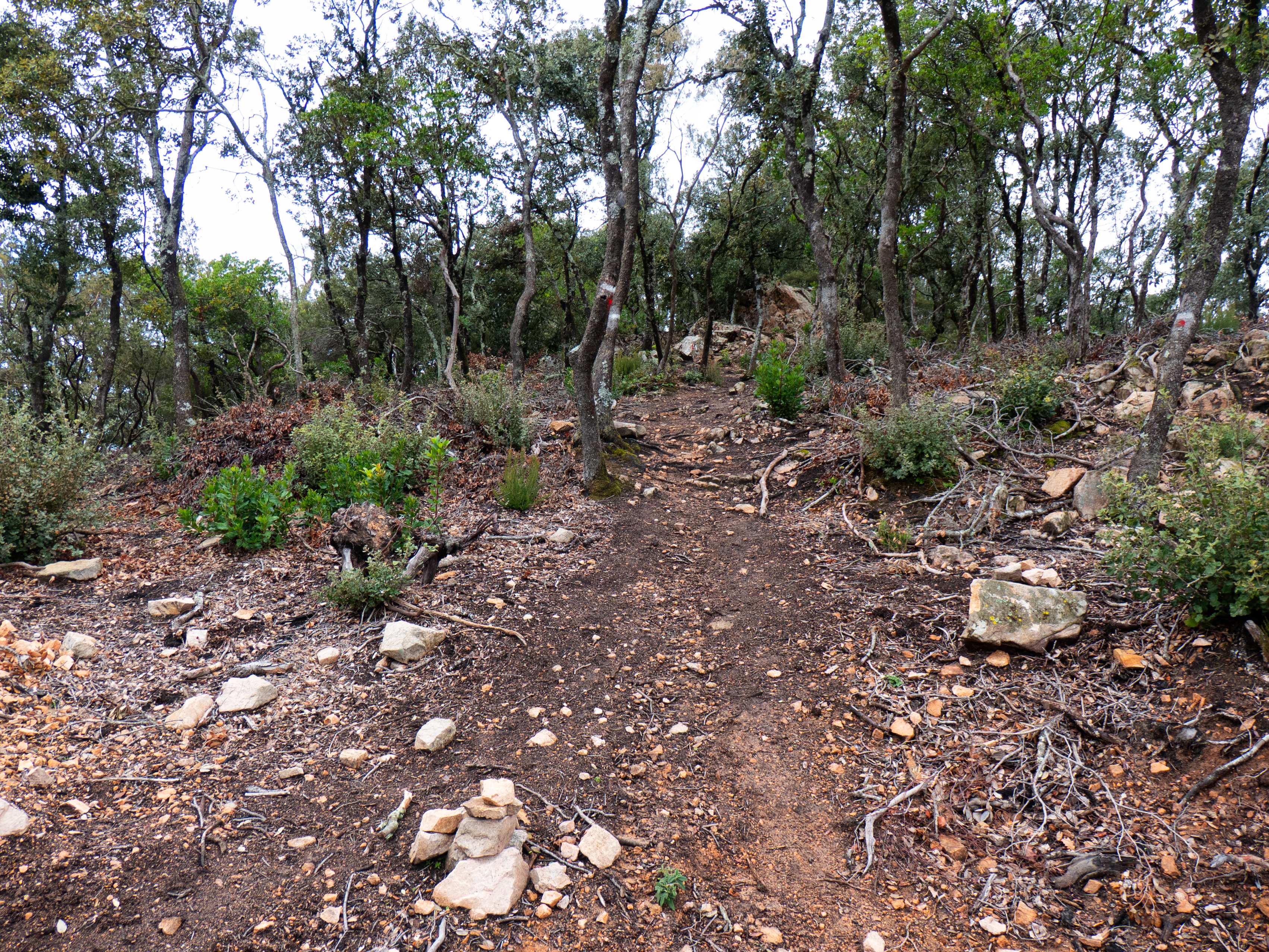Al llegar al collado norte del Puig Rodó, tomamos un desvío a la izquierda para iniciar un fuerte descenso, bordeando esta cima por su vertiente sur.